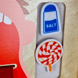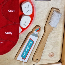 - Kustīga mēle ar garšu zonām; pārtikas elementi ar lipekli; zobu birste, pasta, zobu diegs