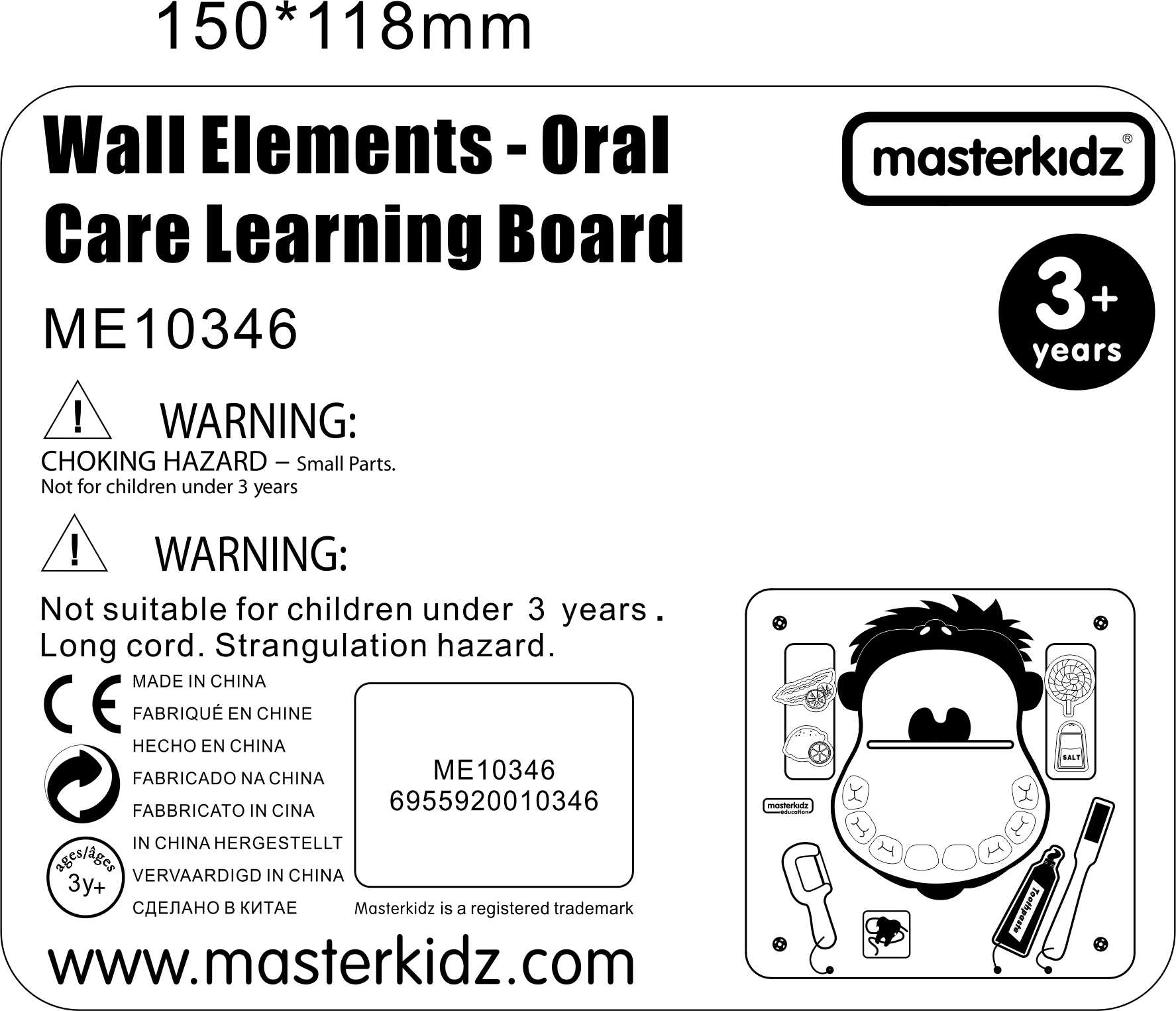 Izklaidējoša un izglītojoša Masterkidz sienas tabule palīdz bērniem apgūt pareizu mutes un zobu higiēnu. Tā māca pareizi tīrīt zobus, lietot zobu diegu un atpazīt pamatgaršas (salds, sāļš, skābs un rūgts). Izturīgā koka konstrukcija ir ideāli piemērota bērnudārziem, bērnu stūrīšiem un mājām.