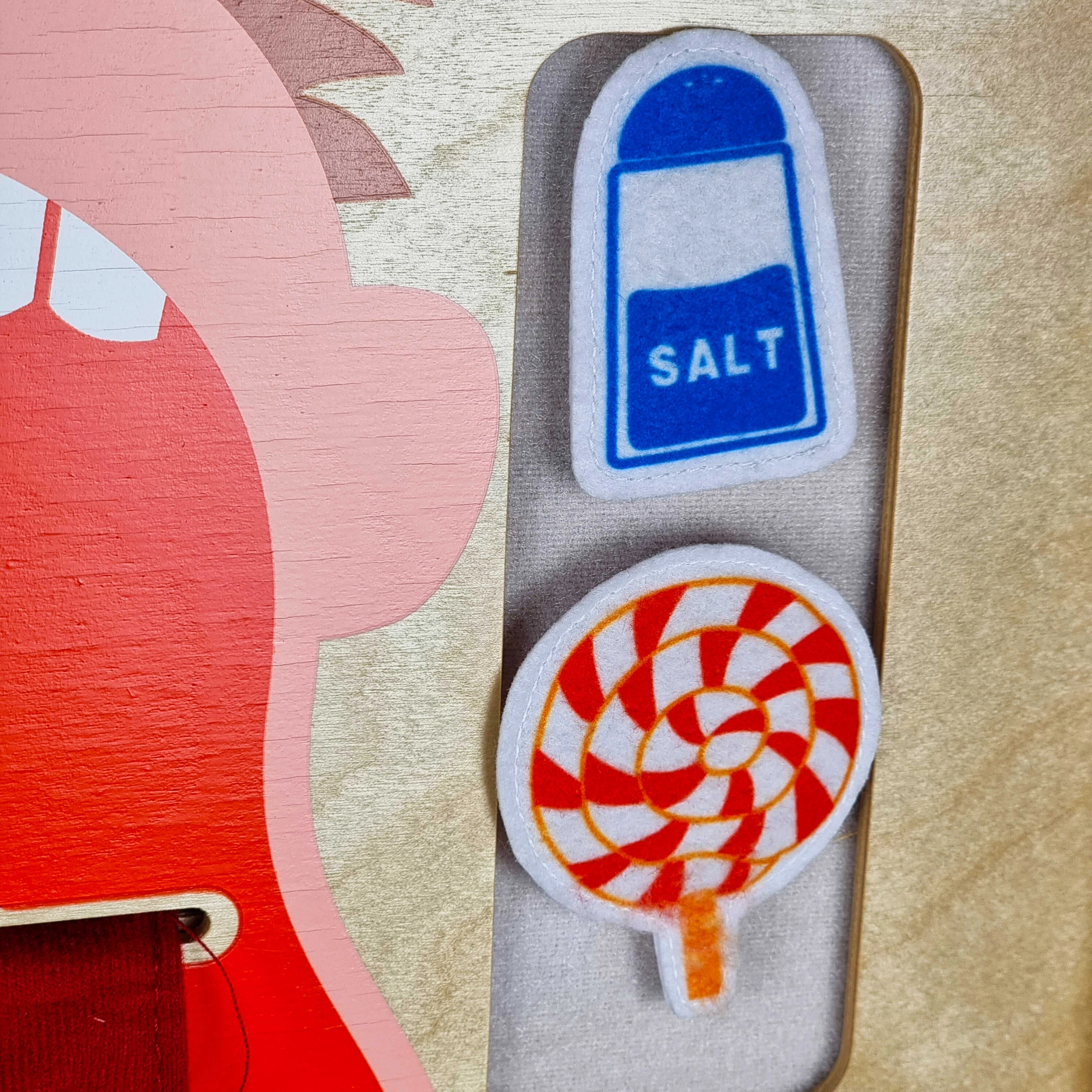 Liela kustīga mēle ar skaidri iezīmētām garšu zonām un pārtikas elementiem ar lipekli māca bērniem atšķirt saldu, sāļu, skābu un rūgtu garšu.
