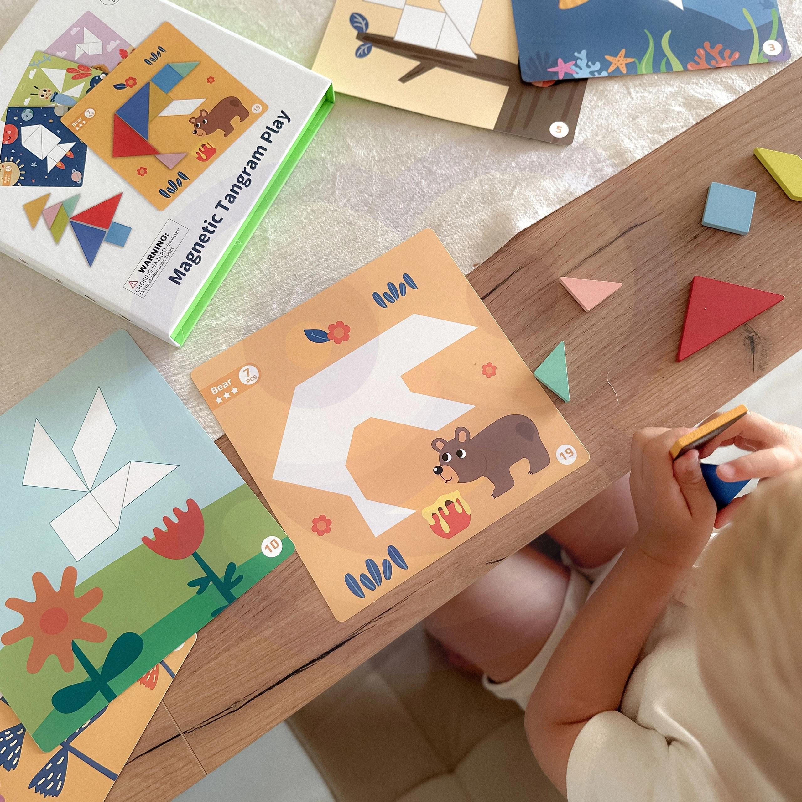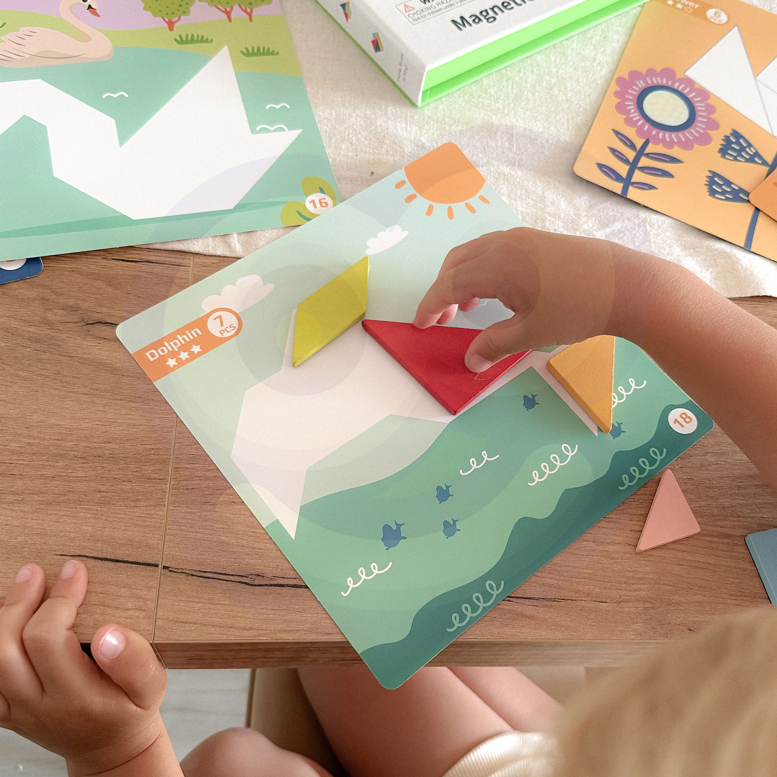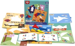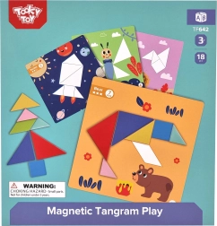 Ar magnētisko tangramu TOOKY TOY bērni viegli veido formas un attēlus uz sagatavotām kartītēm. Krāsainās ģeometriskās detaļas pieķeras pamatnei, tāpēc ar tām ērti darboties gan mājās, gan ceļā. Spēle veicina iztēli, koncentrēšanos un patstāvīgu uzdevumu risināšanu.