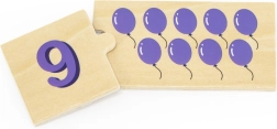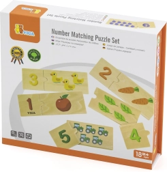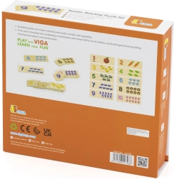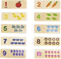 Šis lieliskais koka puzļu komplekts no VIGA fokusējas uz skaitīšanas trenēšanu un skaitļu atpazīšanu. Ar šo puzļu palīdzību bērns viegli apgūst skaitīšanu, atpazīst skaitļus un piešķir pareizu objektu daudzumu katram skaitlim. Pateicoties pievilcīgajām krāsām un attēliem, piemēram, dzīvniekiem, augļiem vai transportlīdzekļiem, bērni iepazīst apkārtējo pasauli. Tāpat tiek attīstīta koncentrēšanās, vārdu krājums un loģiskā domāšana.