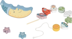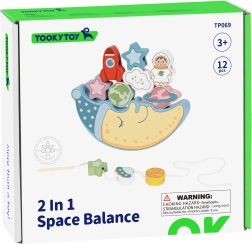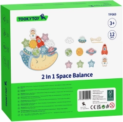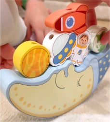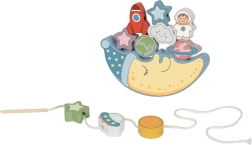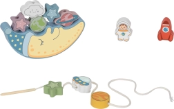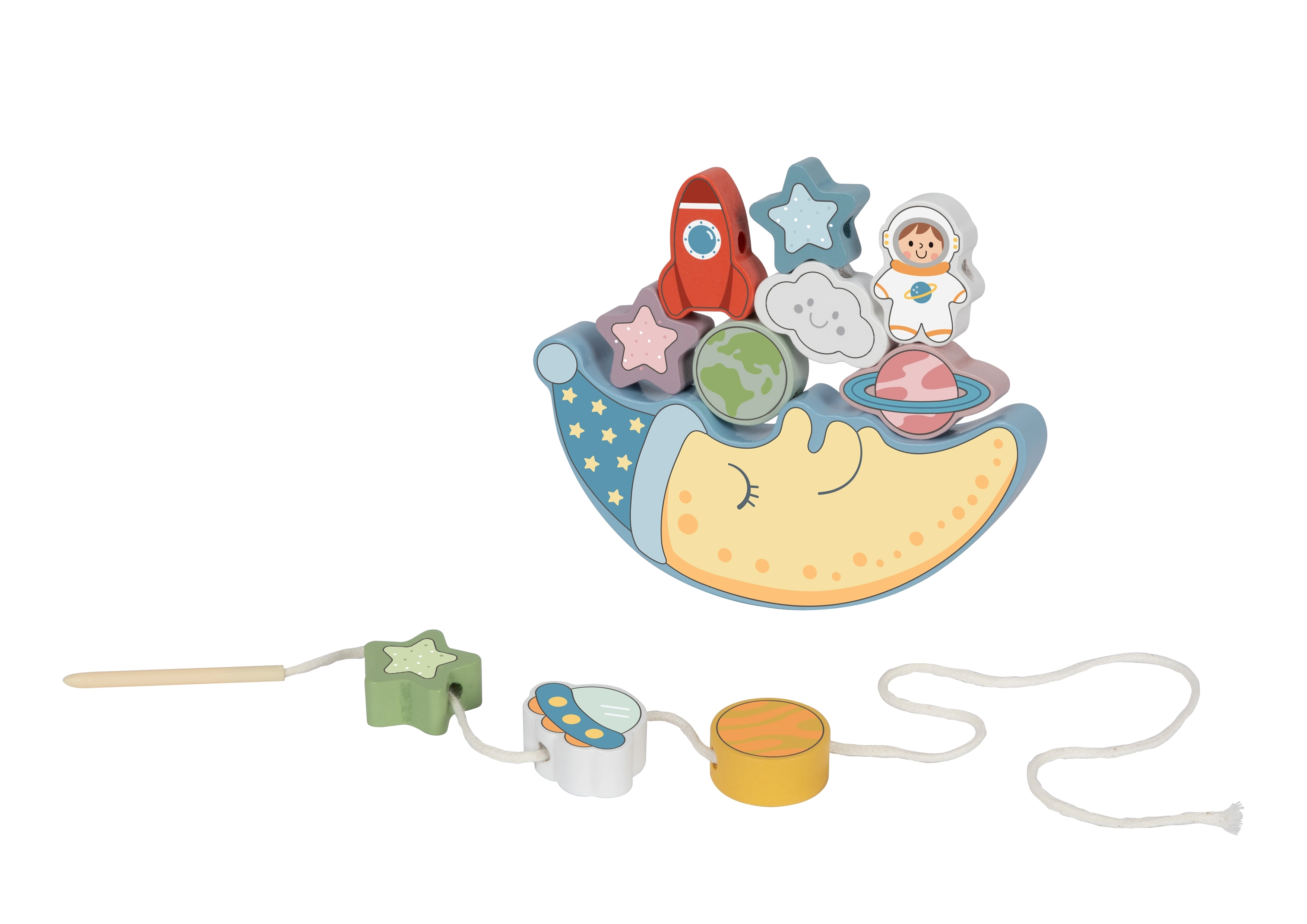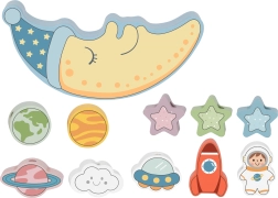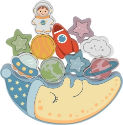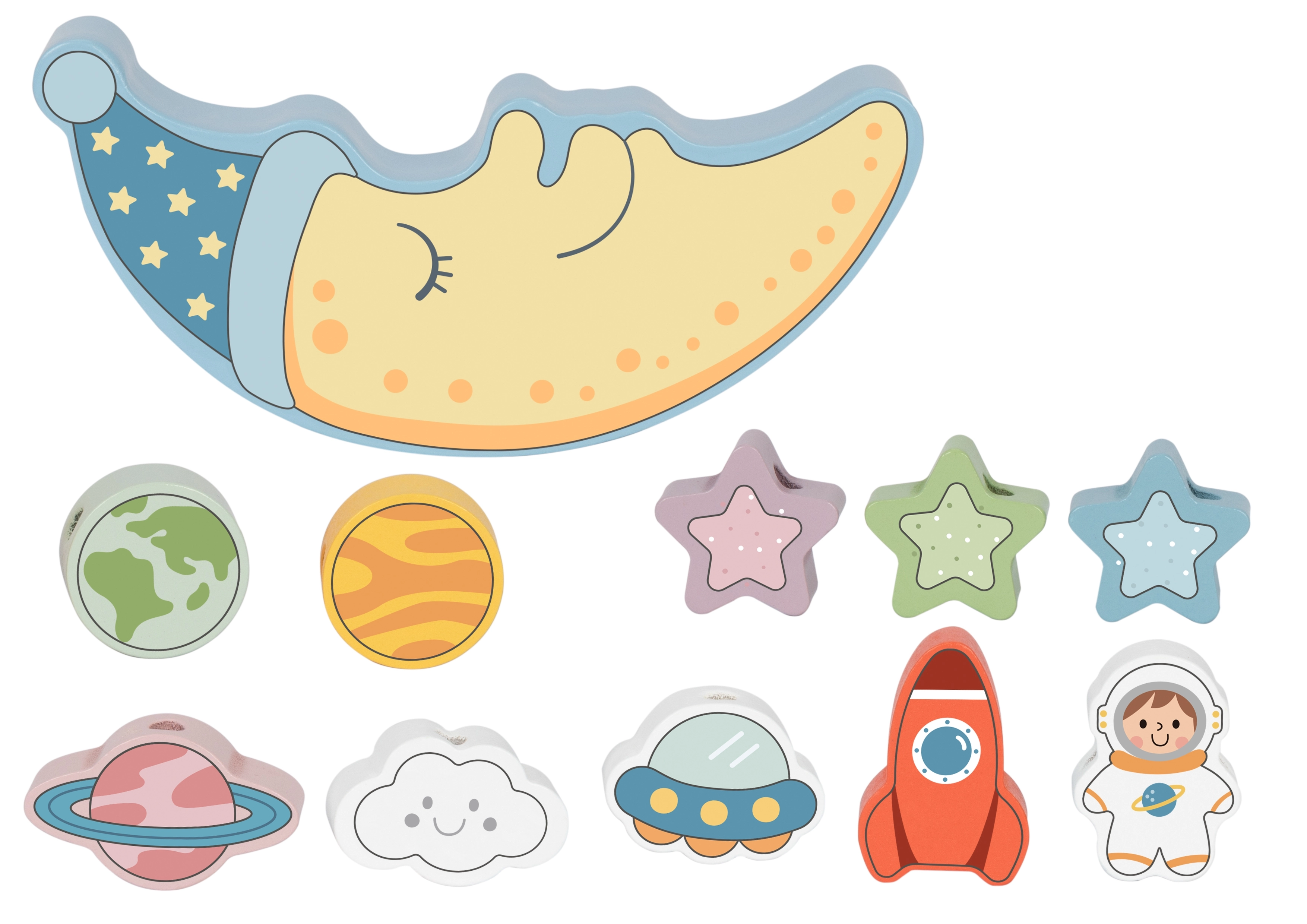 Pirmā komplekta daļa ir līdzsvarošanas izaicinājums: bērni cenšas novietot 10 krāsainus blokus – raķeti, astronautu, zvaigznes, NLO, planētas un jautru mākoni – uz guļošā mēness sejas, cenšoties, lai konstrukcija nesabruktu. Tā ir lieliska iespēja trenēt precizitāti un pacietību.
