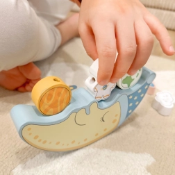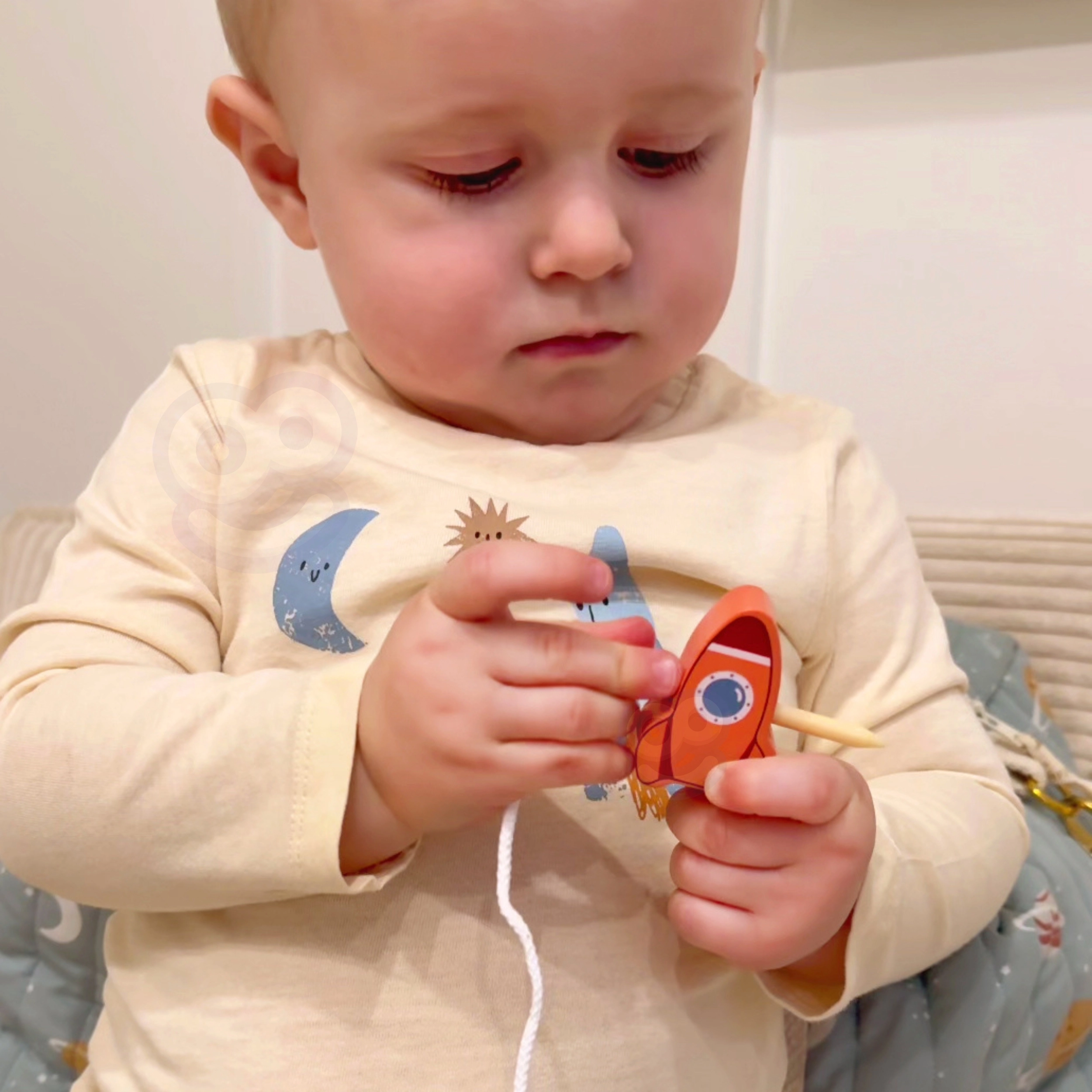Otrā daļa piedāvā radošu vēršanas spēli: blokus var savērt ar koka adatu un diegu, kas palīdz attīstīt smalko motoriku un roku-acu koordināciju.