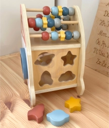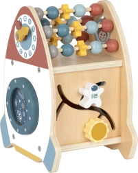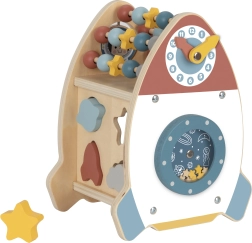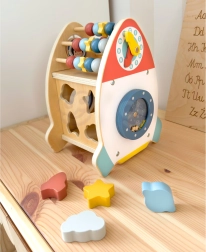 Rotaļlieta palīdz attīstīt sīko motoriku, pateicoties interaktīviem elementiem, piemēram, krellēm un formu šķirošanai.
