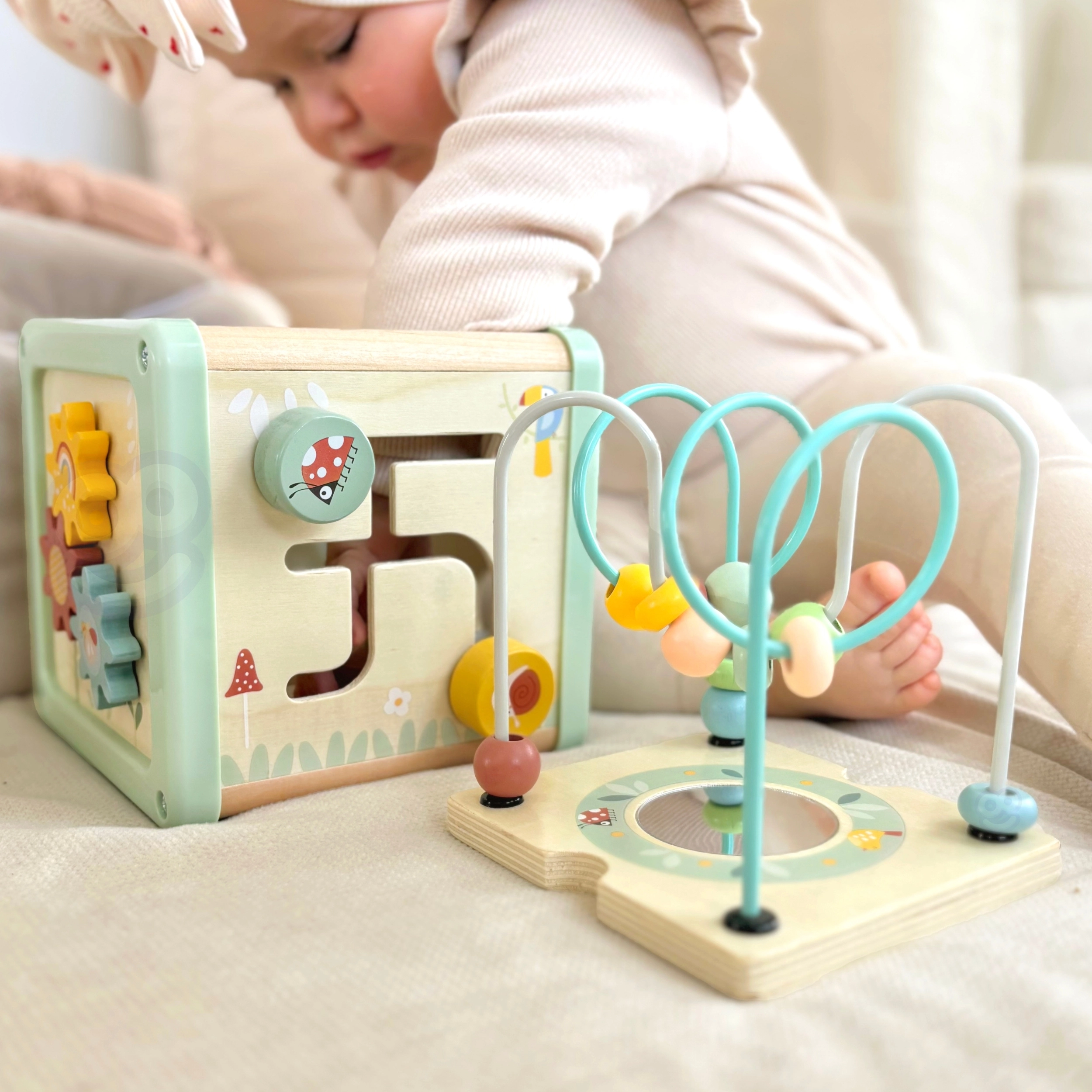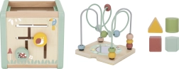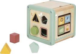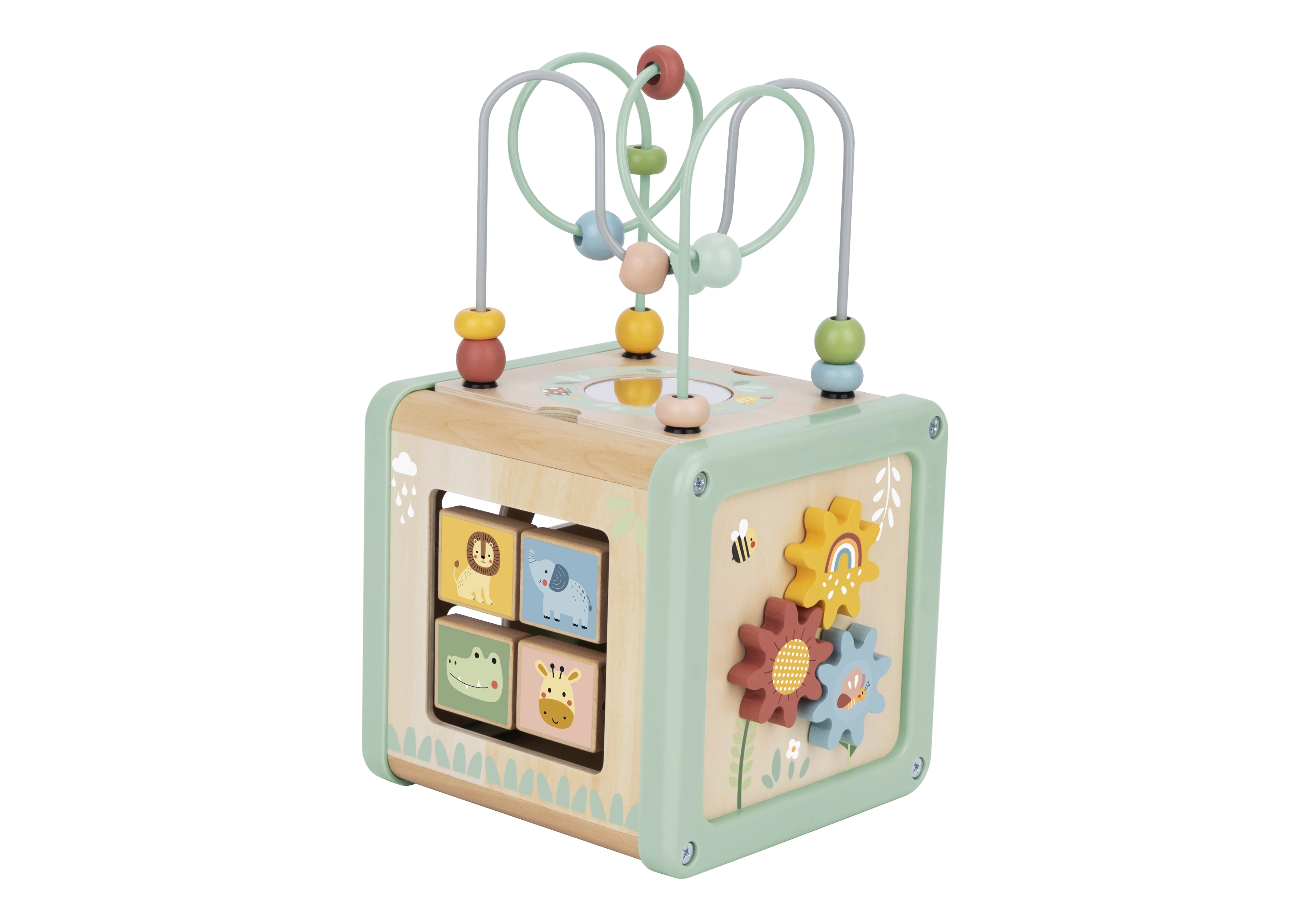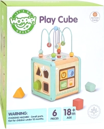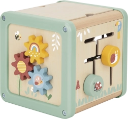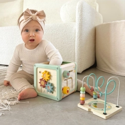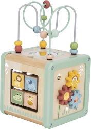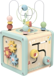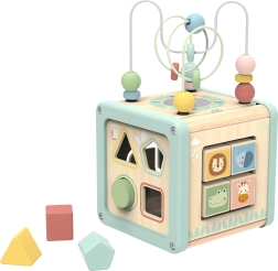 Šis daudzfunkcionālais koka kubs atbalsta bērna dabisku attīstību, izmantojot jēgpilnu spēli. Pasteļkrāsas piesaista uzmanību, savukārt daudzveidīgās aktivitātes trenē sīko motoriku, roku–acu koordināciju, loģisko domāšanu un formu un krāsu atpazīšanu.