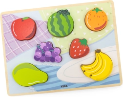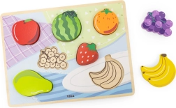 Atklājiet rotaļīgu mācīšanos ar Viga koka augļu puzlēm. Komplektā ir stabila, krāsaini ilustrēta pamatne un 7 gabaliņi (ābols, arbūzs, apelsīns, vīnogas, zemenes, banāni un bumbieris), kurus bērni ievieto atbilstošajās formās. Spilgās krāsas un skaidrās kontūras veicina formu un krāsu atpazīšanu.