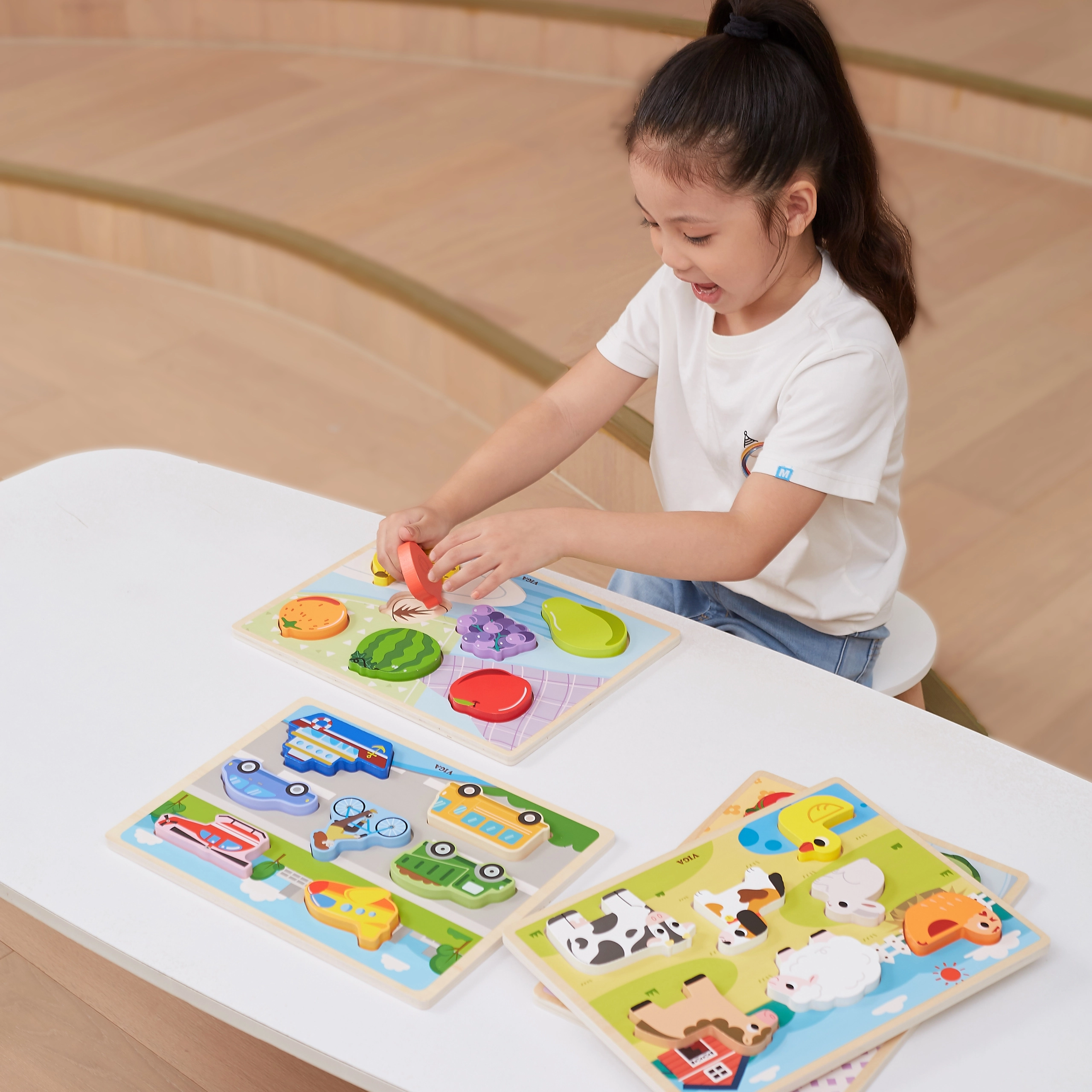 Pateicoties kvalitatīvam kokam un gludai apdarei, detaļas ir patīkamas rokai un drošas mazajiem bērniem. Puzle ir piemērota no 18 mēnešiem un lieliski attīsta koncentrēšanās spējas, pacietību un atmiņu. Gabaliņus var izmantot arī ārpus pamatnes kā figūriņas radošai spēlei.