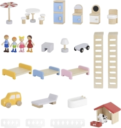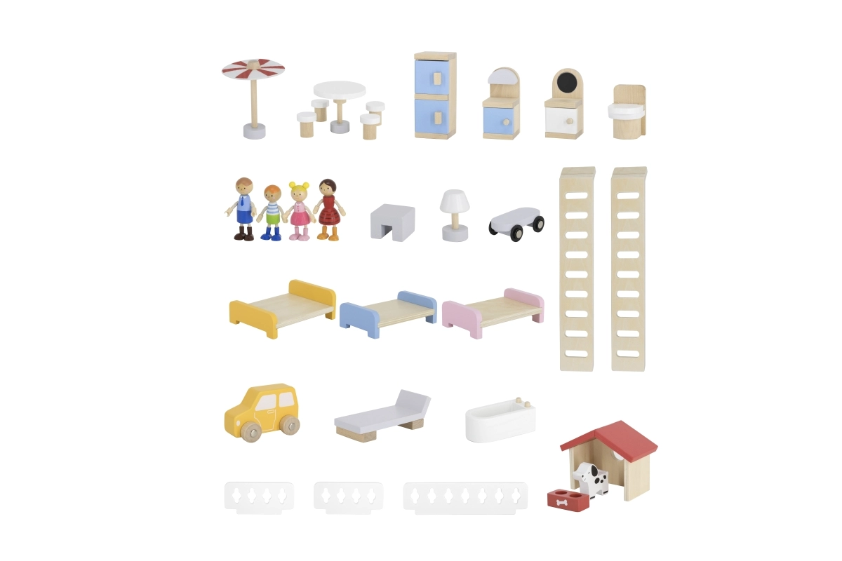 Komplektā iekļauti 32 elementi: mēbeles virtuvei, viesistabai, vannasistabai, guļamistabai un bērnistabai, 4 figūriņas un sunītis.