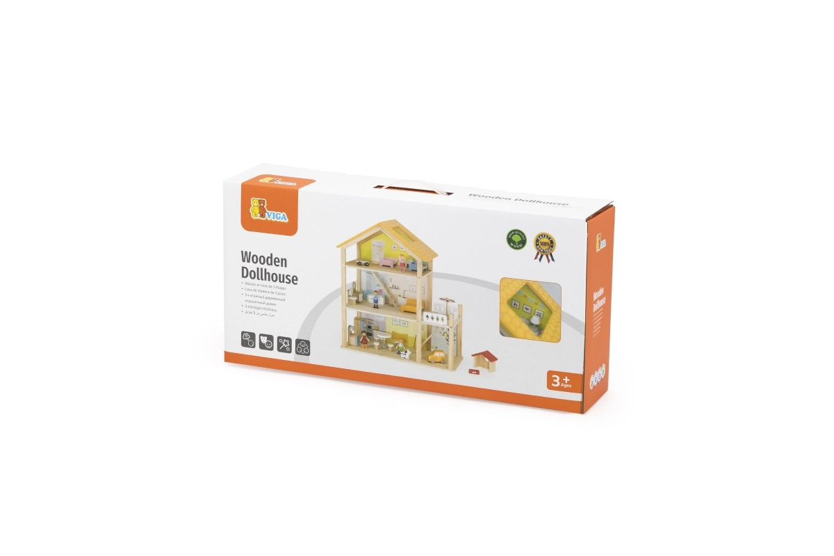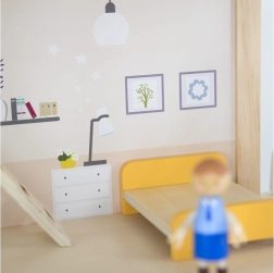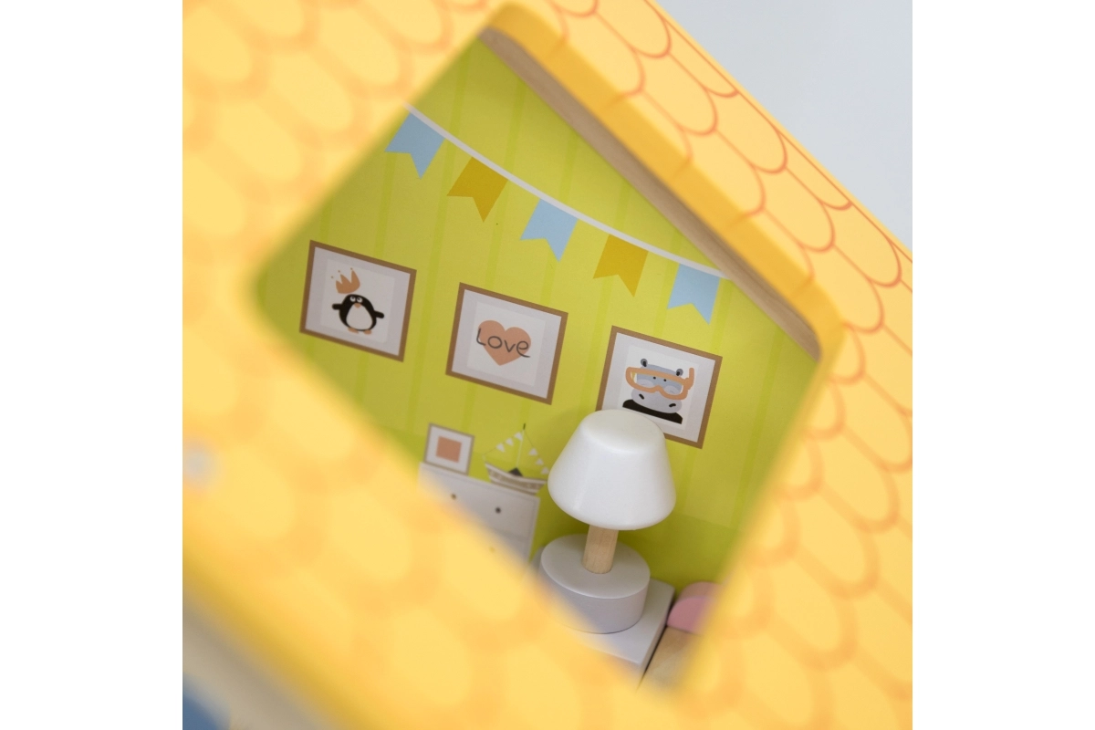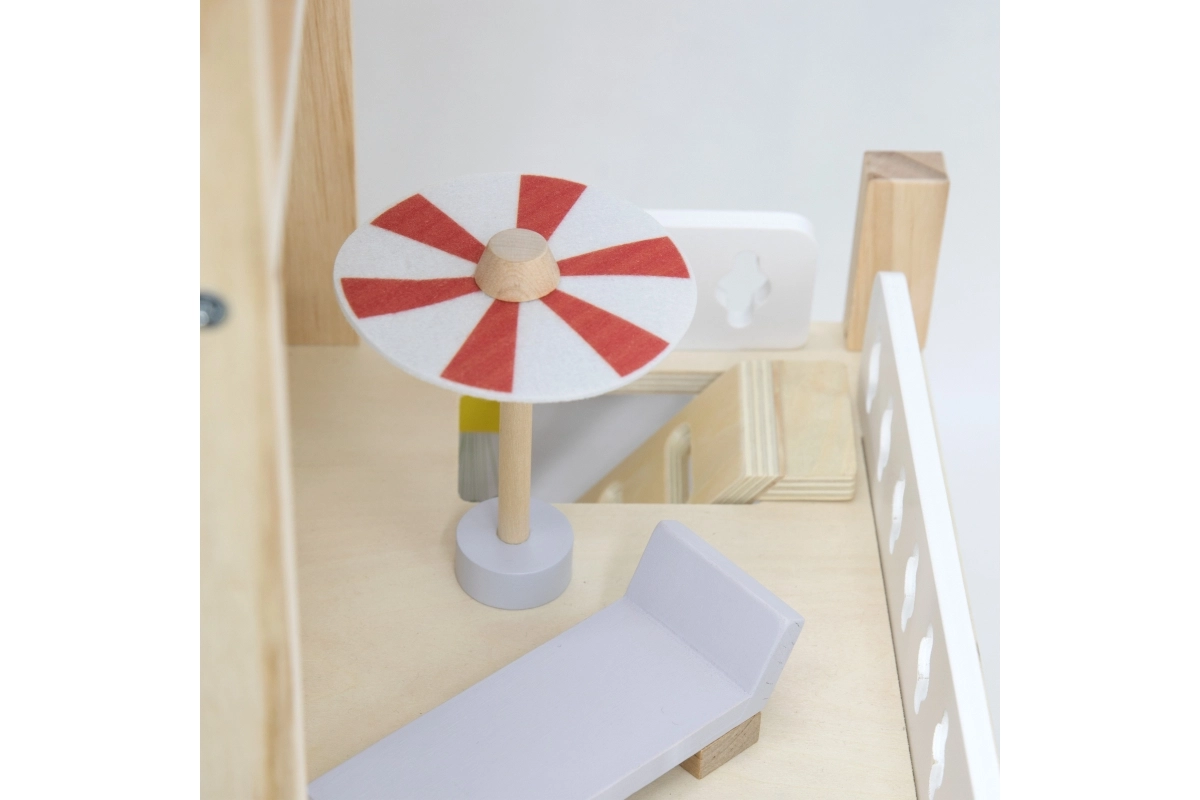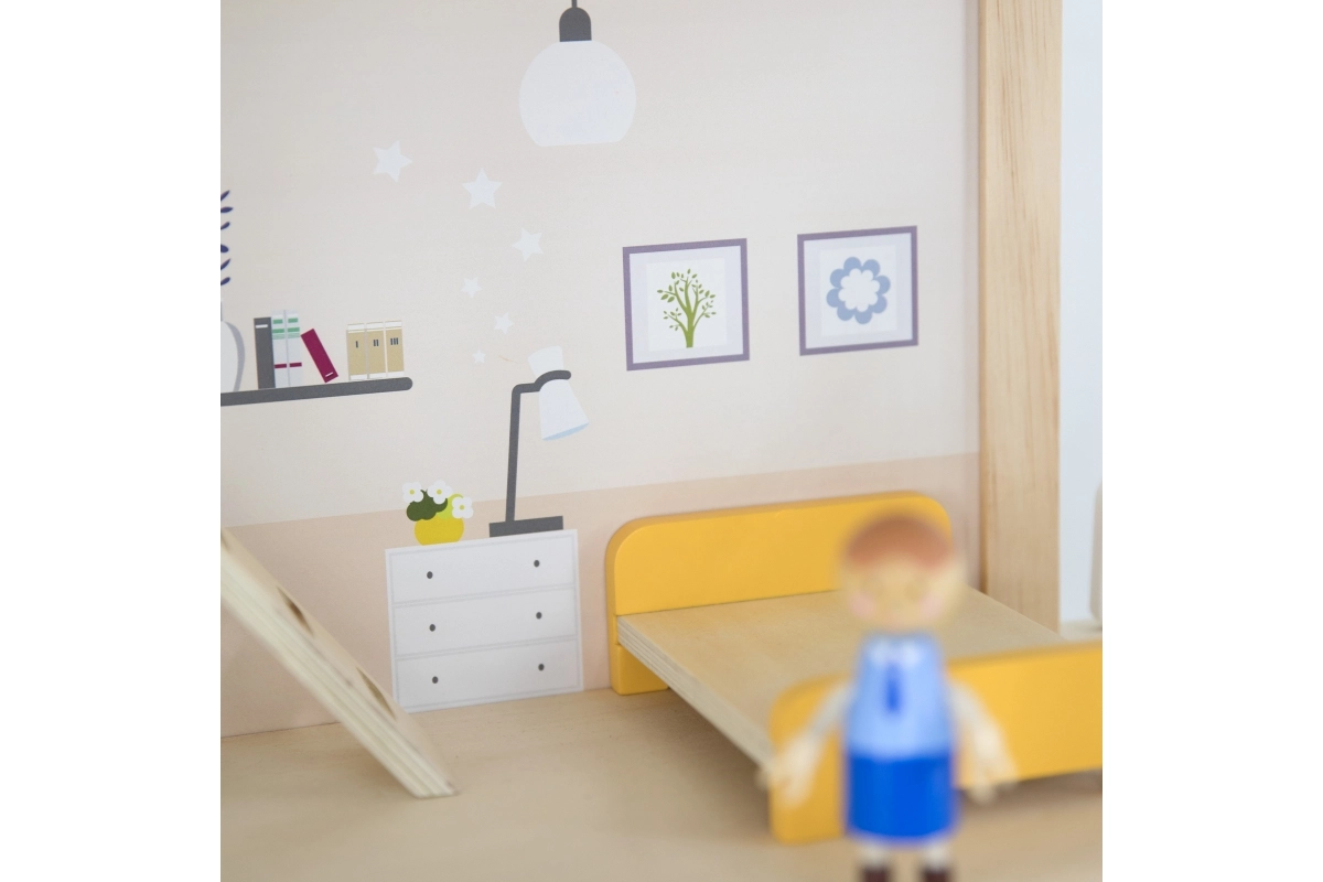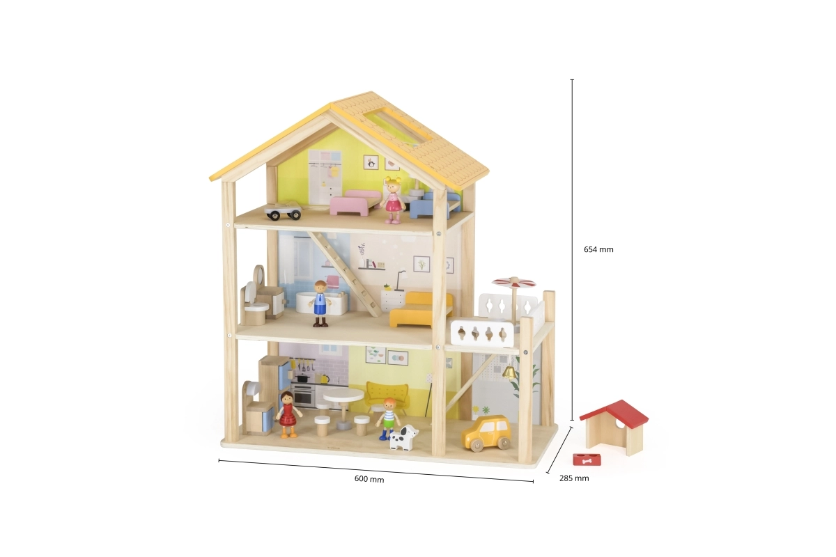 Pateicoties izturīgajai koka konstrukcijai un gludajām malām, spēlēties ir droši un patīkami. Līdz pat 32 elementi attīsta iztēli, sīko motoriku un sociālās prasmes. Ideāli lellēm līdz 10 cm.