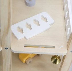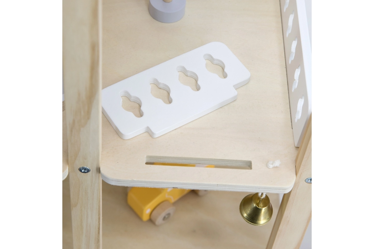 Praktiska garāža ar koka mašīnīti un citiem piederumiem paplašina spēles iespējas un veicina lomu spēles.