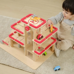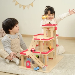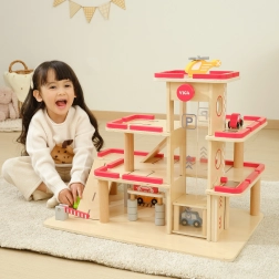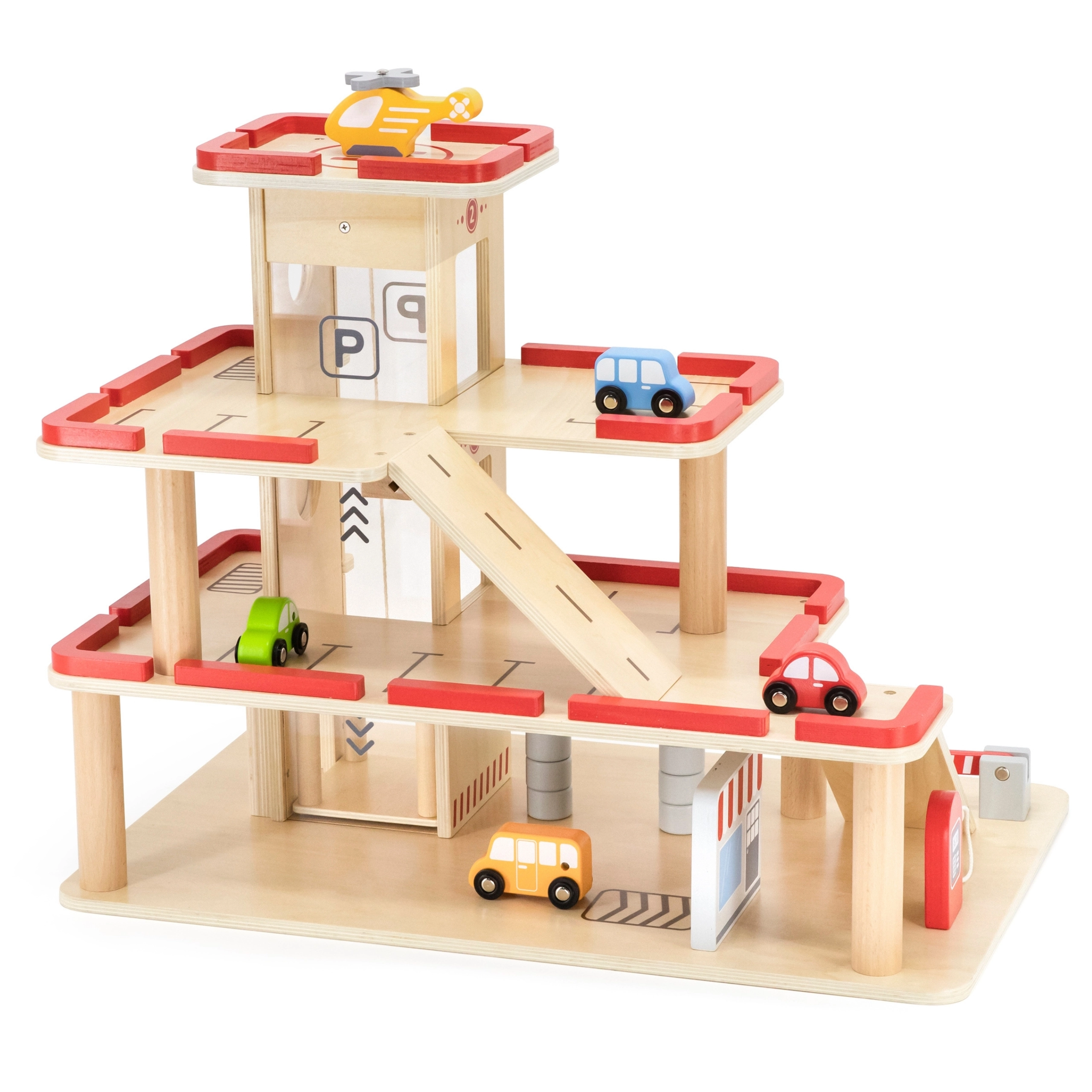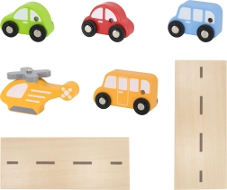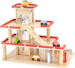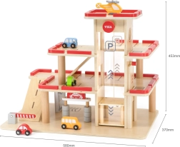 Iepakojumā iekļautas 4 koka mašīnītes, helikopters un iebrauktuves/izbrauktuves elementi. Skaidrs stāvvietu marķējums, automazgātuve un barjeras veicina reālistiskus scenārijus un māca bērniem koordinācijas prasmes.