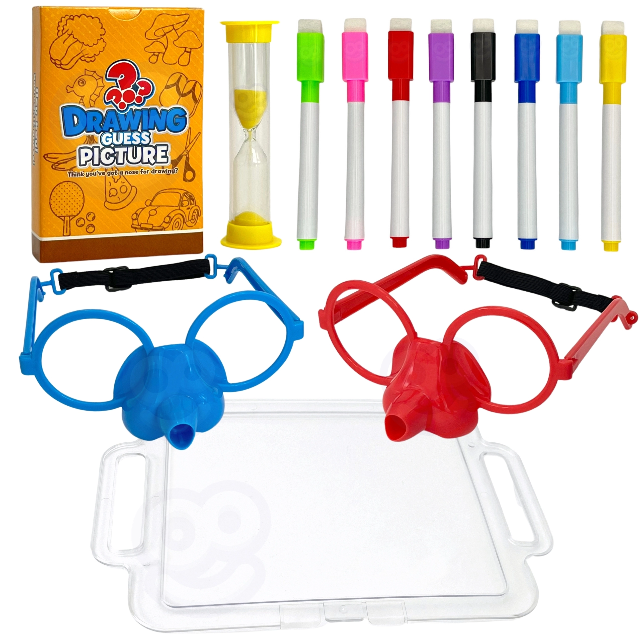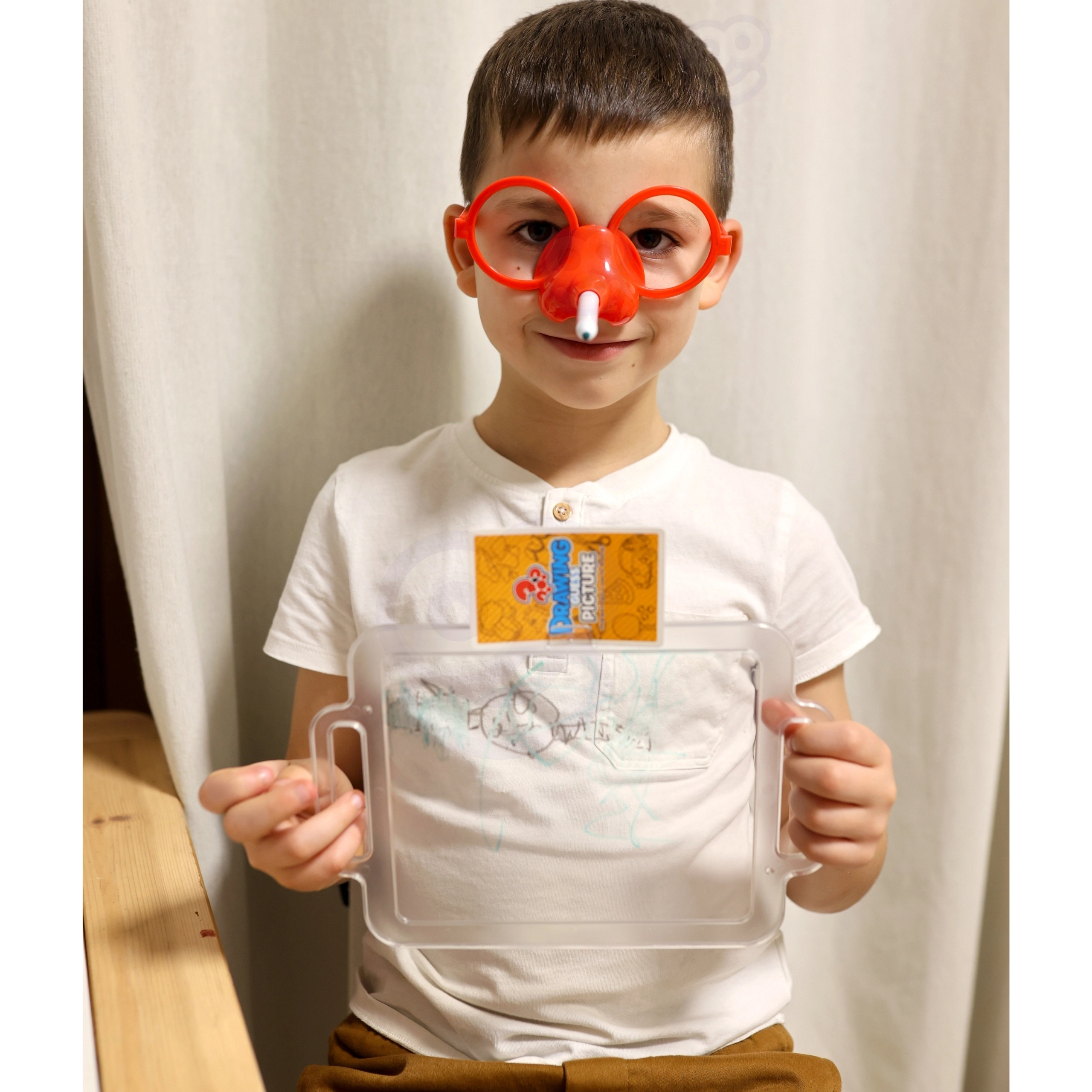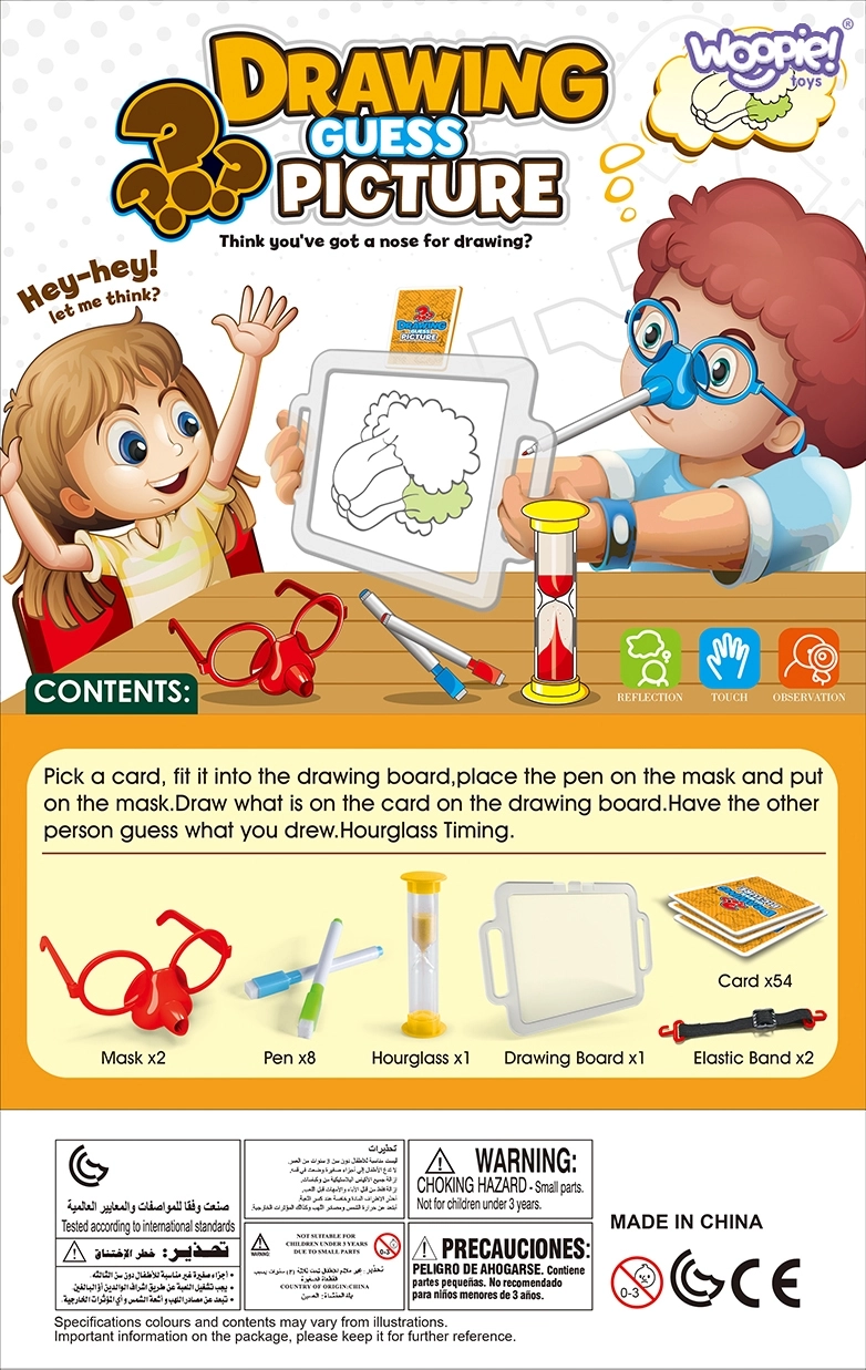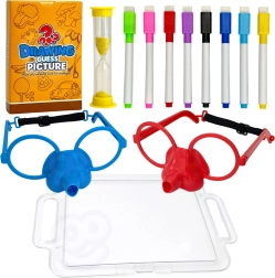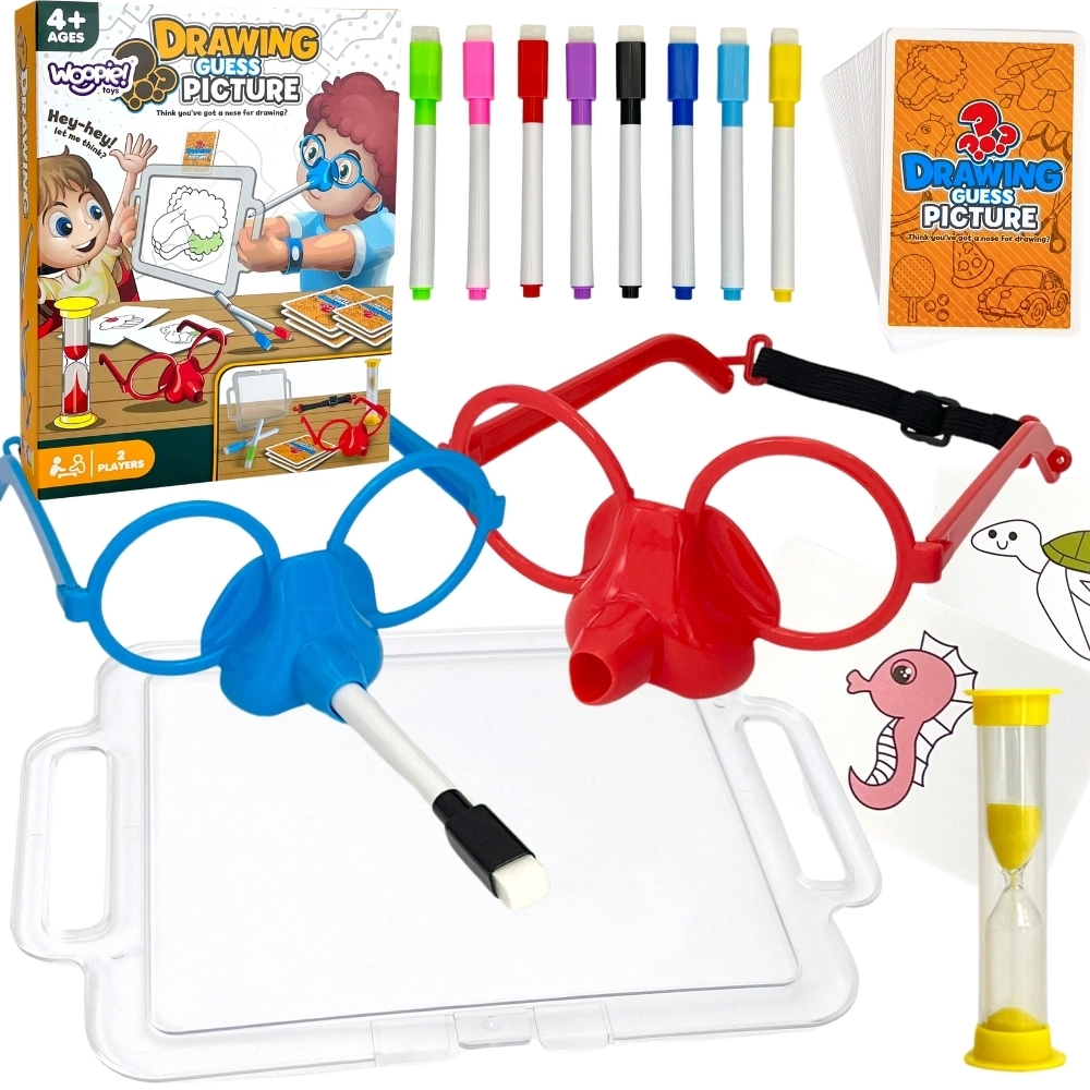 Iztēlojies zīmēšanu tikai ar degunu! Ar lielisko Zīmē un uzmini attēlu spēli no zīmola Woopie tas būs iespējams. Uzmauc speciālās brilles ar flomāsteri un uz zīmēšanas dēļa uzzīmē nejauši izlozētu attēlu, lai palīdzētu savai komandai uzminēt vārdus. Laiks skrien, tāpēc steidzies – smilšu pulkstenis jau tikšķ!