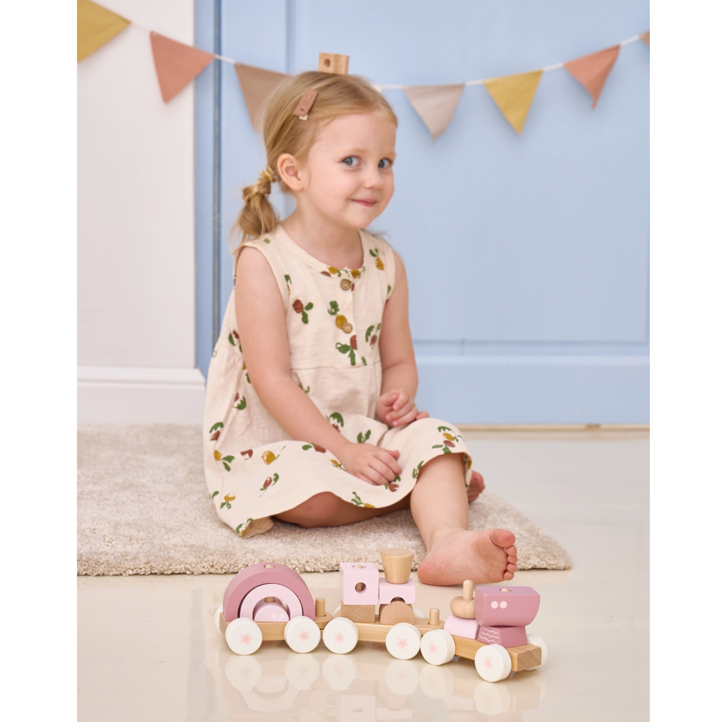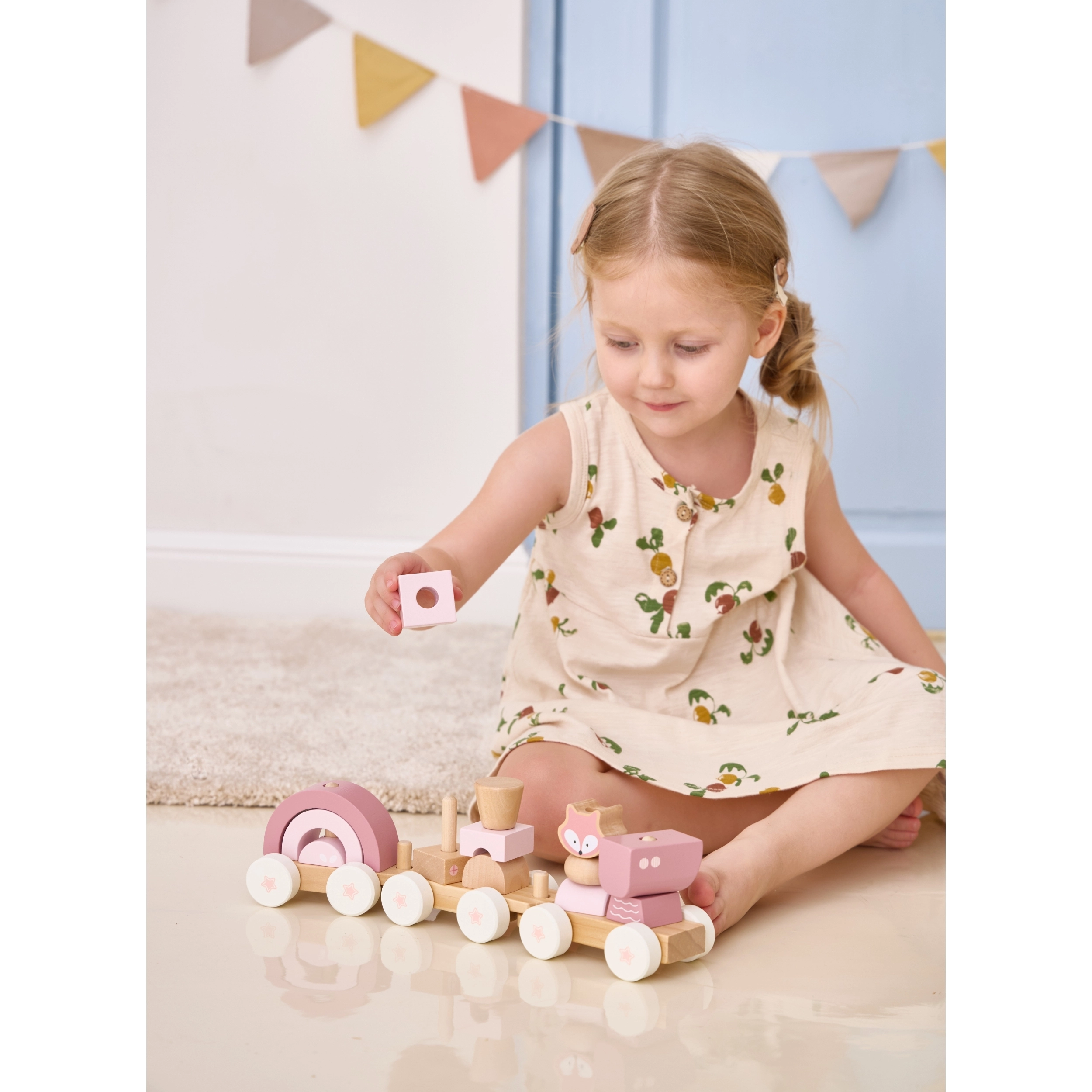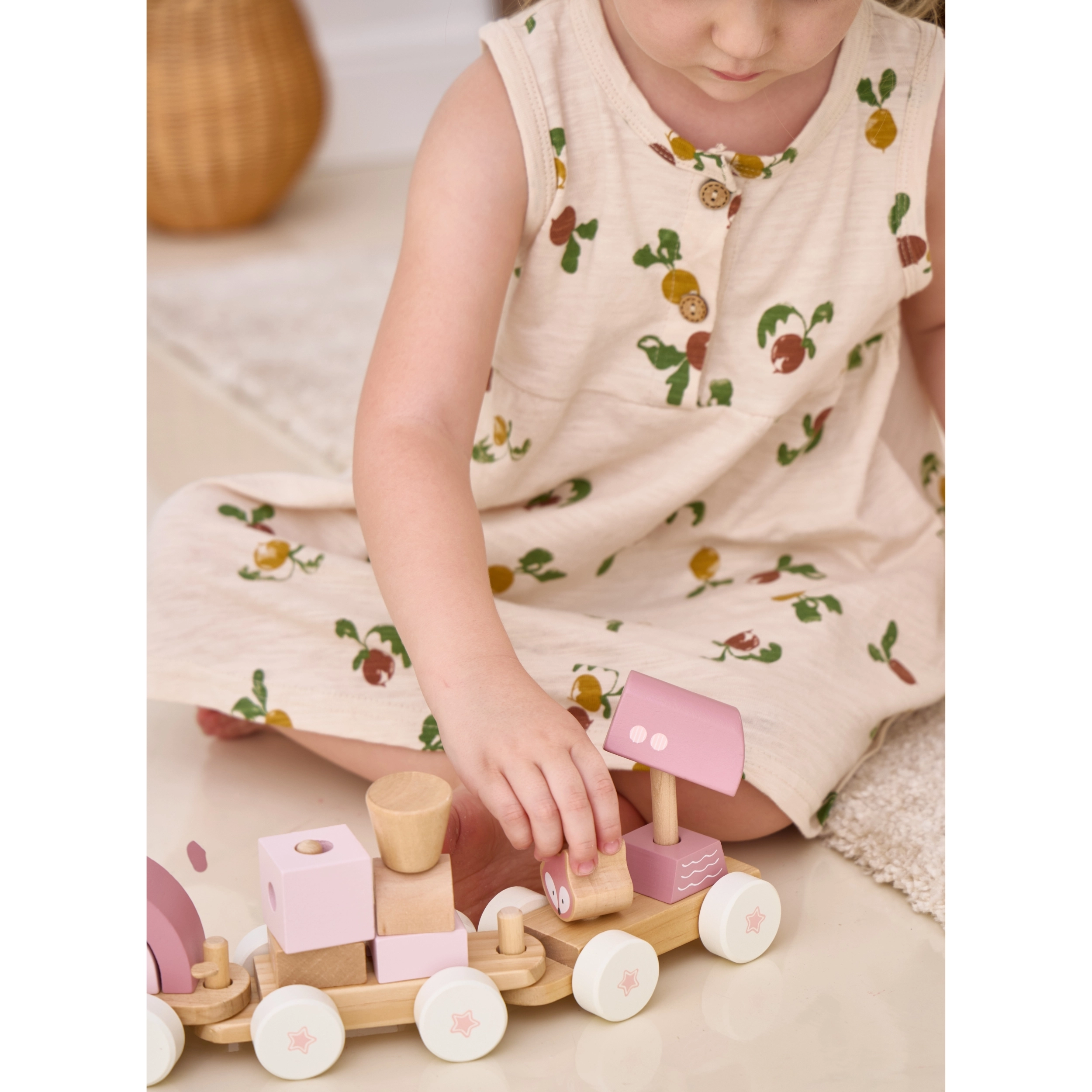 Mīlīgais rozā koka vilciens no PolarB sērijas ar zīmolu Viga iepriecinās ikvienu bērnu. Tas sastāv no 3 vagoniem un 14 klucīšiem dažādās formās, kurus var brīvi kombinēt un salikt. Pateicoties maigajām pasteļkrāsām, drošajam koka izpildījumam un patīkamajām formām, tas ir ideāli piemērots sīkās motorikas, koordinācijas un radošuma attīstīšanai jau no 18 mēnešu vecuma.
