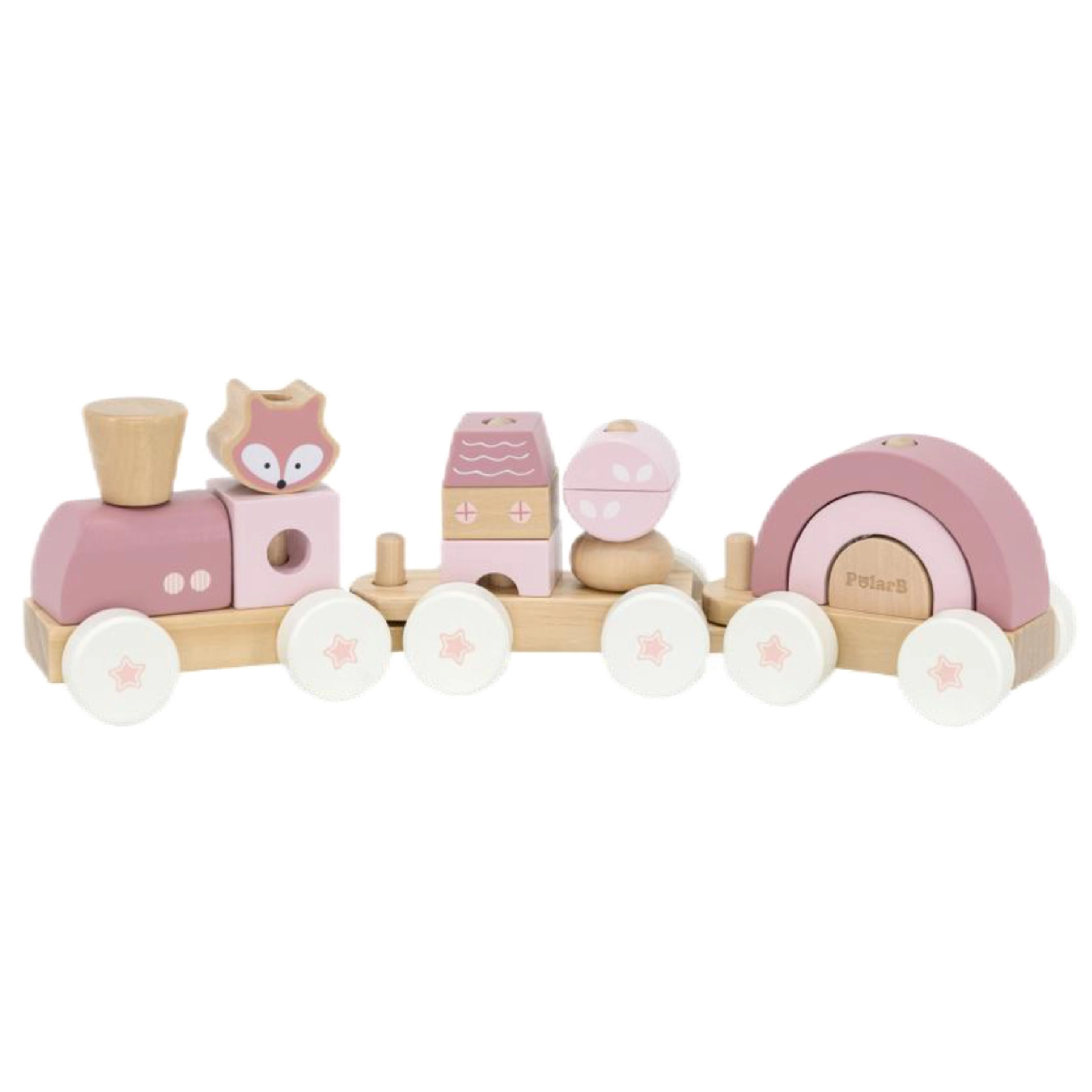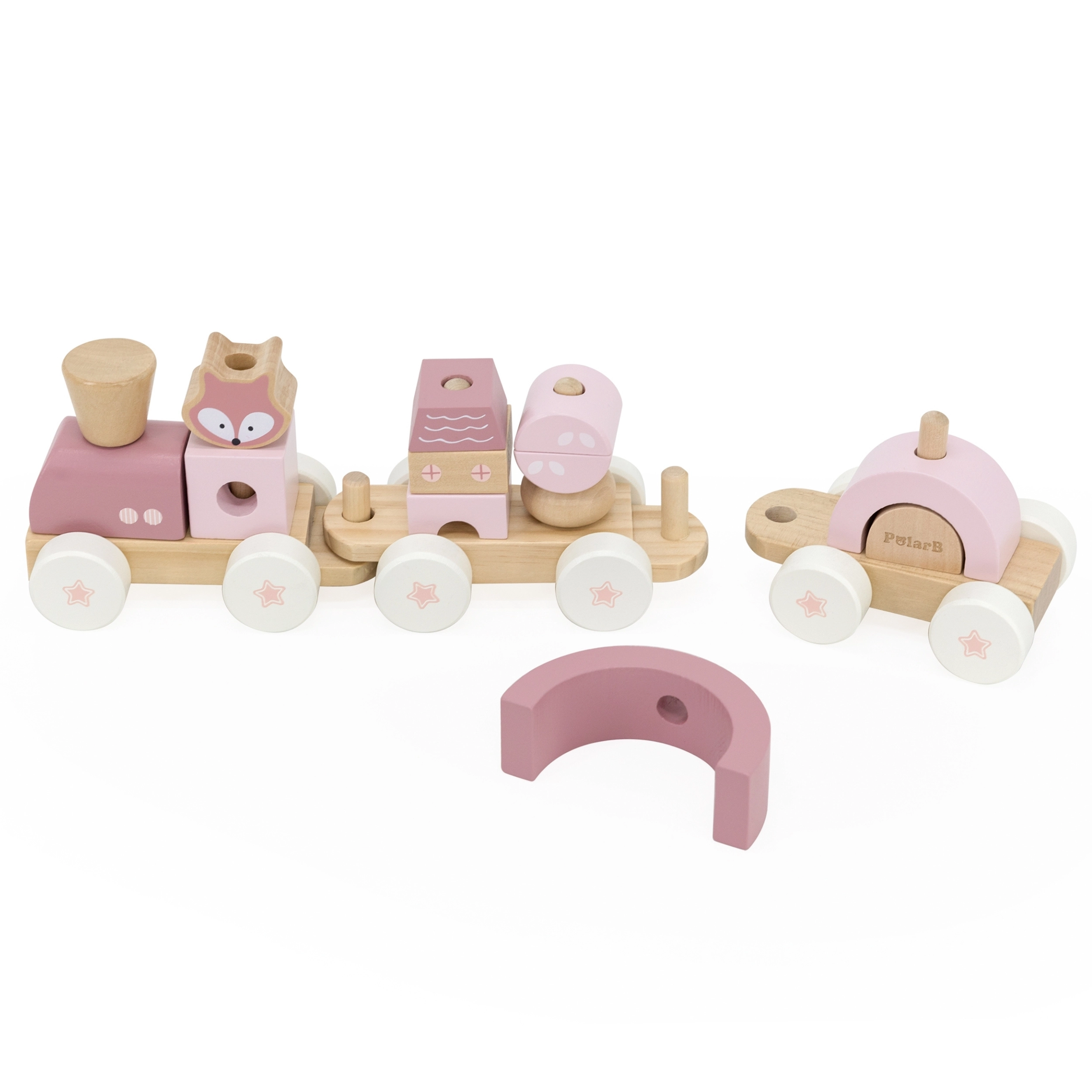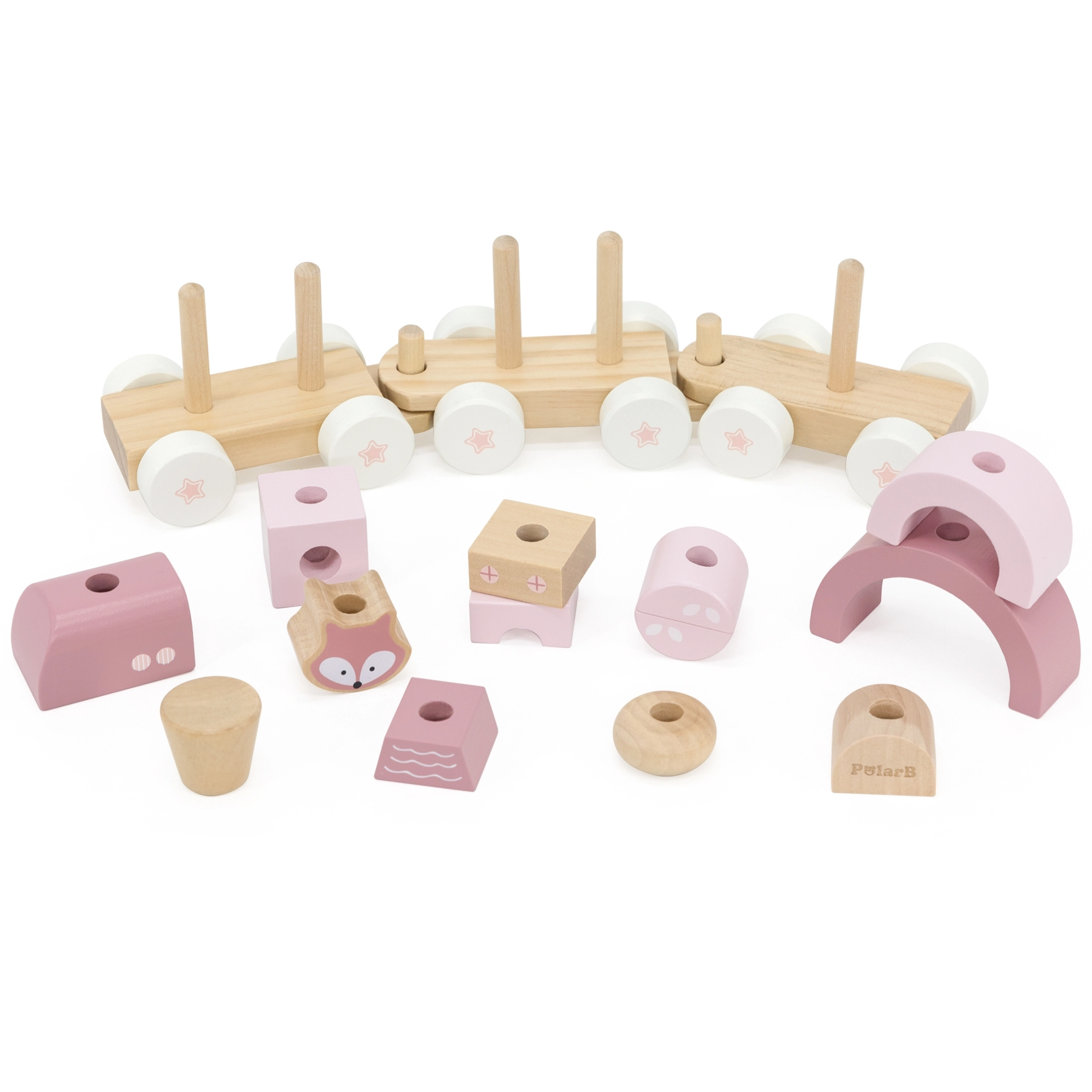 PolarB koka vilciens maigās rozā un dabīgās nokrāsās piedāvā bezgalīgas spēļu iespējas. Bērni var savienot vagonus, būvēt unikālas klucīšu kombinācijas vai spēlēties ar atsevišķām detaļām pa vienai. Praktiskās formas labi turas mazajās rociņās un veicina veiklību un iztēli.