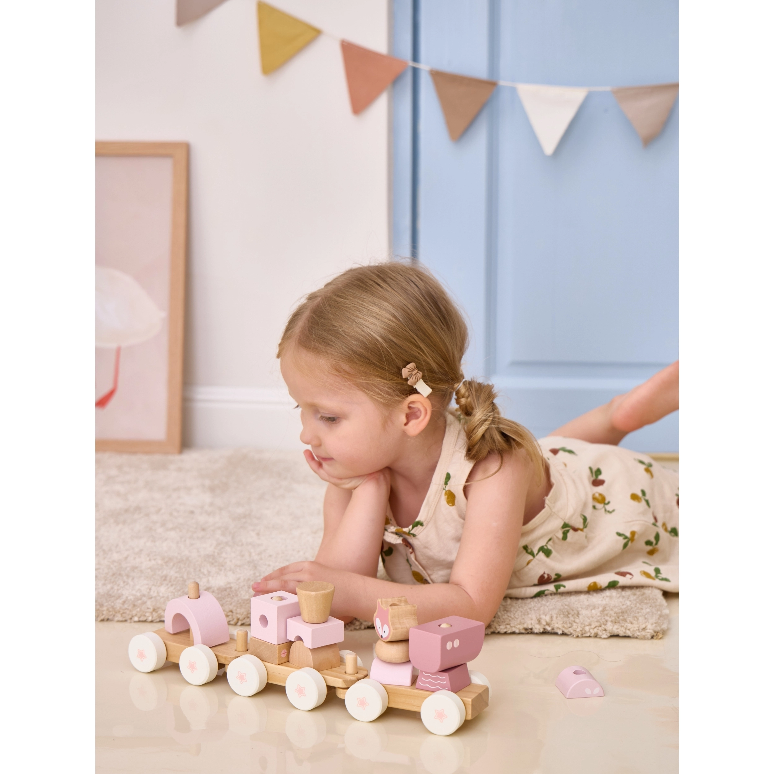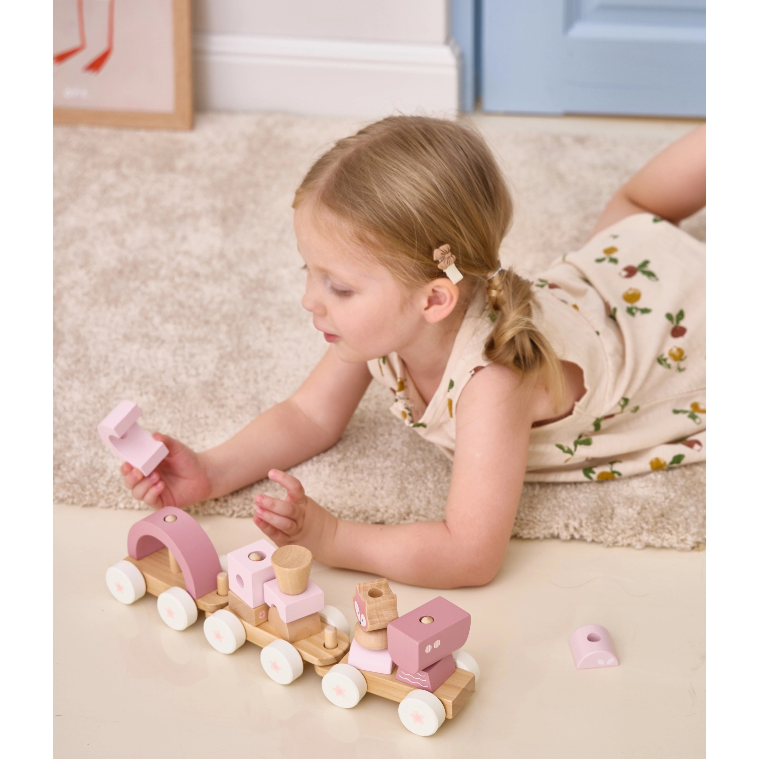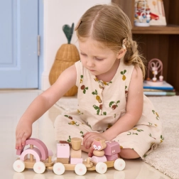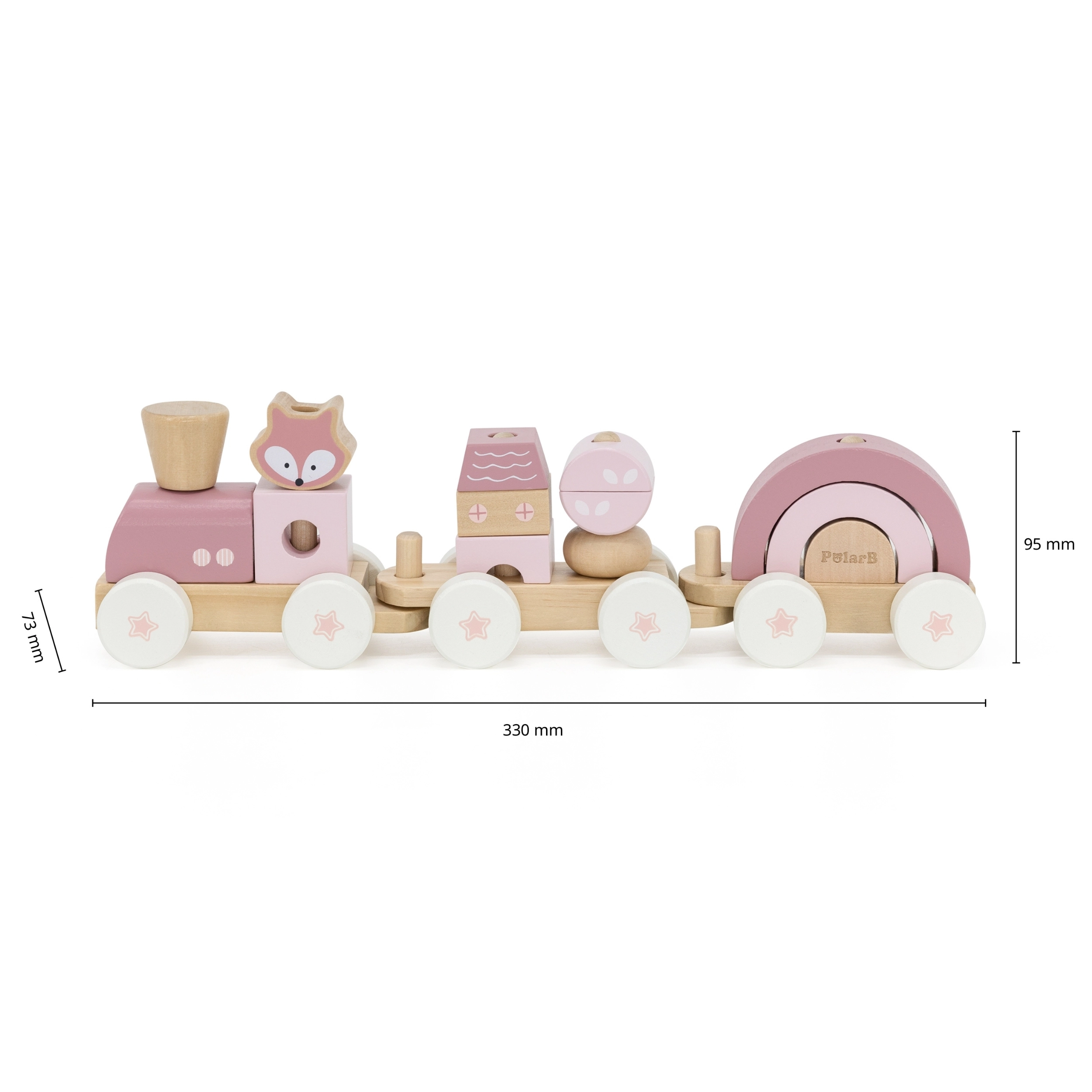 PolarB koka vilciens maigās rozā un dabīgās nokrāsās piedāvā bezgalīgas spēļu iespējas. Bērni var savienot vagonus, būvēt unikālas klucīšu kombinācijas vai spēlēties ar atsevišķām detaļām pa vienai. Praktiskās formas labi turas mazajās rociņās un veicina veiklību un iztēli.