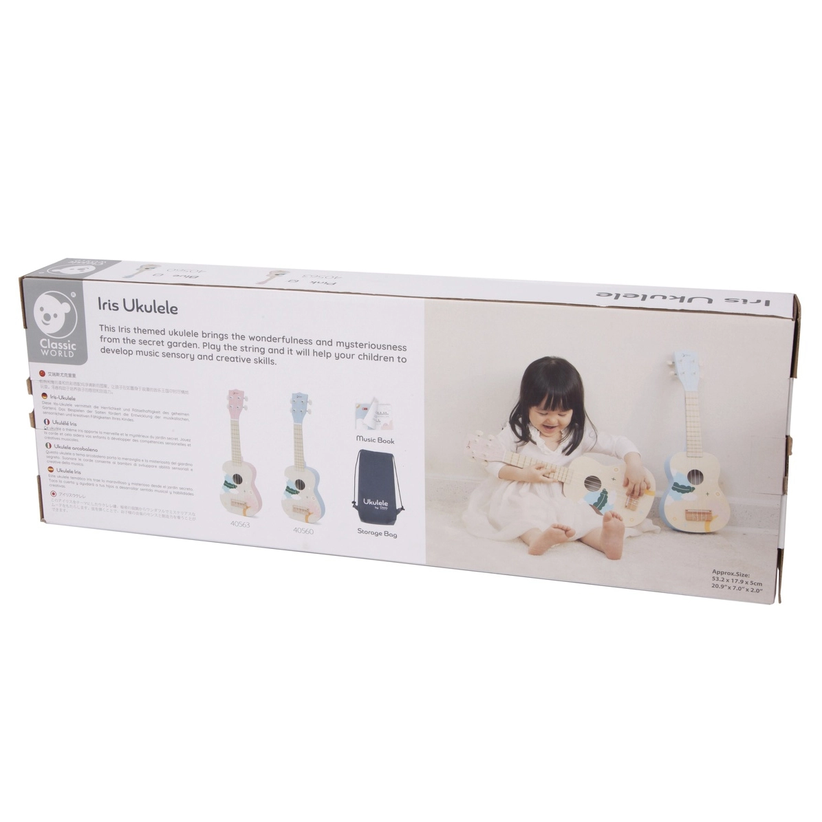 Mīlīgs bērnu ukulele no zīmola CLASSIC WORLD palīdz attīstīt sīko motoriku, koncentrēšanos un muzikālo izjūtu. Pateicoties koka konstrukcijai un maigajai, ne pārāk skaļajai skaņai, tas ir ideāli piemērots pirmajiem soļiem mūzikas pasaulē. Virsma ir lakota ar netoksiskām krāsām, un instruments uzticami atdarina īstu ukuleli.