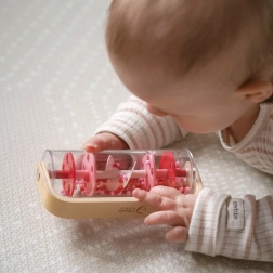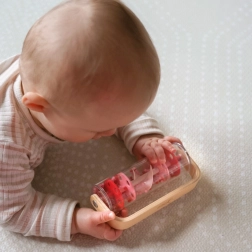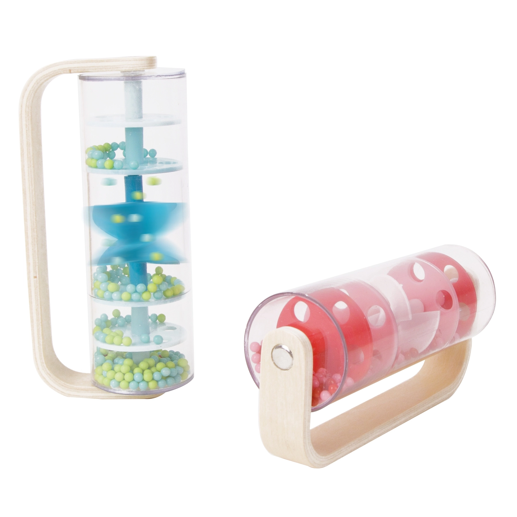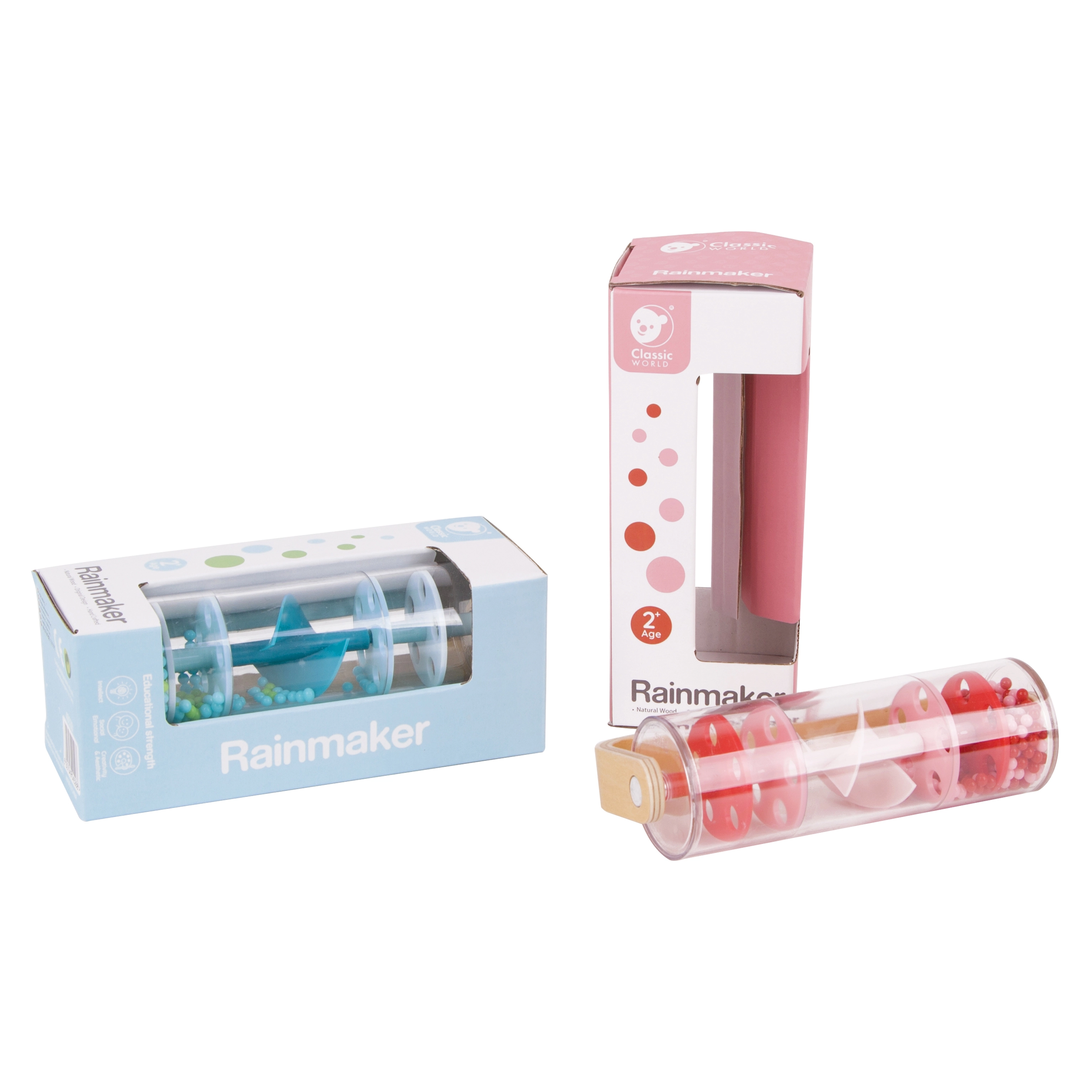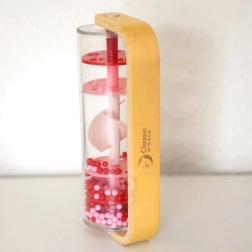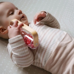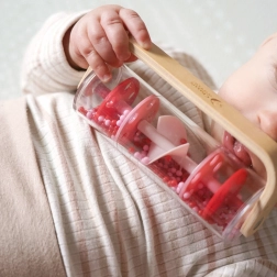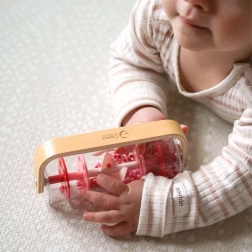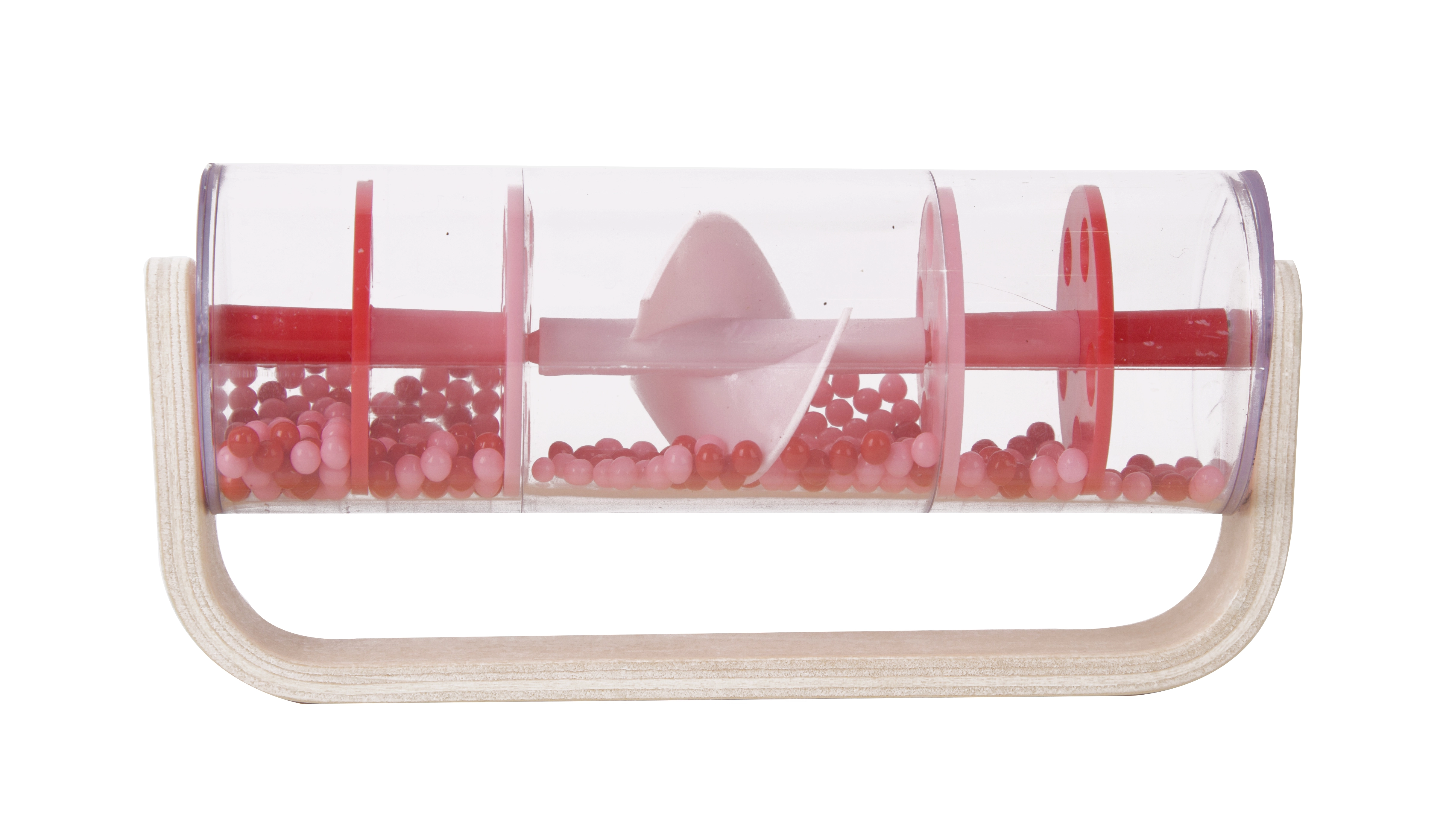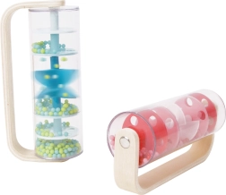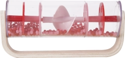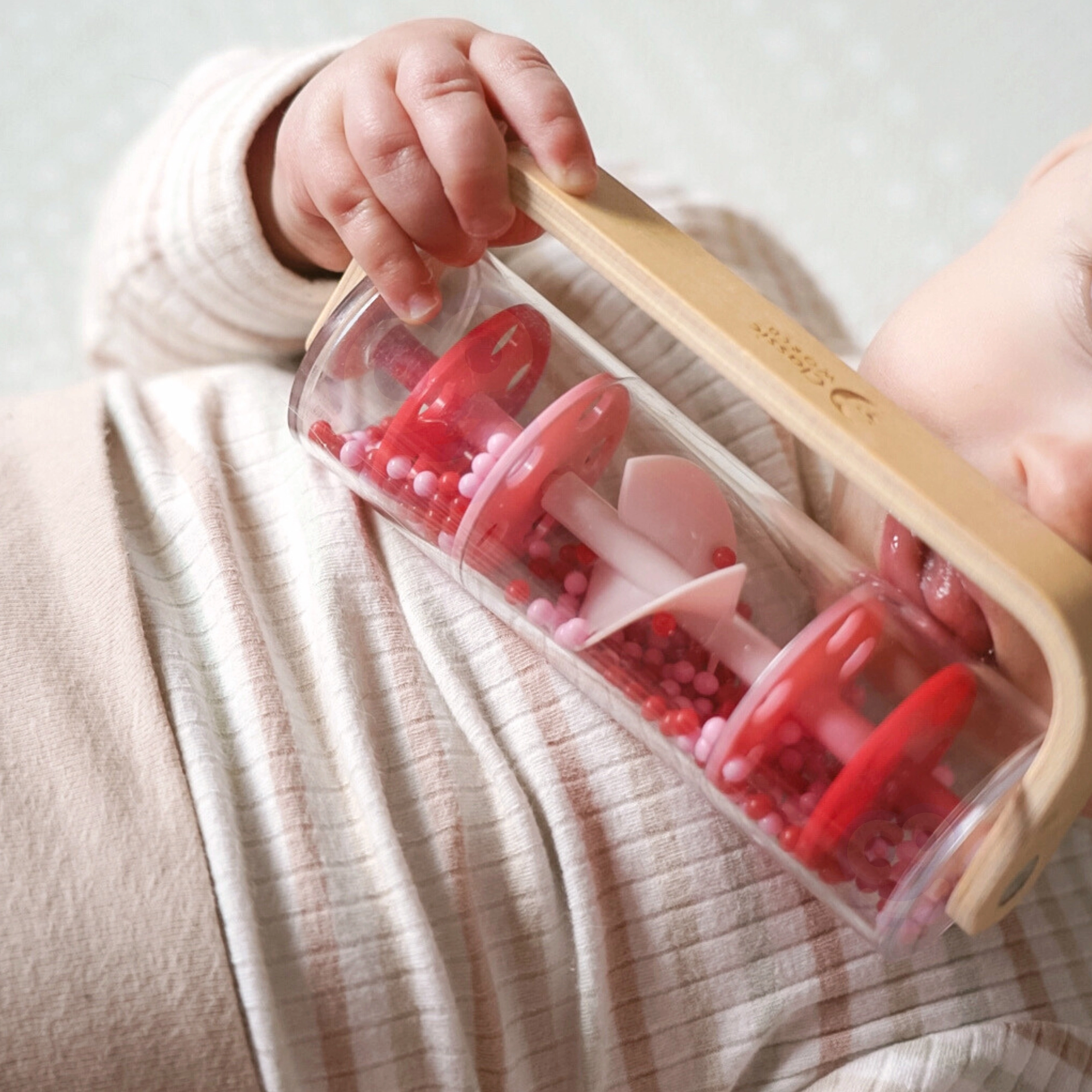 Šī sarkanā lietusnūja apvieno dabīgu koku un caurspīdīgu korpusu, kas piepildīts ar krellītēm. Kustības laikā tās vienmērīgi pārbirzt, radot relaksējošu, ritmisku skanējumu. Bērni var rotaļlietu kratīt, griezt par 360° un vērot, kā pērlītes ceļo no augšas uz leju — lielisks stimuls redzei, dzirdei un sīkajai motorikai.