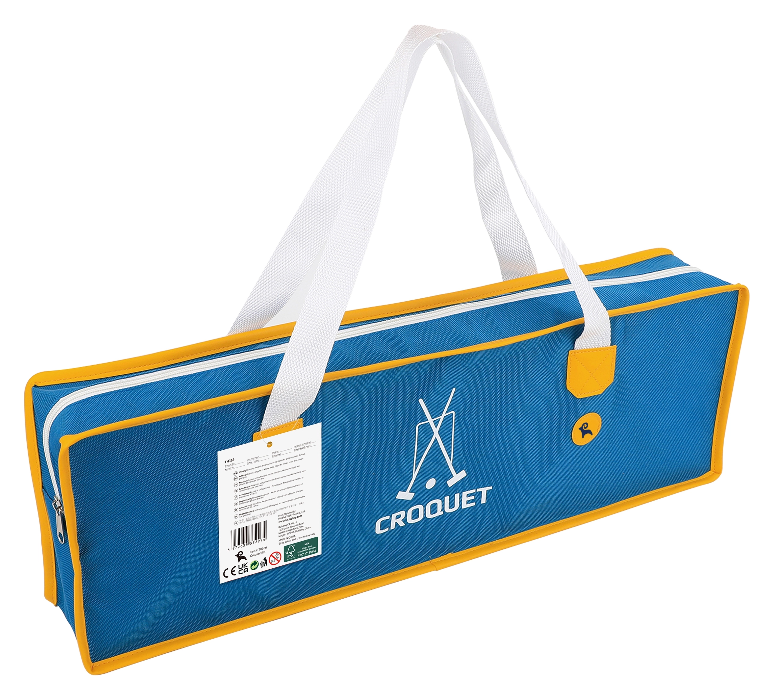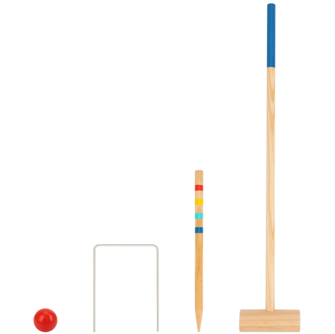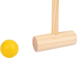 Iepakojumā: 4 koka nūjas, 4 krāsainas bumbiņas, 6 metāla vārtiņi, 4 gala mietiņi un soma – viss gatavs tūlītējai spēlei.