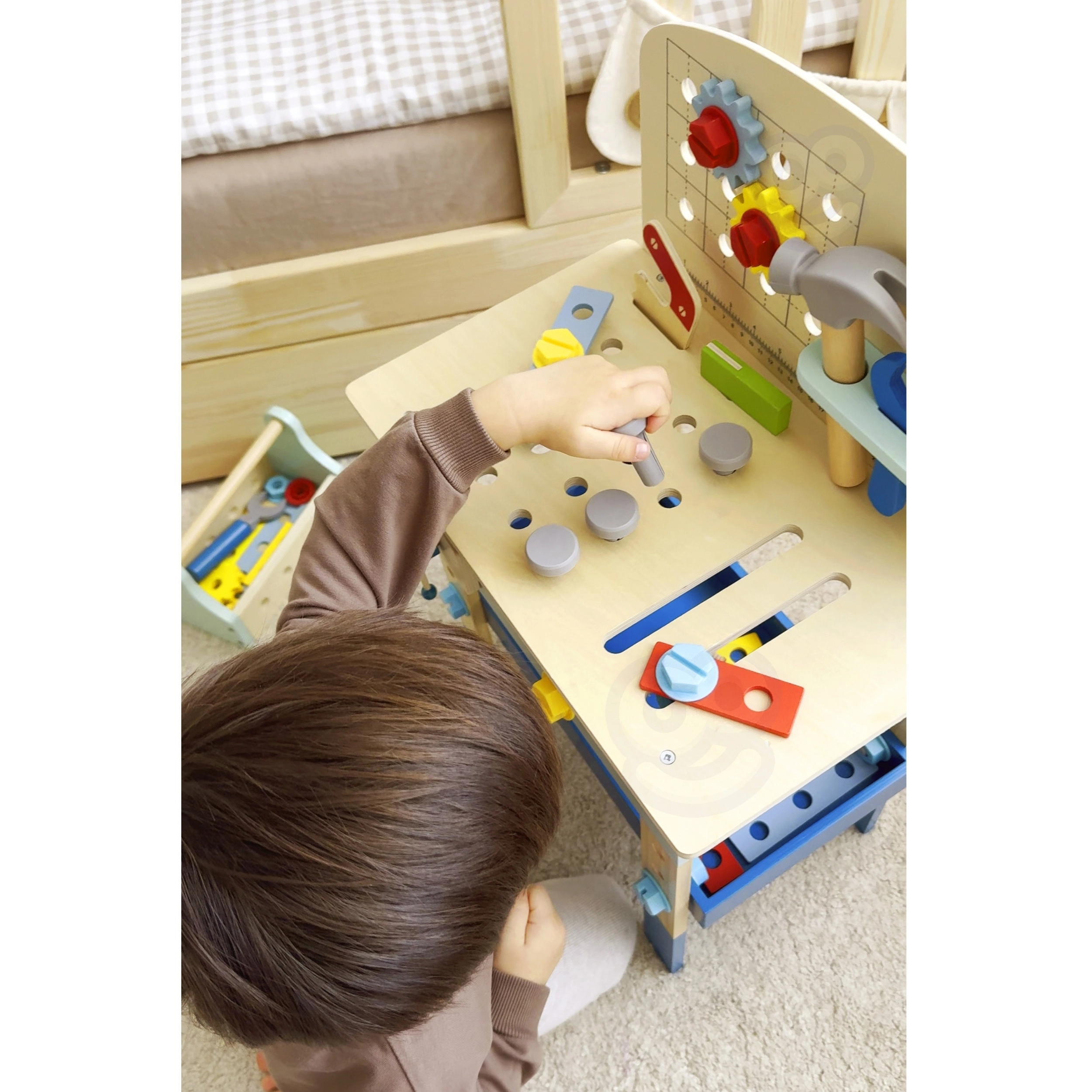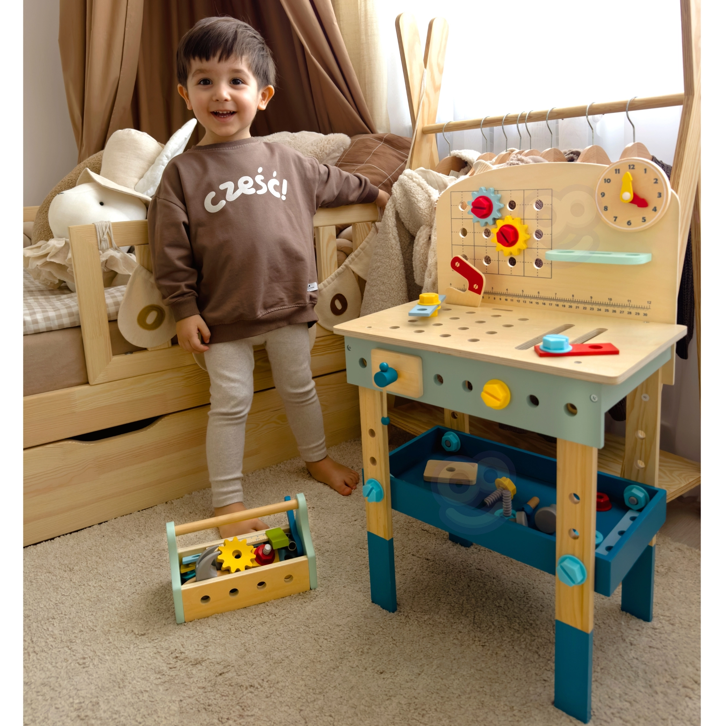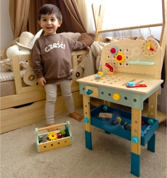 Pārskatāmas plauktiņas, āķi un darba virsma ļauj bērniem ērti glabāt un lietot zāģi, āmuriņu, atslēgu, skrūvgriezi un lineālu. Ideāli patstāvīgai spēlei un mācībām.