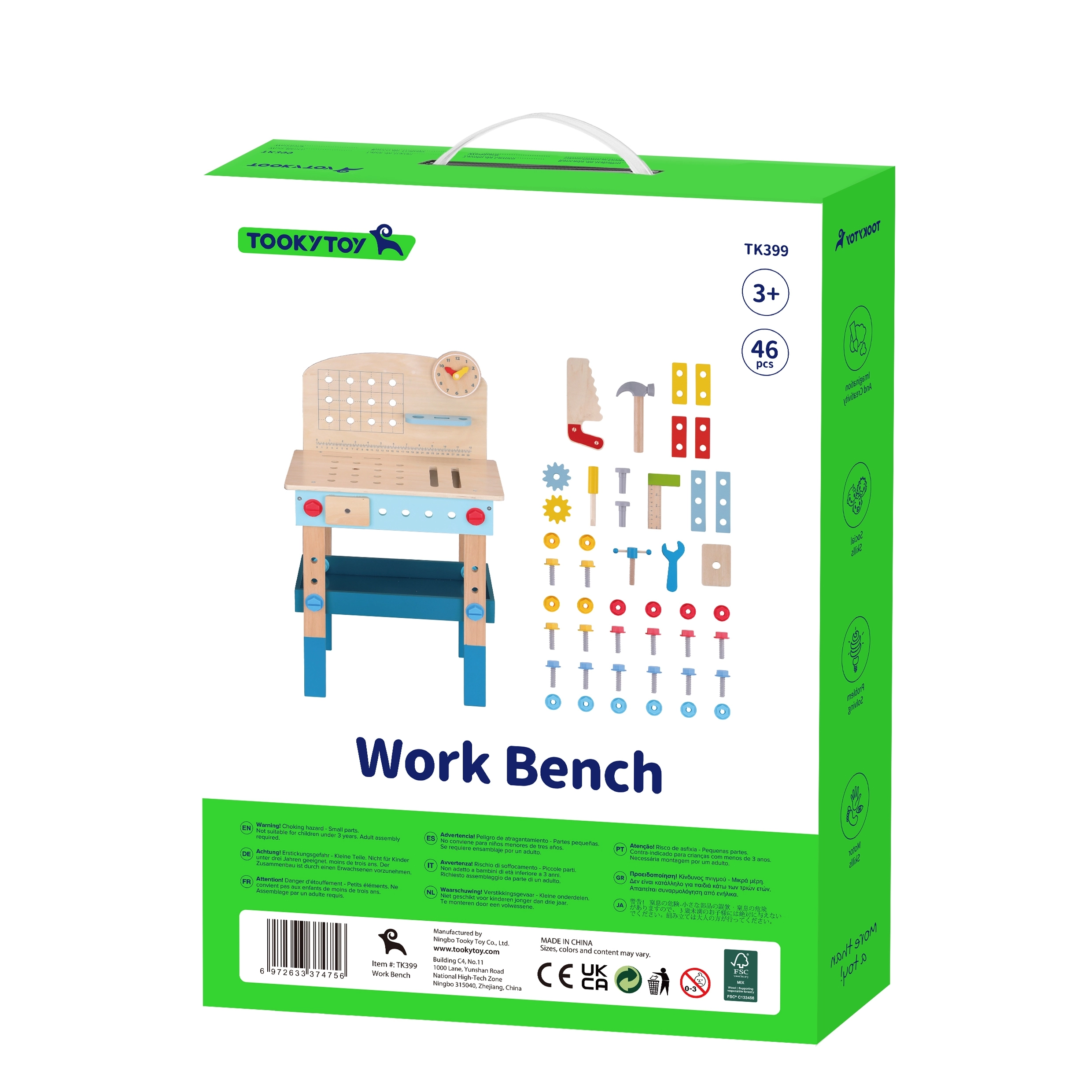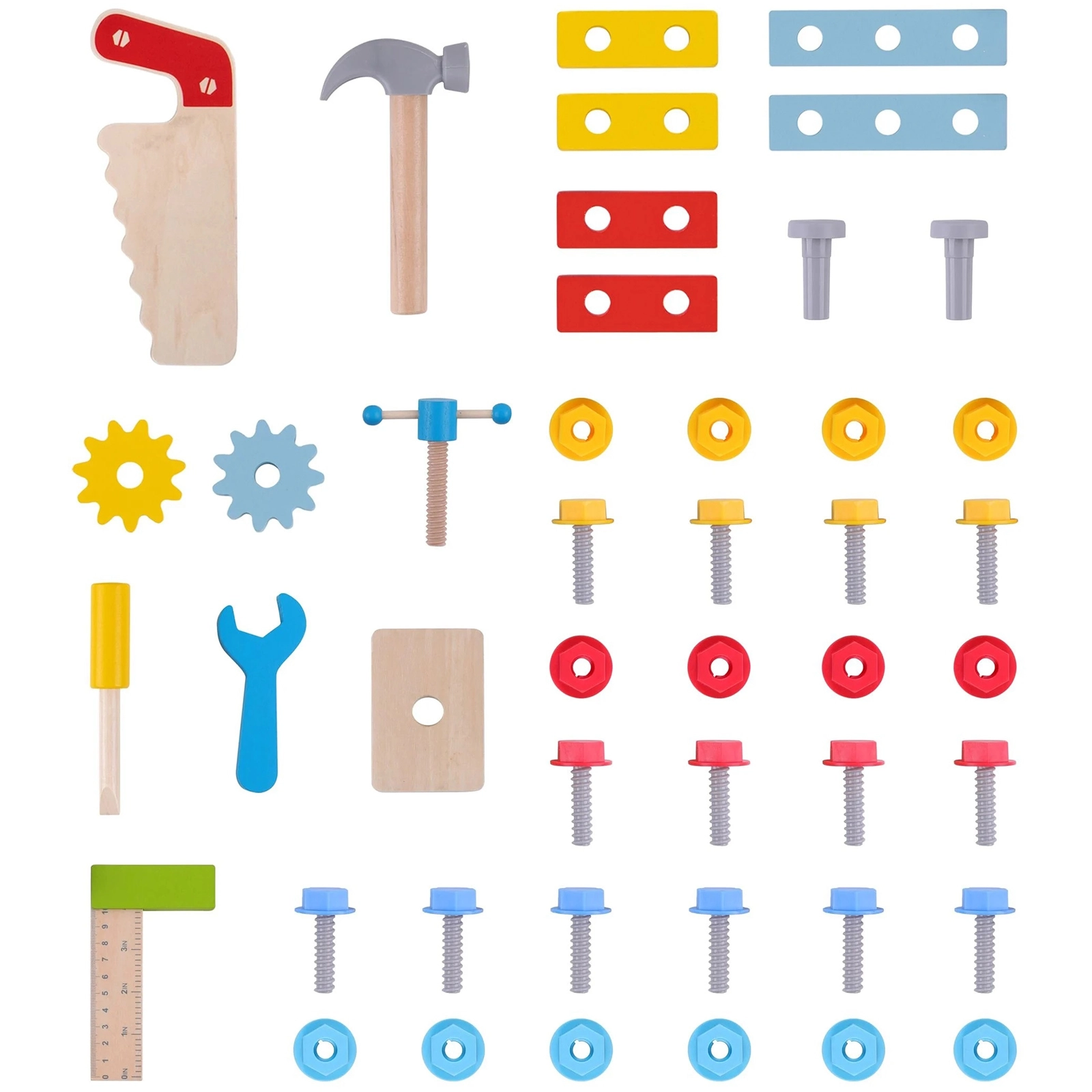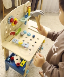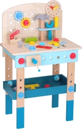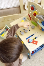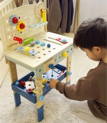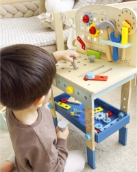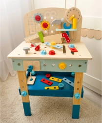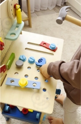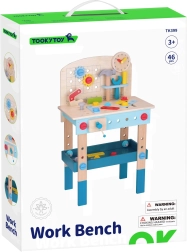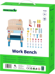 Bērnu koka darba sols no zīmola TOOKY TOY ir lielisks radošs instrumentu komplekts mazajiem meistariem no 3 gadu vecuma. Tas ietver bagātīgu rīku komplektu (zāģis, āmuriņš, atslēga, skrūvgriezis, skava, mērlente/lineāls) un krāsainas skrūves, uzgriežņus, paplāksnes un zobratus. Stabils izpildījums, droši noapaļotas malas un netoksiskas krāsas nodrošina patīkamu un drošu spēlēšanos, kā arī mācīšanos par darba ar instrumentiem pamatiem.