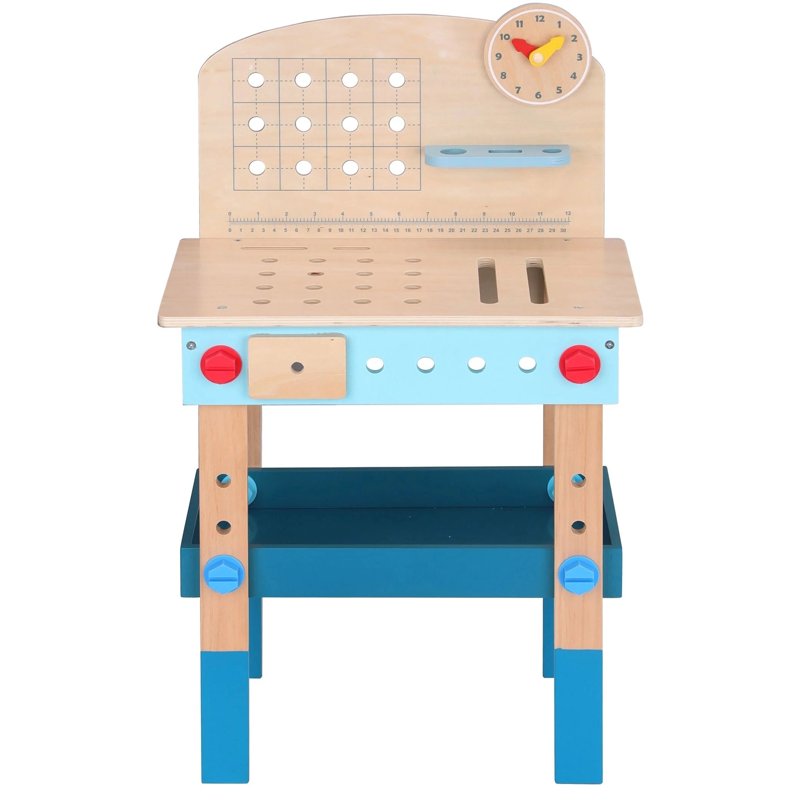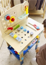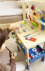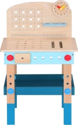 Atklājiet bērnu darbnīcas centru, kas apvieno izklaidi, izglītošanos un sīkās motorikas attīstību. Darba sols piedāvā pārskatāmus plauktus un turētājus, lai bērniem visas palīgierīces vienmēr būtu pa rokai. Ir iekļauts arī rotaļu pulksteņa ciparnīca un aizmugurējais panelis ar atverēm, kur var ieskrūvēt detaļas un zobratus.