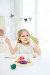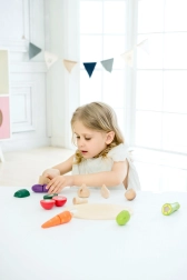 Rotaļas ar “pārtiku” veicina sīko motoriku, acu–roku koordināciju, radošumu un krāsu un formu atpazīšanu. Dabīgie materiāli un rūpīga izgatavošana nodrošina ilgu kalpošanu un drošību ikdienas spēlēs.