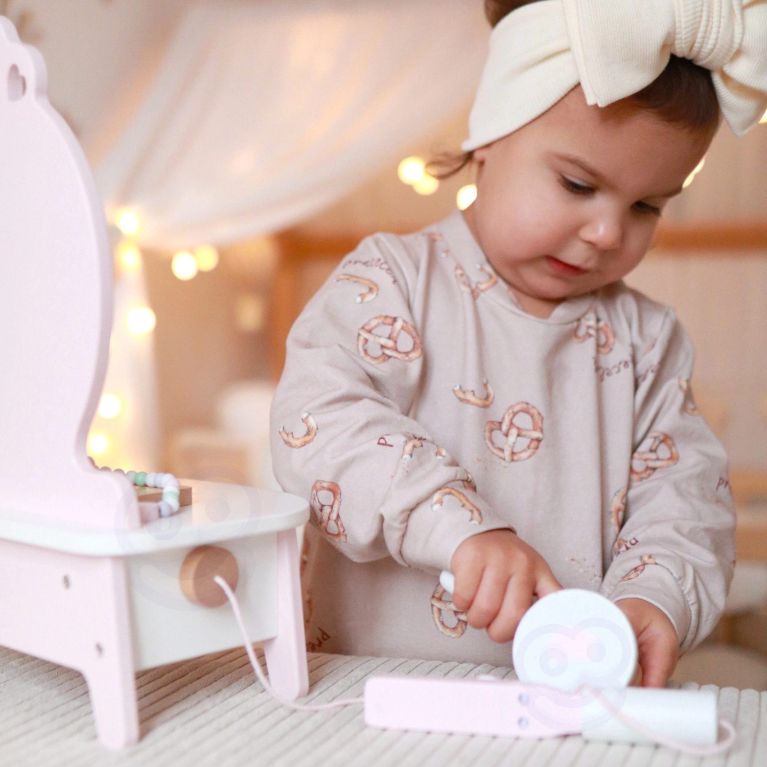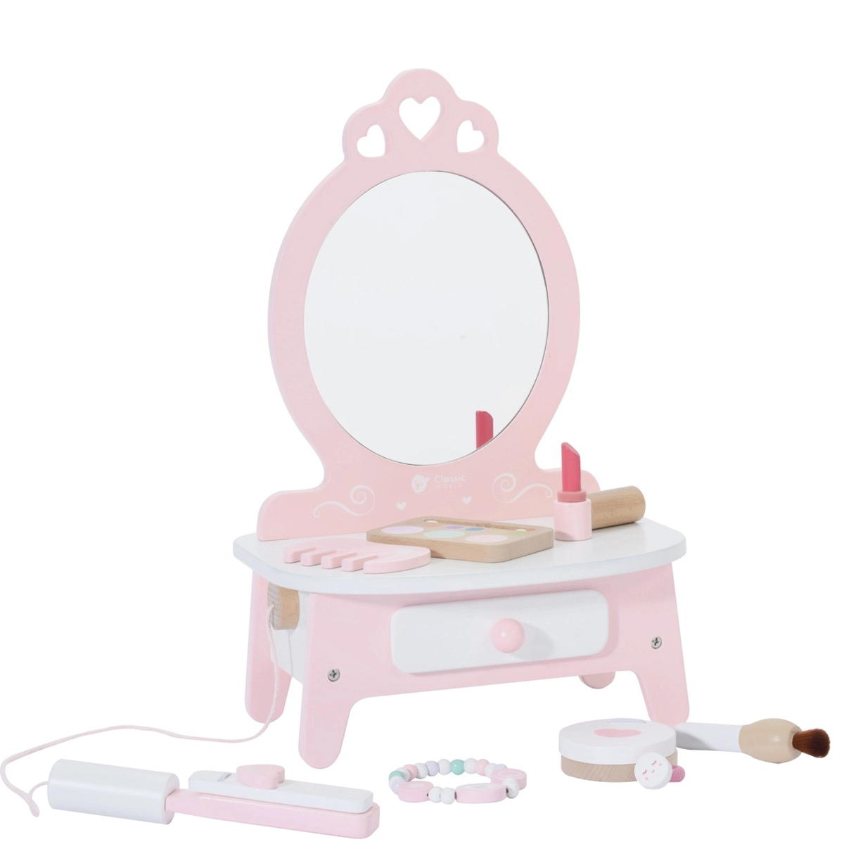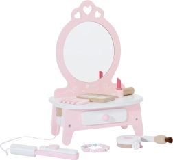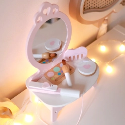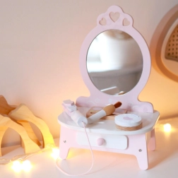 Šis skaistais bērnu tualetes galdiņš rozā krāsā ir aprīkots ar spoguli un 11 dažādiem piederumiem, tostarp ķemmi, lūpu krāsu, matu taisnotāju, pūderdosi un citiem. Visi piederumi ir izgatavoti no kvalitatīva koka, un to pasteļtoņu dizains piešķir rotaļlietai burvīgu izskatu. Galdiņš piedāvā pietiekami daudz vietas glabāšanai visiem jūsu mazās modeles slepenajiem kosmētikas knifiņiem.