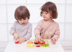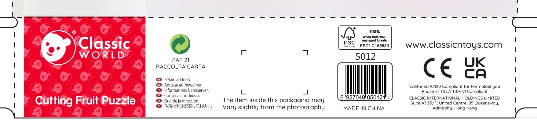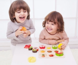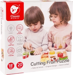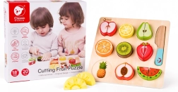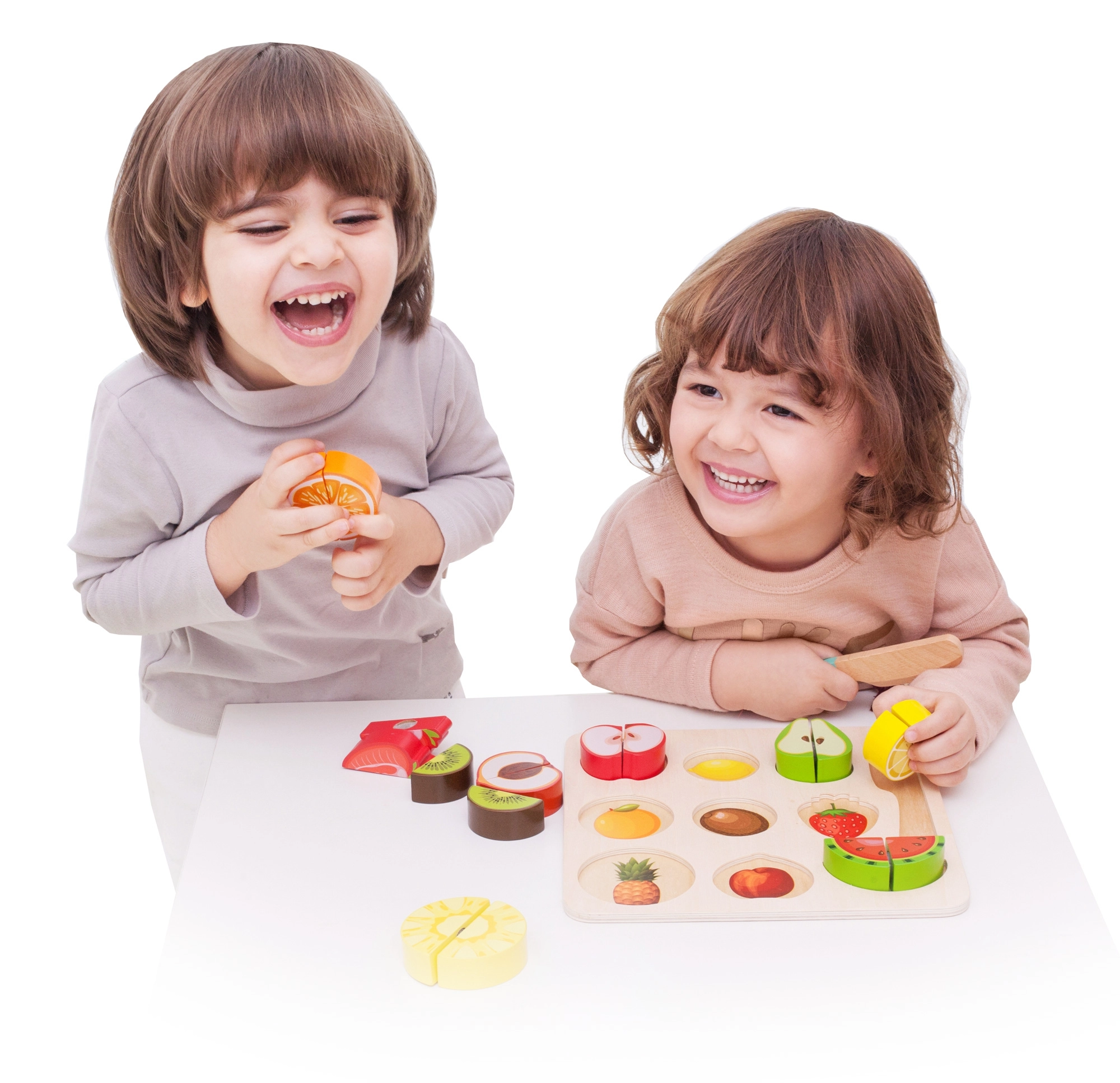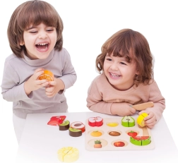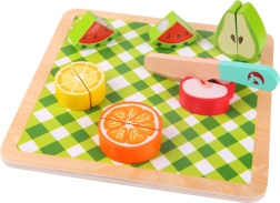 Komplektā ir 20 detaļas, tostarp abpusēja dēlīte, nazītis un dažādi augļi. Šī drošā rotaļlieta bērniem no 18 mēnešu vecuma ir izgatavota no lakota koka un krāsota ar netoksiskām krāsām, kas nodrošina pilnīgu drošību lietošanā.