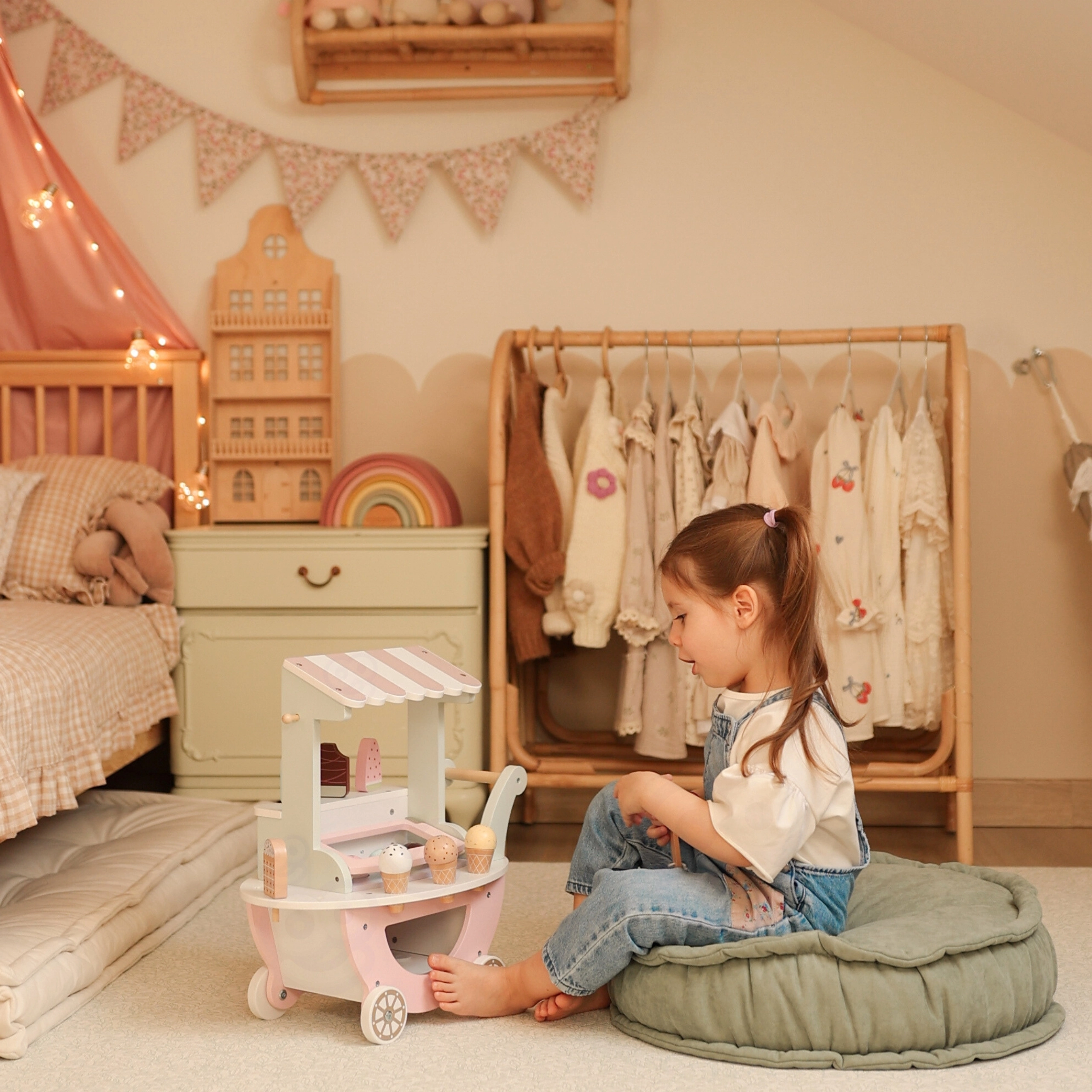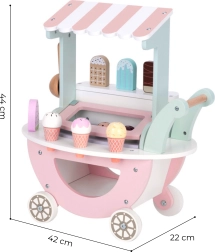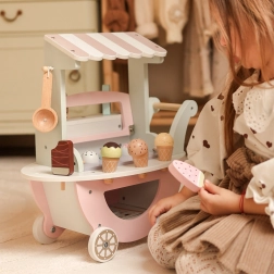 Koka saldējuma ratiņi Woopie Green ir ne tikai skaists priekšmets maigos pasteļtoņos, bet arī pilns iespējām radošai spēlei. Jūsu bērns var kļūt par pārdevēju, klientu vai pat “saldējuma meistaru” un veidot savus saldējuma salikumus pēc fantāzijas!