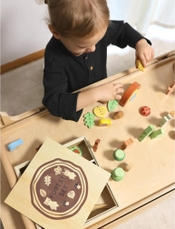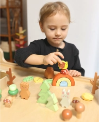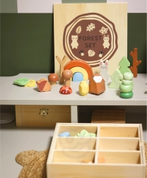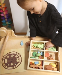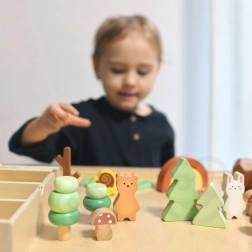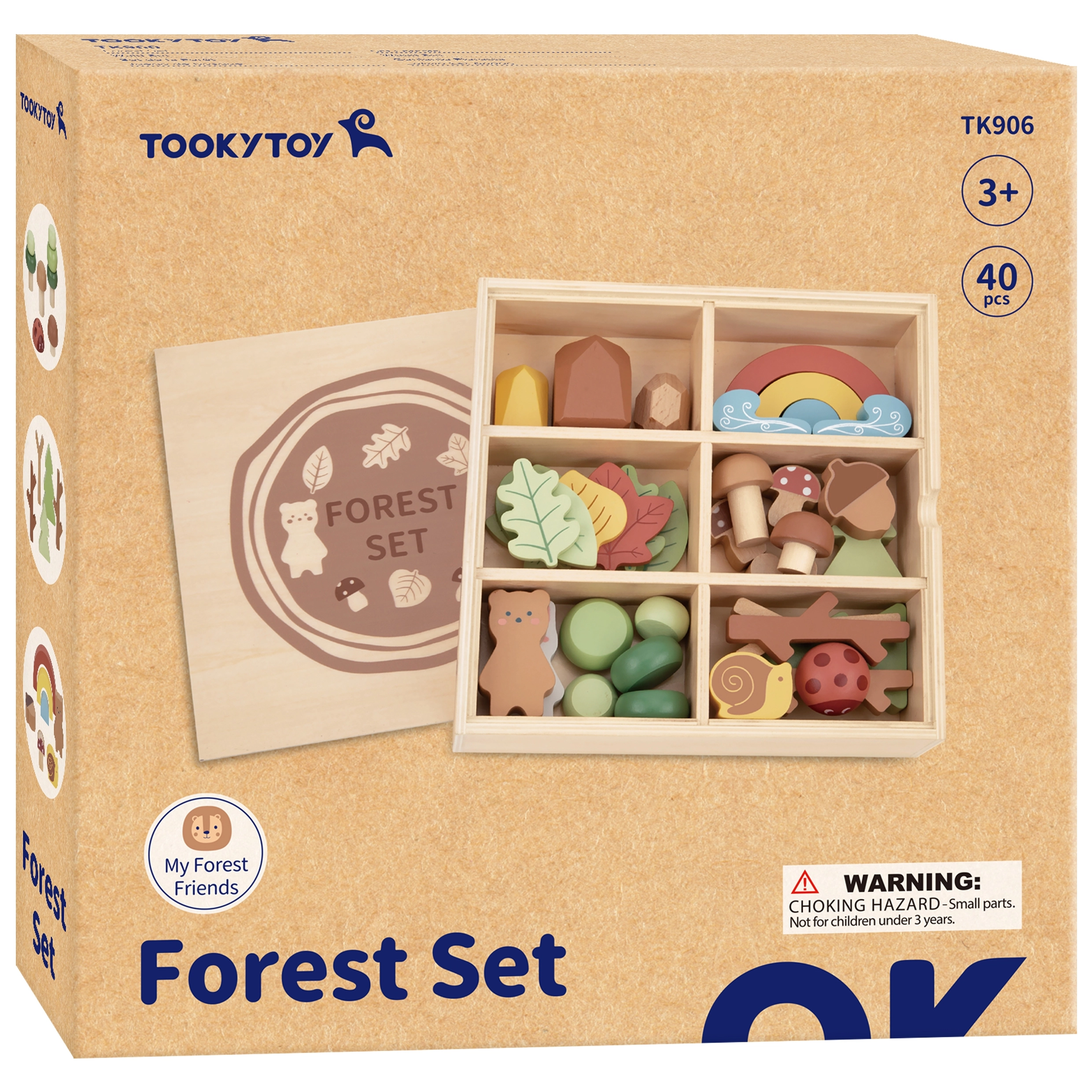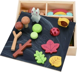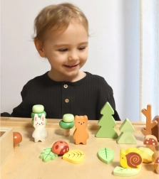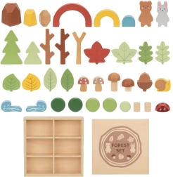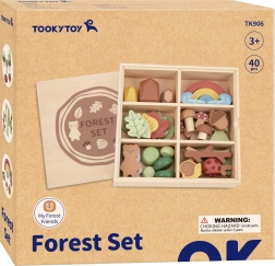 Koka Meža komplekts no Tooky Toy ir veidots bērnu radošai izklaidei. Tas ietver dažādus meža elementus, kas ļauj šķirot, kraut un būvēt, veicinot unikālas meža vides veidošanu.