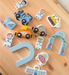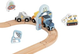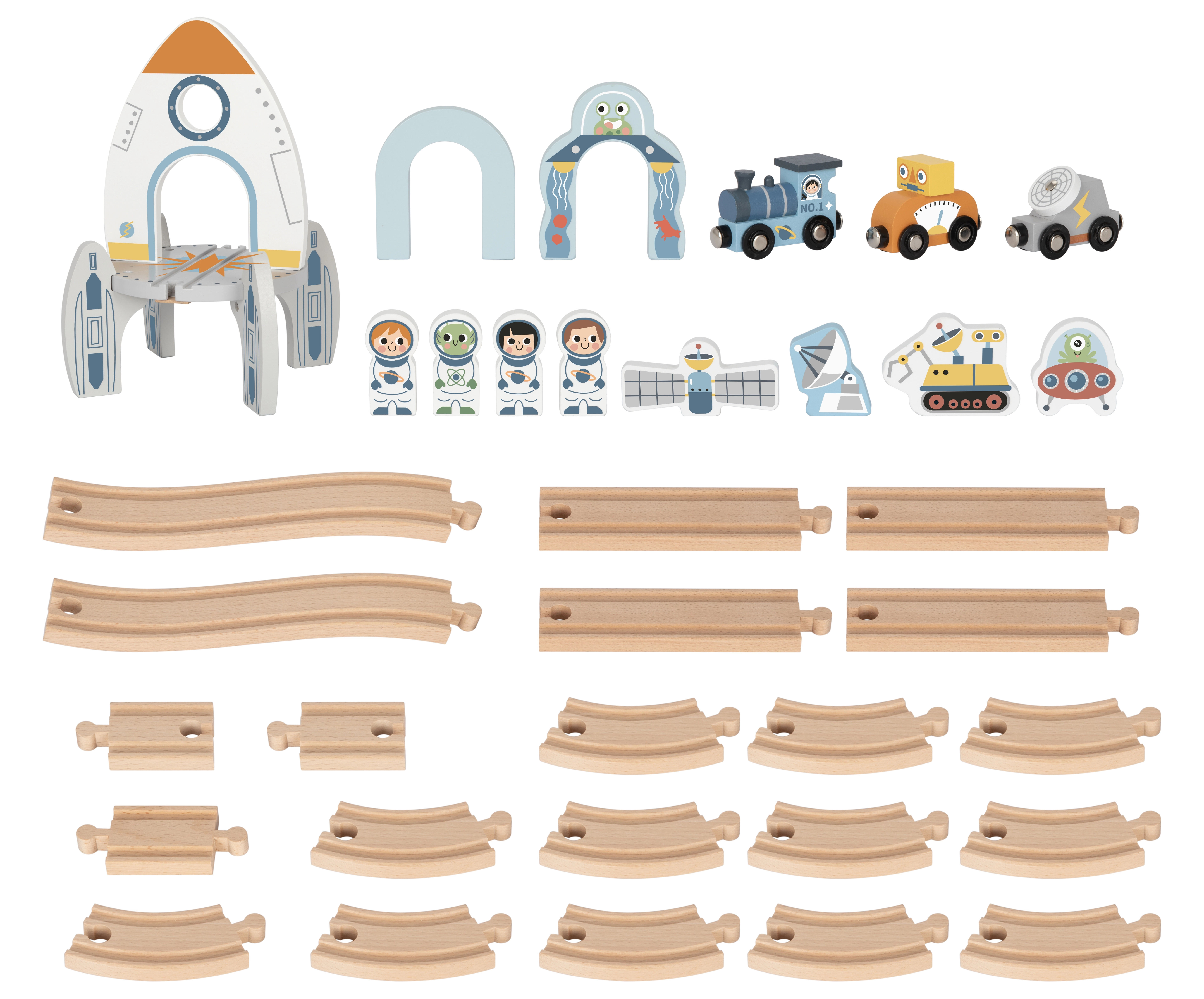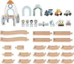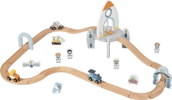 Šī koka kosmiskā vilciena trase aizraus bērnus ar kosmosa tematiskajiem elementiem, piemēram, astronautu figūriņām, kosmisko sondi, roveru un lidojošo šķīvīti. Daudzlīmeņu trases izkārtojums piešķir spēlei dinamiku. Trases centrālais elements ir liela kosmiskā raķete, kas kalpo gan kā dekoratīvs, gan konstrukcijas elements.