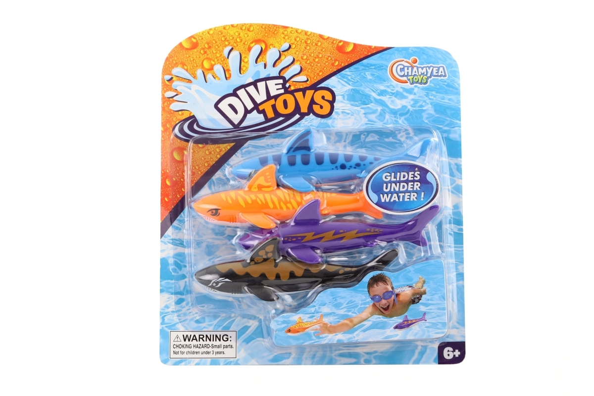 Komplektā atradīsiet 4 krāsainas haizivis no izturīgas plastmasas, kuras var mest ūdenī un savākt, trenējot ieniršanu un elpas kontroli. Tās ir lieliski piemērotas lietošanai mājas baseinā un peldēšanas kursos (vienmēr pieaugušā uzraudzībā).