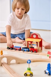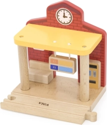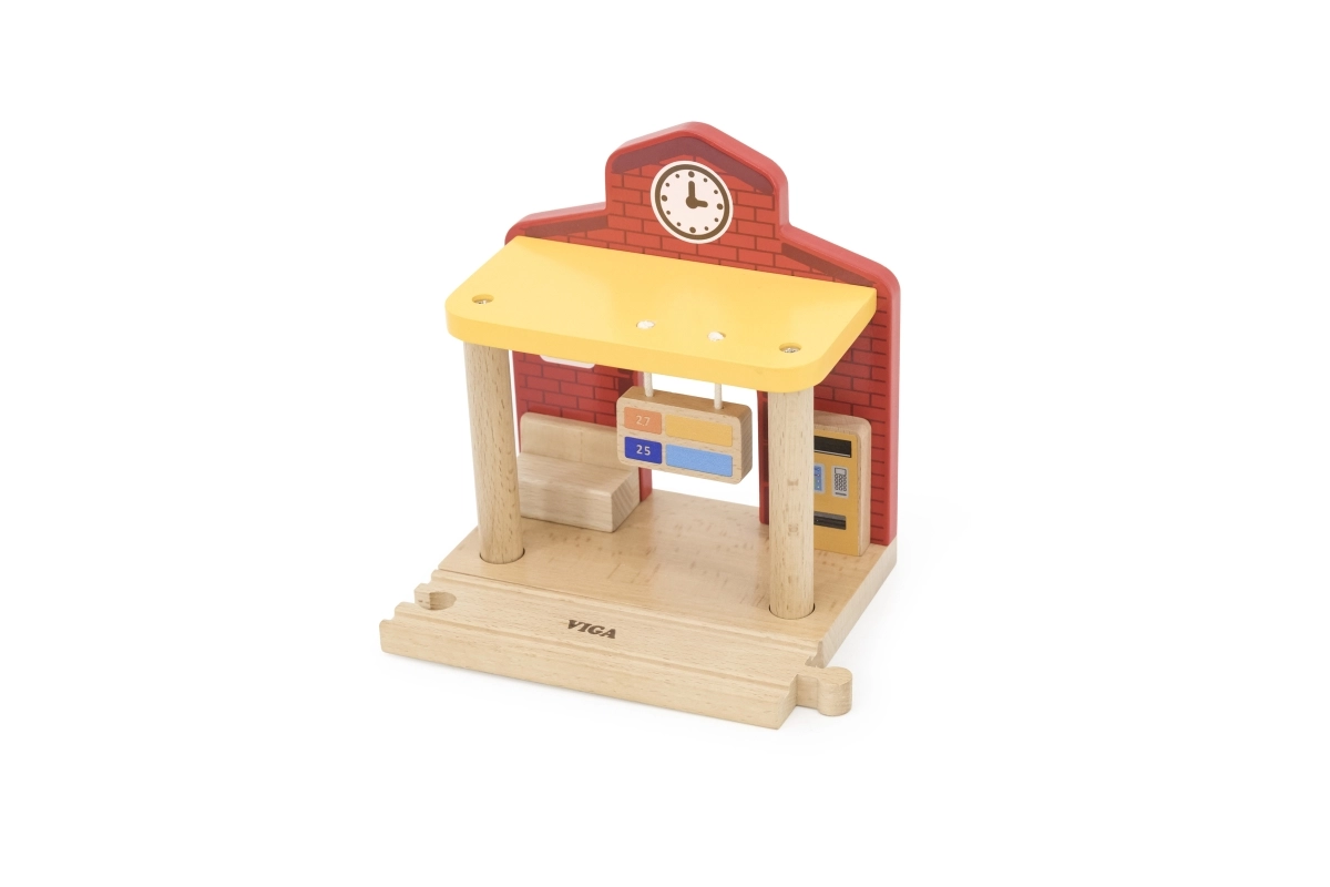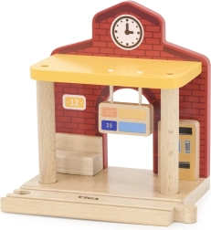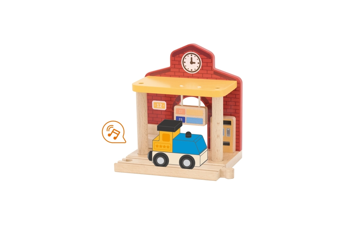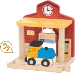 Papildiniet savu koka vilciena trasi ar kompaktu staciju, kas izceļas ar reālistiskām detaļām. Izturīga koka konstrukcija, viegli nolasāms pulksteņa ciparnīca un nojume rada autentisku dzelzceļa stacijas atmosfēru. Integrētie bateriju efekti izceļ katru pieturu un veicina interaktīvu spēli.