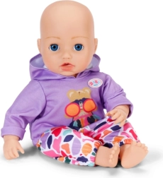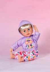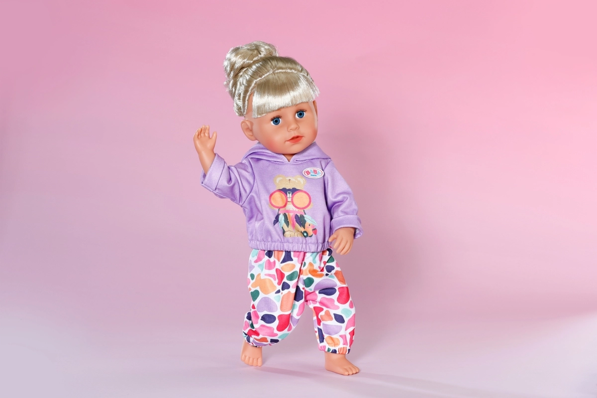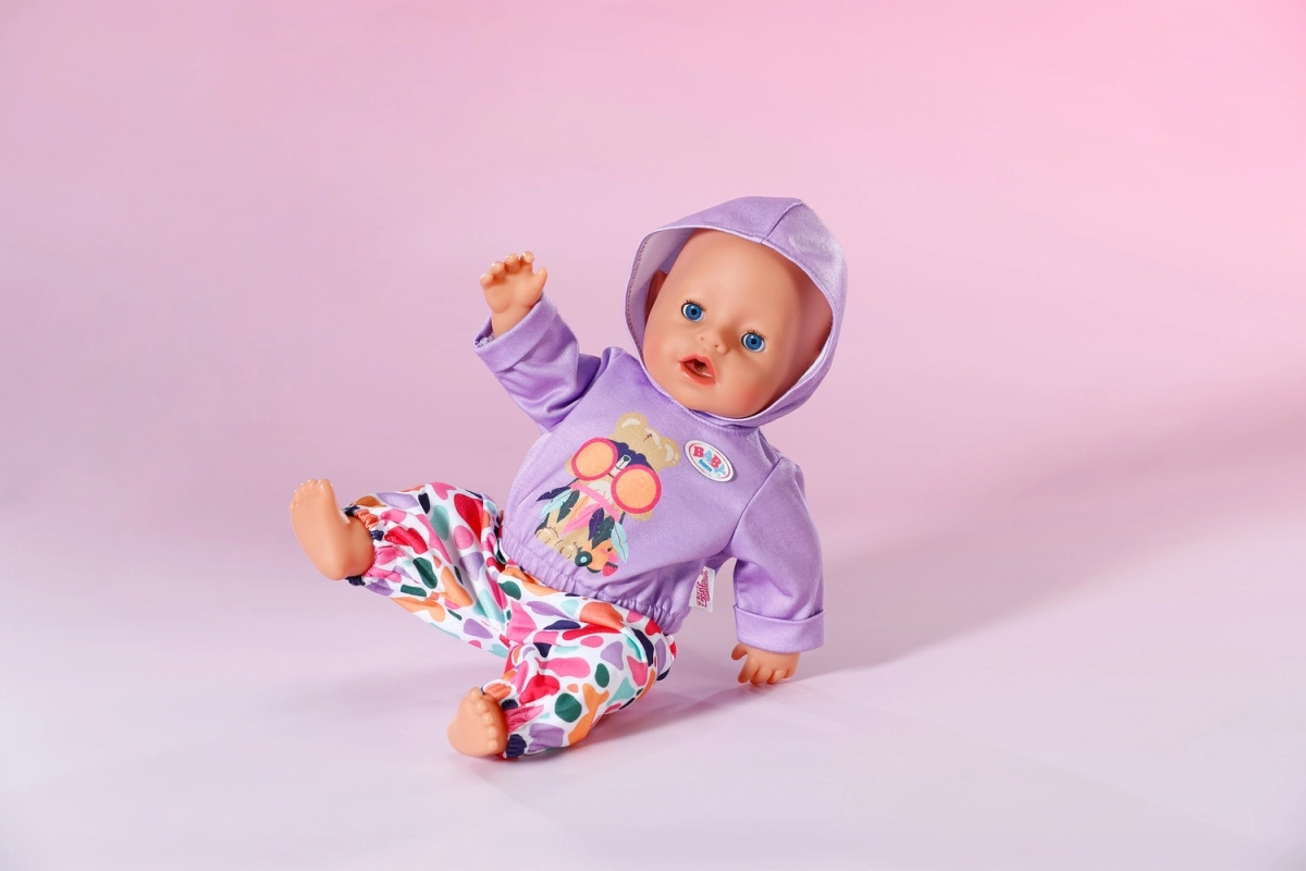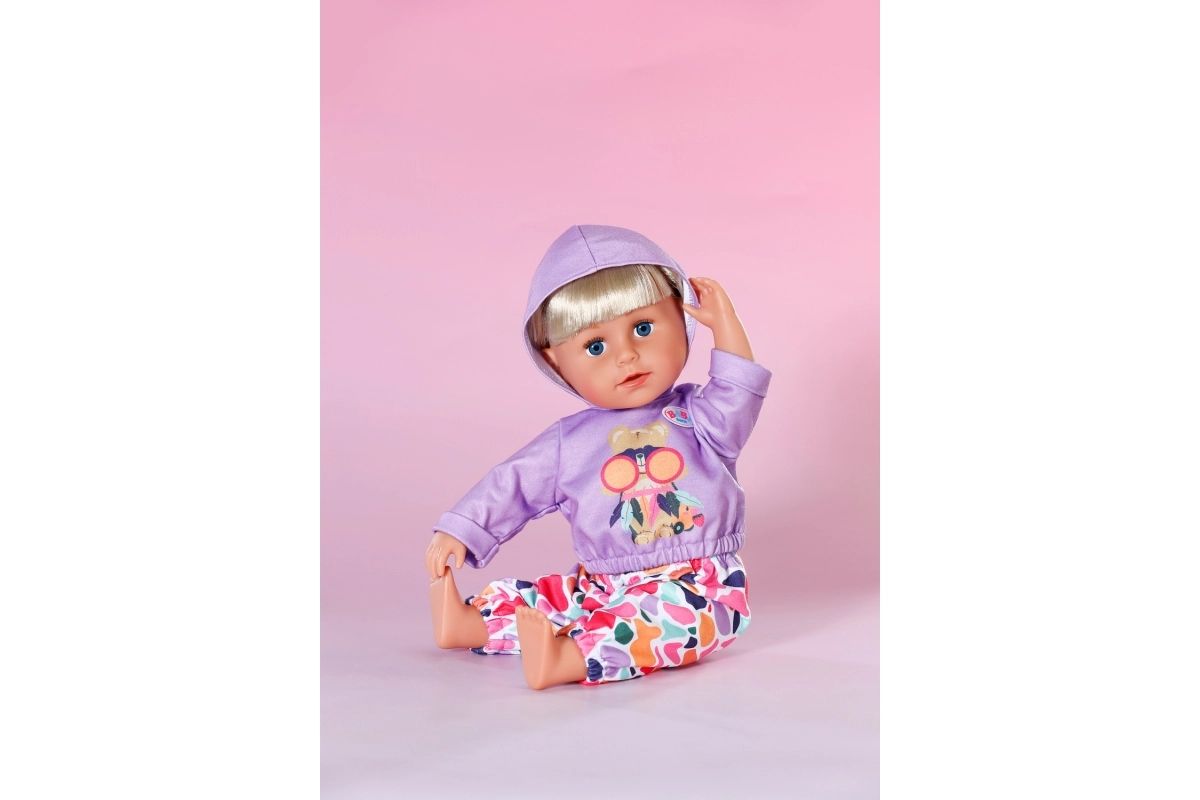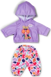 Stilīgs komplekts lellēm 43 cm izmērā: violeta kapučjaka ar jautru apdruku saskaņota ar krāsainām biksēm rotaļīgai kombinēšanai. Komplektā ir arī pakaramais no pārstrādāta materiāla. Tērps veicina radošu spēli, ir viegli uzvelkams un lieliski der arī BABY born Teddy.