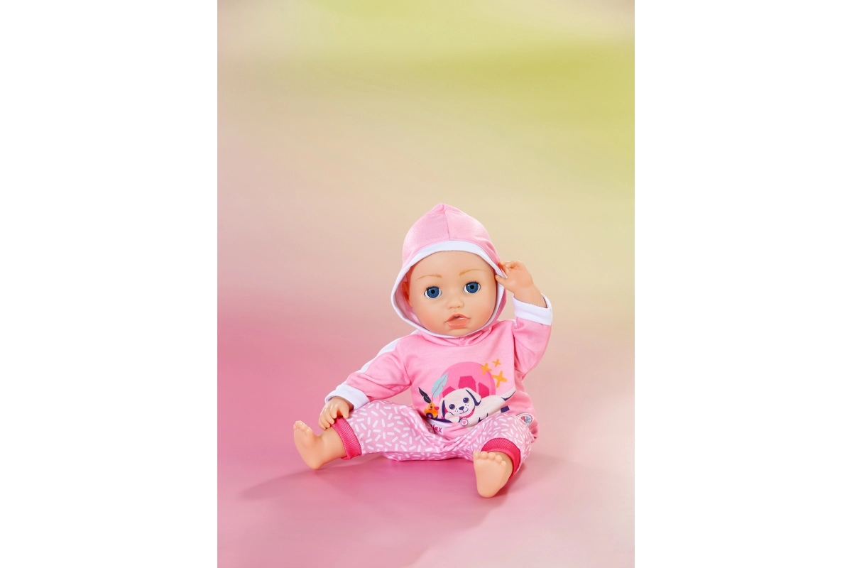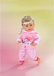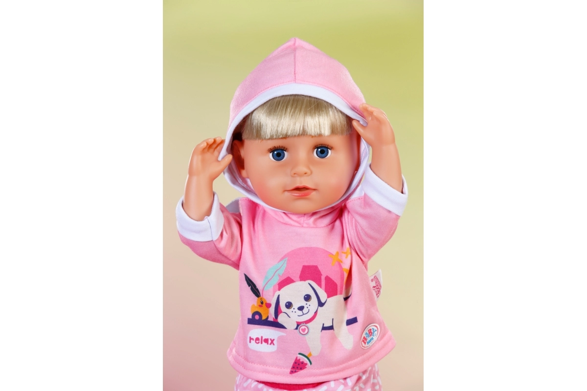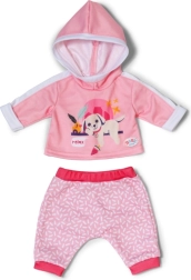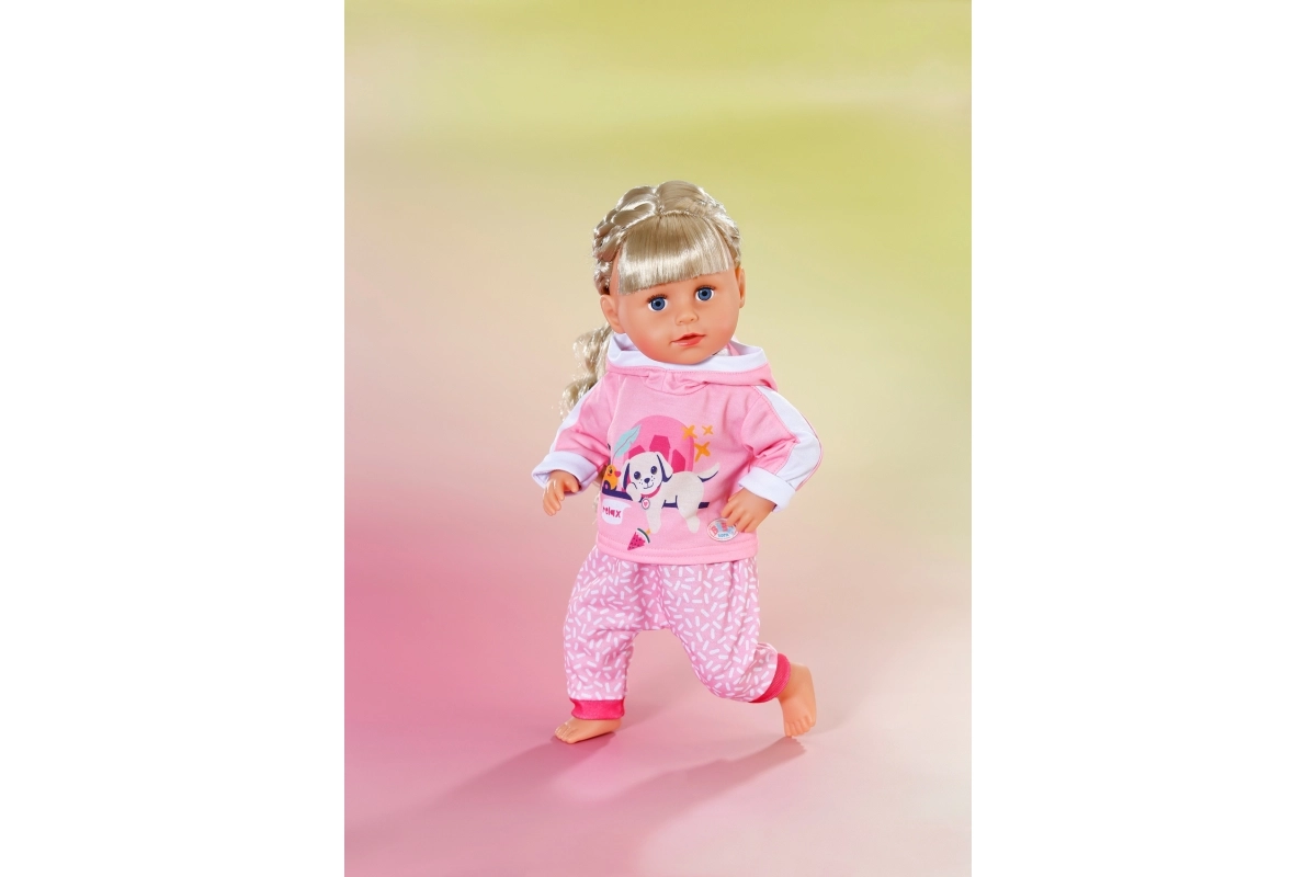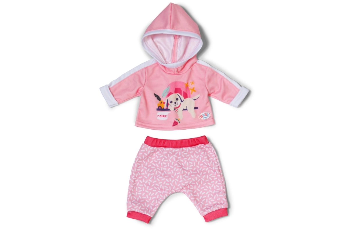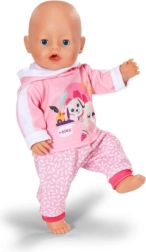 Šis rozā sporta tērps ir lielisks papildinājums BABY born 43 cm leļļu un BABY born Teddy lācīšu garderobei. Džemperis ar jauku atpūtoša sunīša apdruku un patīkamās bikses ar smalku rakstu nodrošina komfortu ikvienā piedzīvojumā. Pārdomātais piegriezums ļauj apģērbu viegli uzvilkt un novilkt.