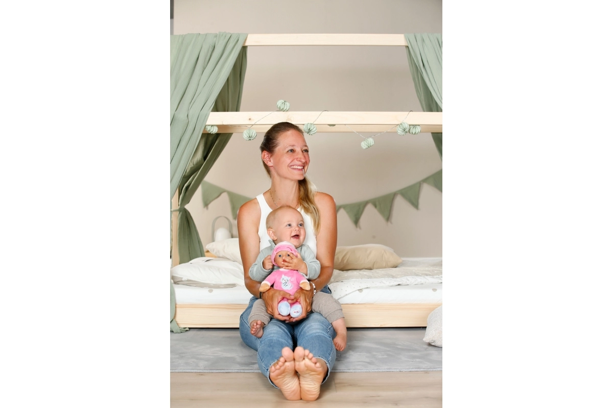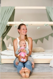 Izturīgos audumus var mazgāt ar rokām 30 °C temperatūrā. Drošs izpildījums bez sīkiem elementiem ir piemērots bērniem 0+.