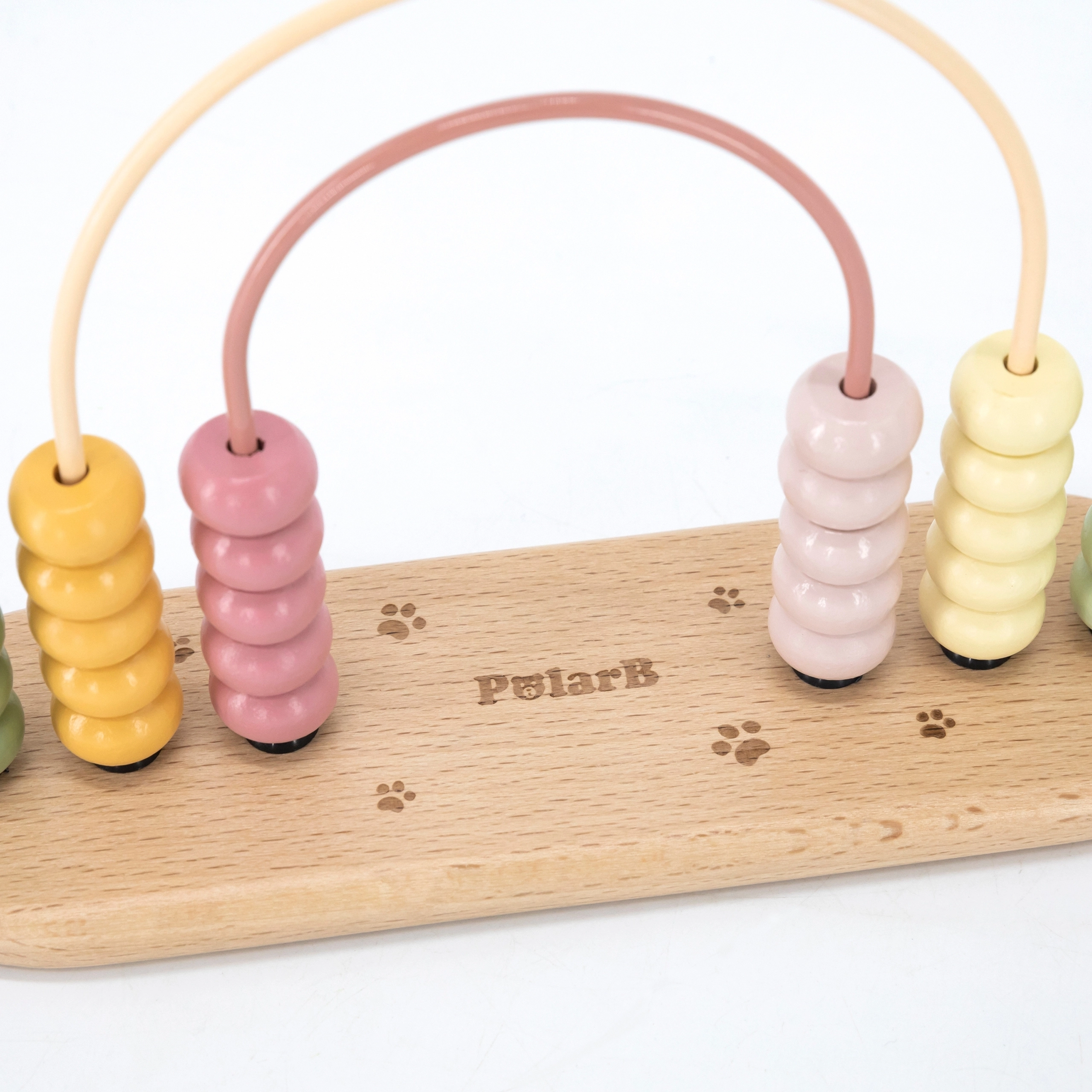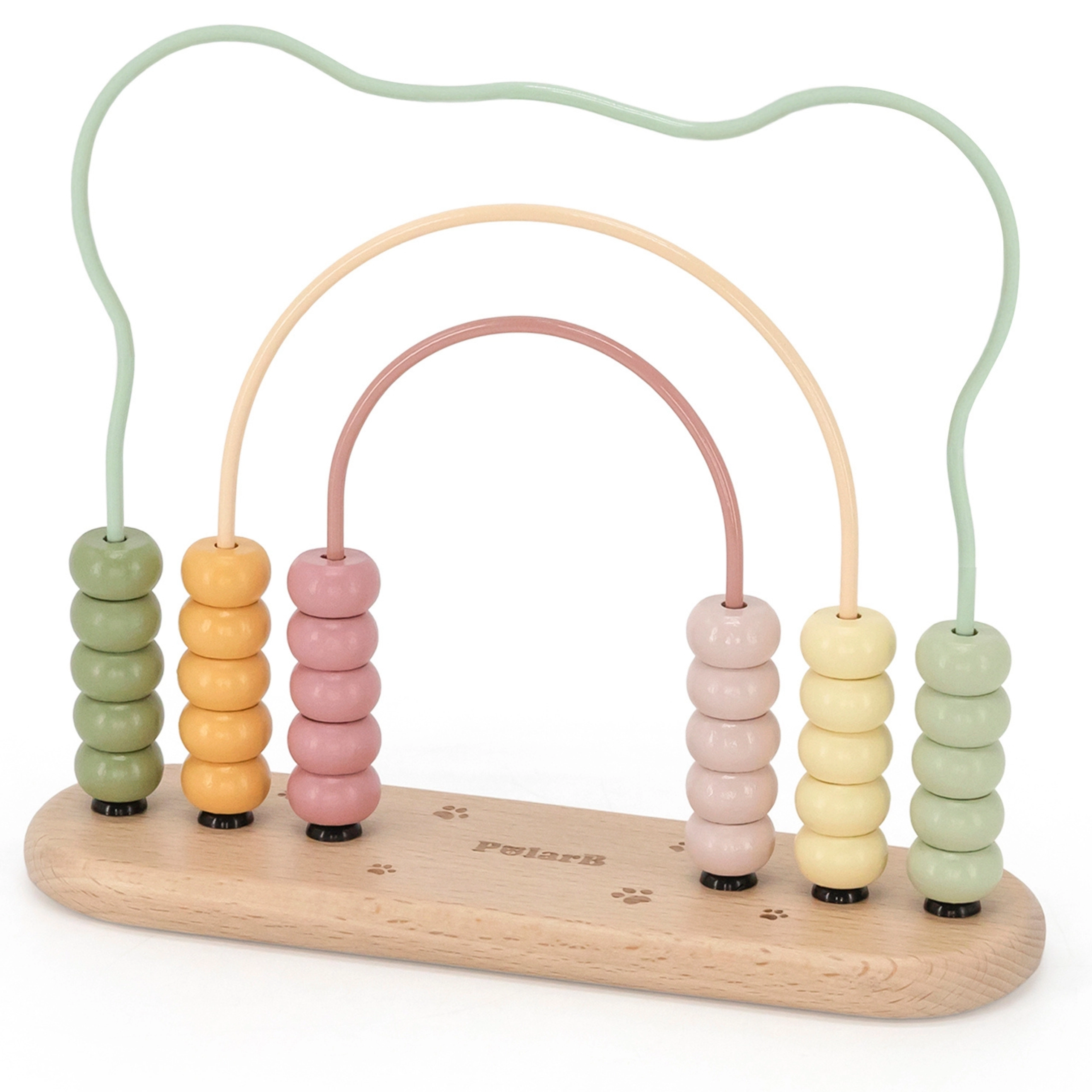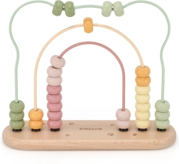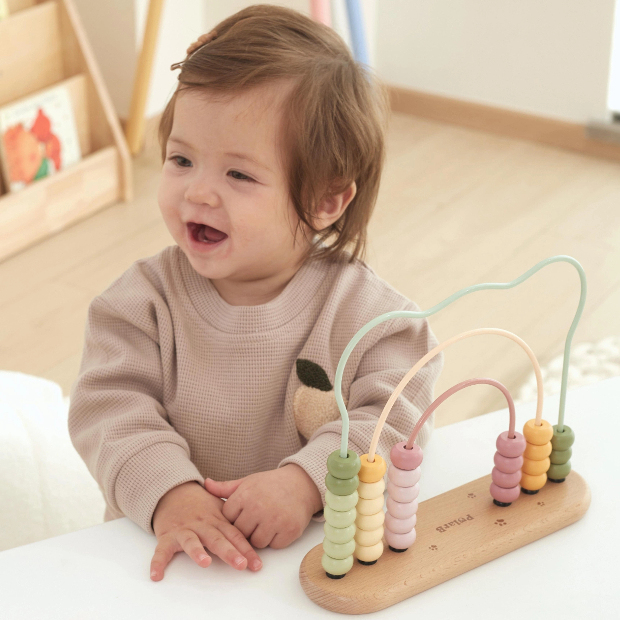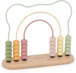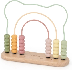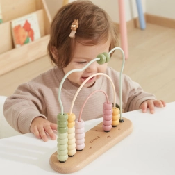 Pasteļtoņu krellītes uz līkumotām trasēm motivē bērnus atklāt skaitļus, šķirot un salīdzināt daudzumus – visu rotaļas veidā.