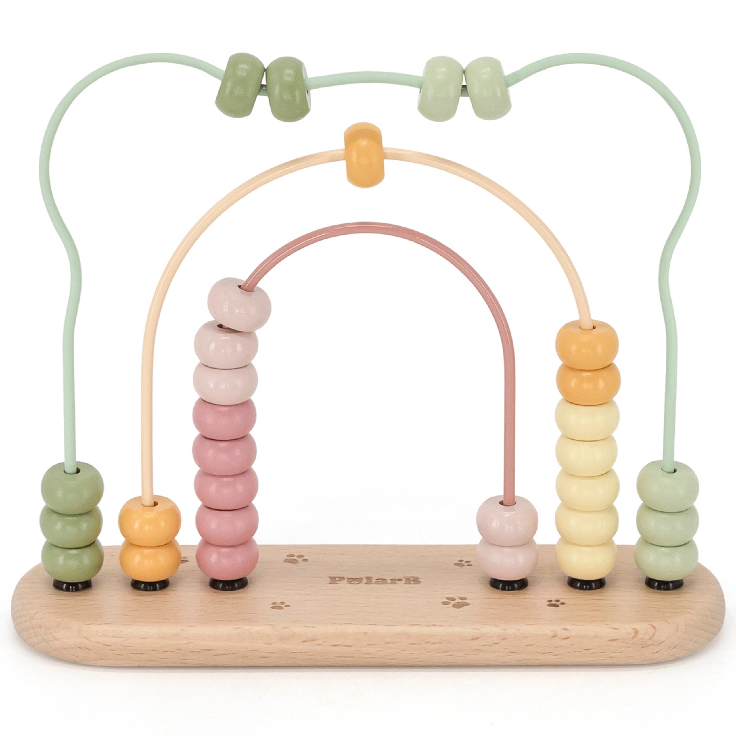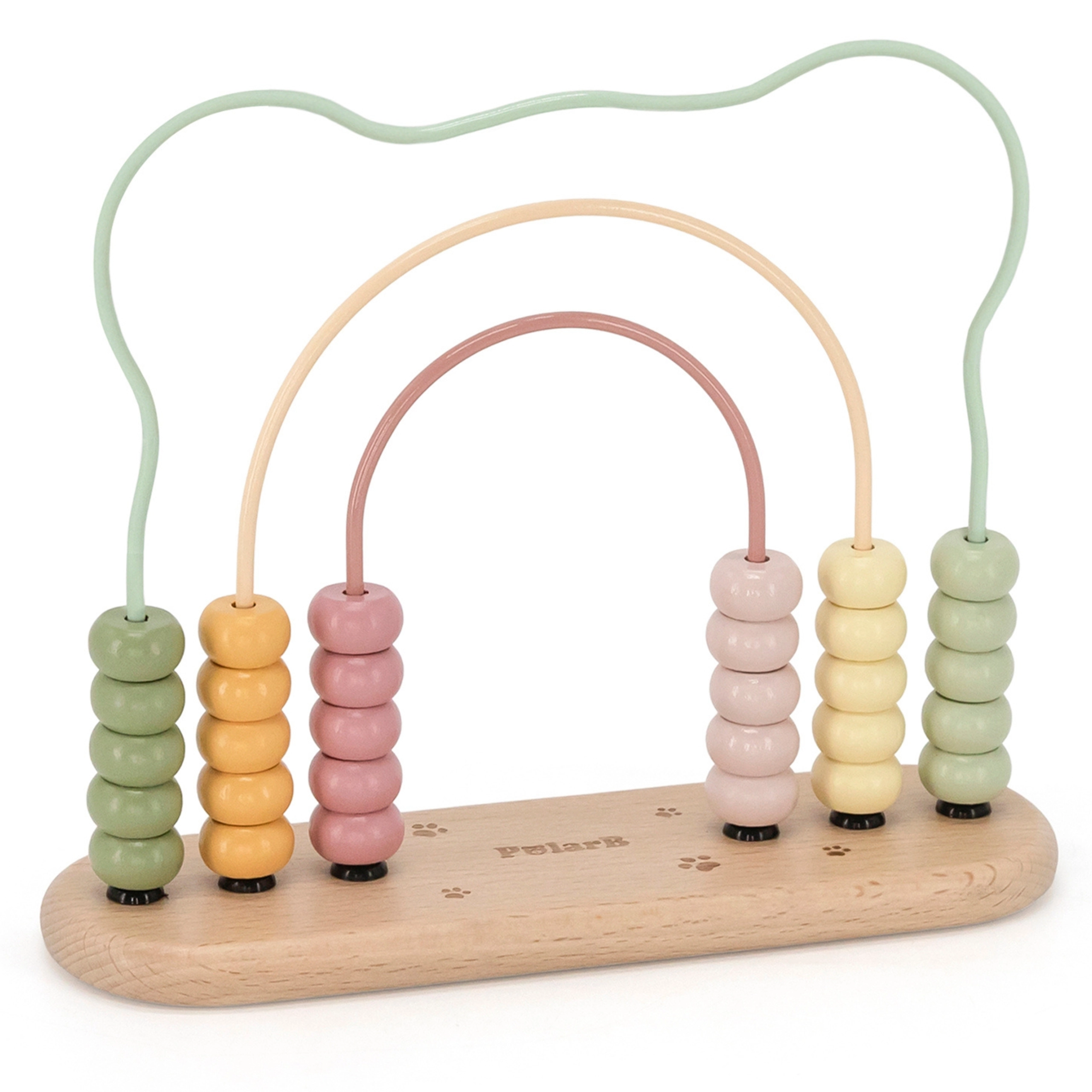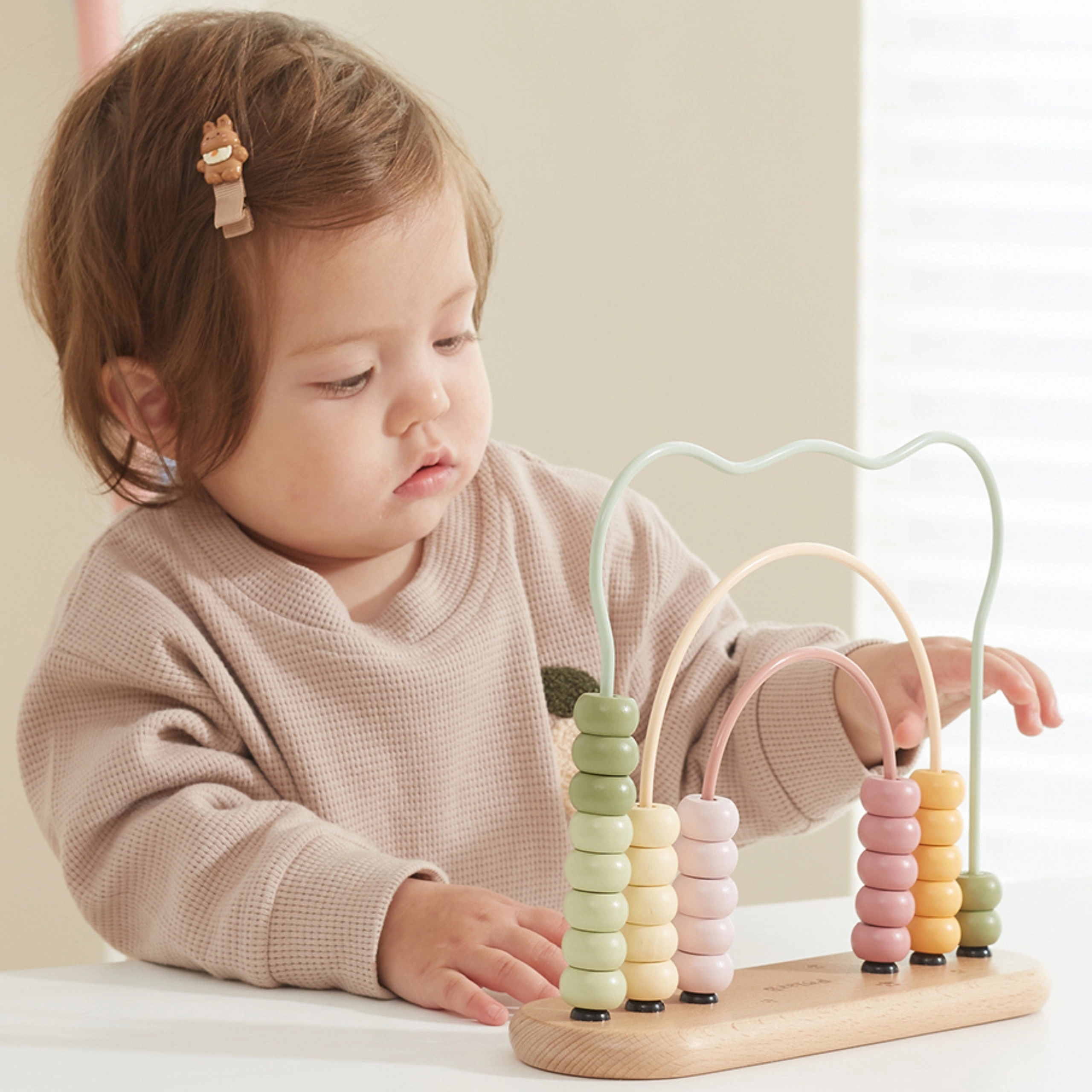 Pasteļtoņu krellītes uz līkumotām trasēm motivē bērnus atklāt skaitļus, šķirot un salīdzināt daudzumus – visu rotaļas veidā.