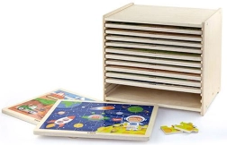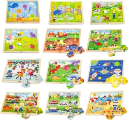 Atklājiet mācīšanās prieku caur spēli ar Viga koka puzlēm. Komplektā ietilpst 12 rāmja puzles ar 24 detaļām un praktisks koka statīvs. Veicina acu–roku koordināciju, loģisko domāšanu un bērnu iztēli. Drošas krāsas, izturīgs koks un jauki attēli motivē bērnus uz pacietību un koncentrēšanos.