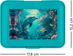 Uzkodu kārbu rotā košs un rotaļīgs delfīna un koraļļu rifa dizains, kas patiks visām vecuma grupām.
