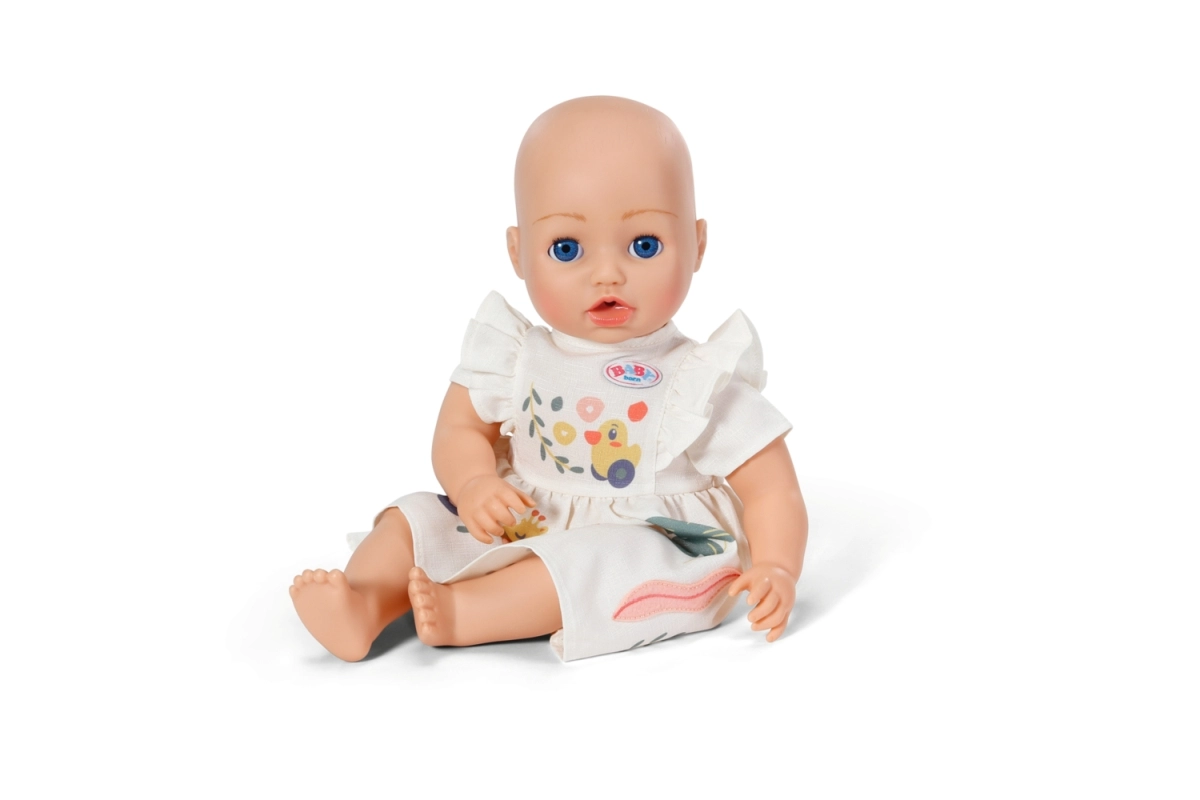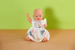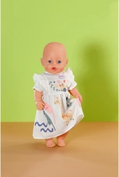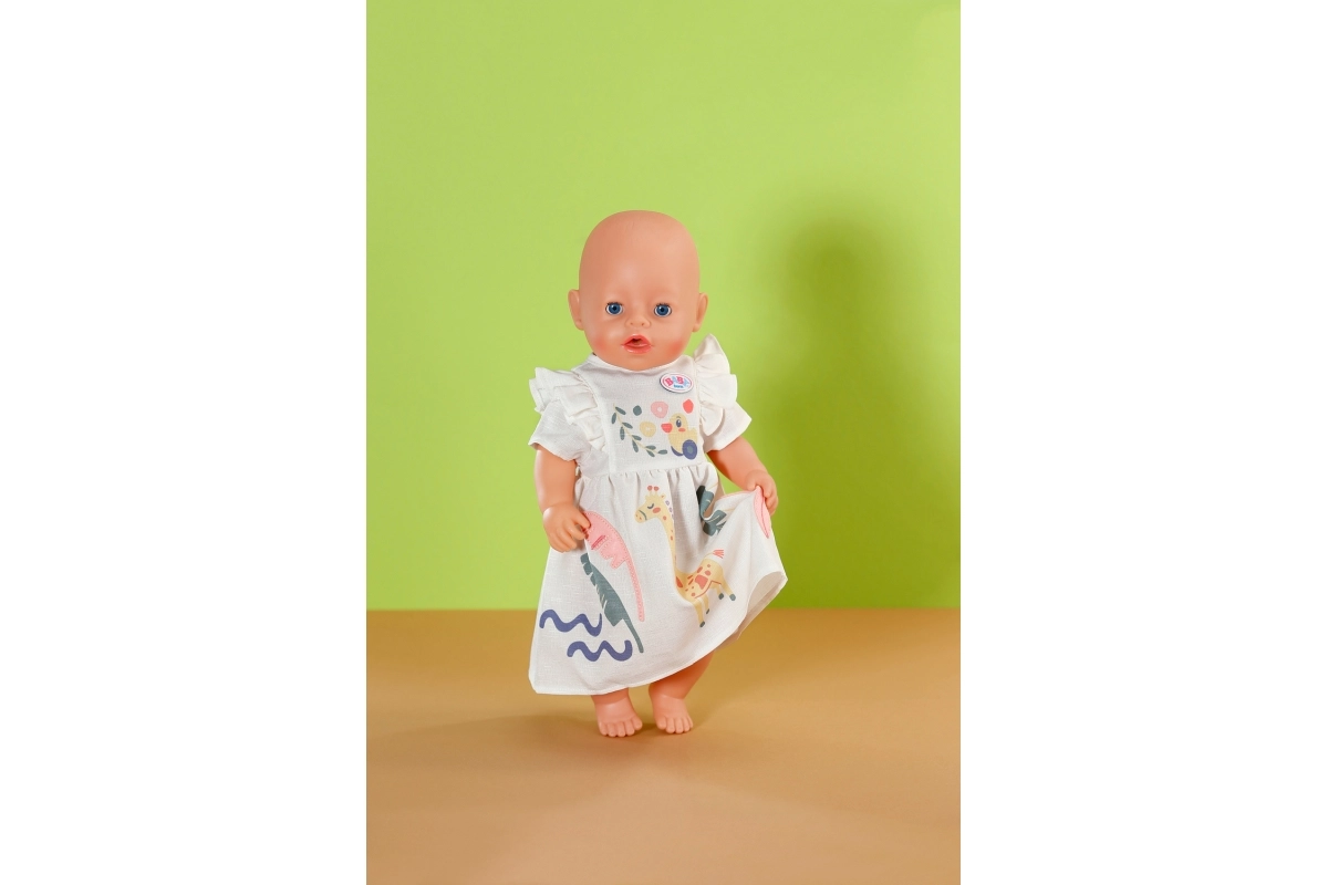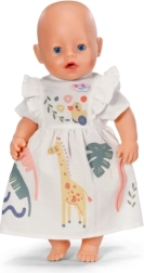 Kleita ir saderīga ar BABY born lellēm 43 cm un arī ar BABY born Teddy. Komplektā ir praktisks pakaramais no pārstrādāta materiāla, kas māca bērniem rūpēties par apģērbiem un uzturēt kārtību lelles skapītī.