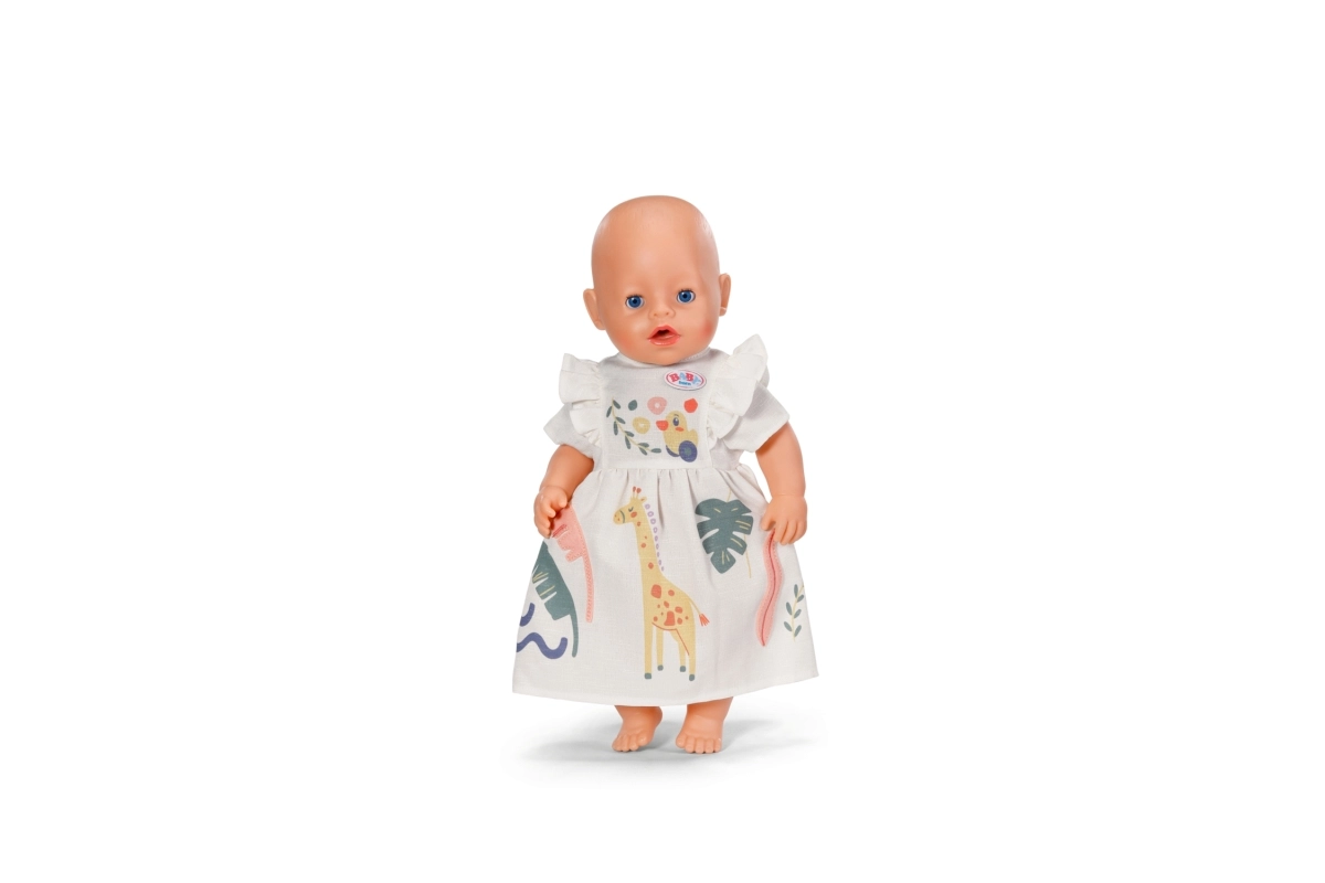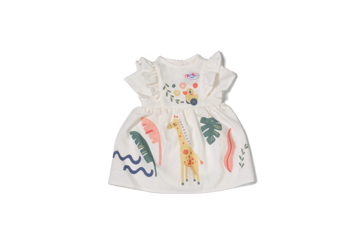 Mīlīga, viegla un rotaļīga kleitiņa BABY born lellēm 43 cm izmērā priecēs ar košu safari apdruku un volānu piedurknēm. Ideāli saulainām dienām un radošām rotaļām. Komplektā ir pakaramais no pārstrādāta materiāla. Vasaras kleita lellēm 43 cm, safari motīvs ar žirafi, volānu piedurknes, pakaramais no pārstrādāta materiāla.