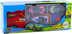 Liels kravas auto un trīs sporta mašīnītes košās krāsās — ideāla dāvana bērniem no 3 gadu vecuma.