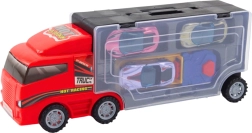 Šis sarkanais kravas auto ar garāžu un palaidēju ir lieliska izvēle bērniem, kuri mīl auto, sacīkstes un modeļu kolekcionēšanu. Caurspīdīgā piekabes daļa ļauj viegli redzēt ievietotās mašīnītes, bet nodalījumi veicina kārtību un patstāvību spēlē.