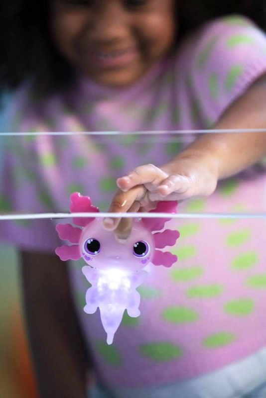 Pelde vai spēlēšanās pie izlietnes pārvēršas burvīgā šovā – aksolotls, iemērkts ūdenī, iemirdzas un aizrauj bērnus ar savām krāsām.