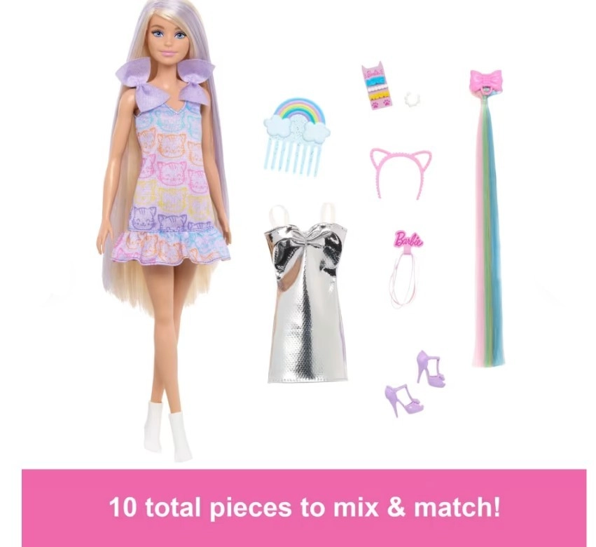 - Aksesuāri ietver sprādzi ar varavīksnes krāsas matiem, stīpiņu ar kaķa ausīm, gumiju komplektu un matu spraužu komplektu.