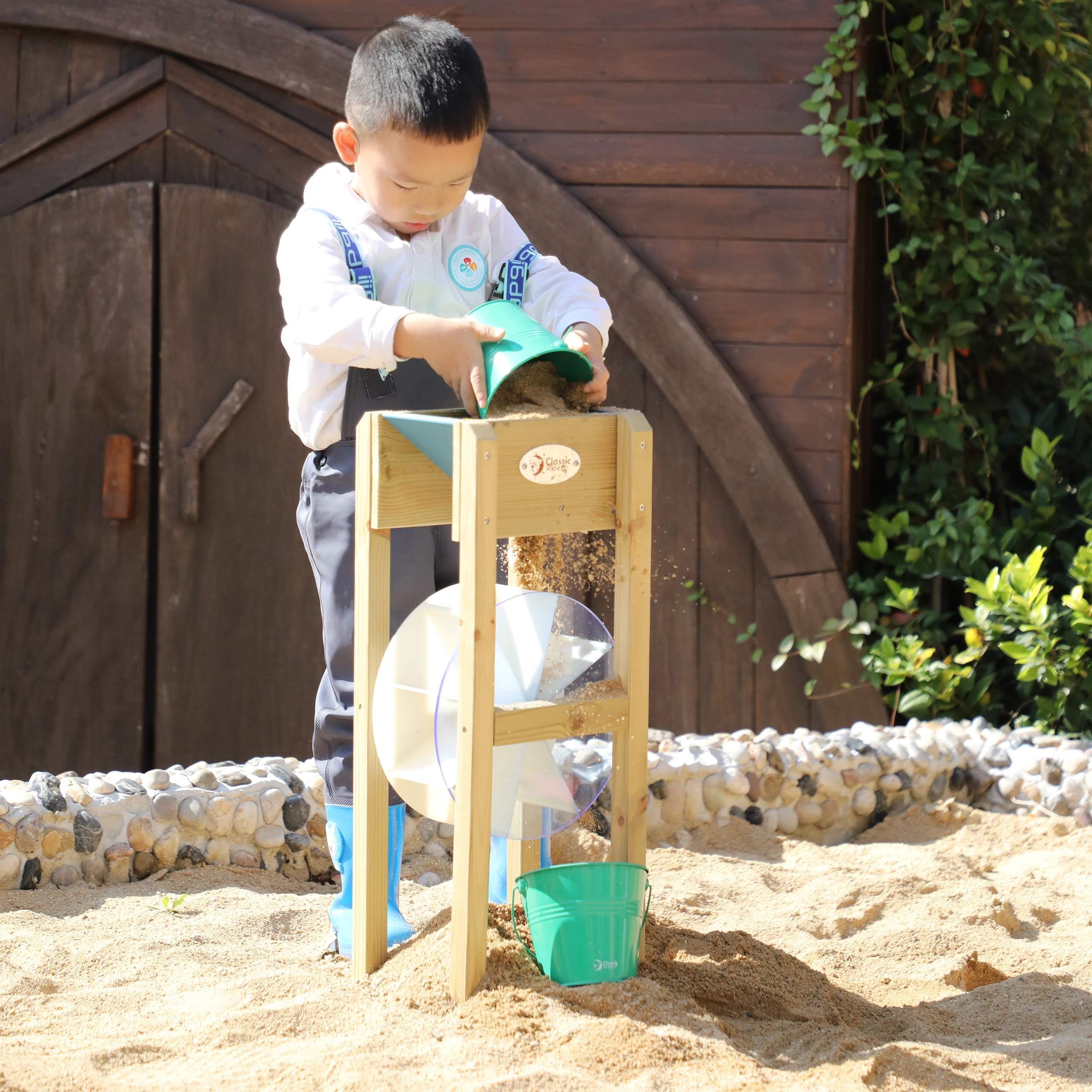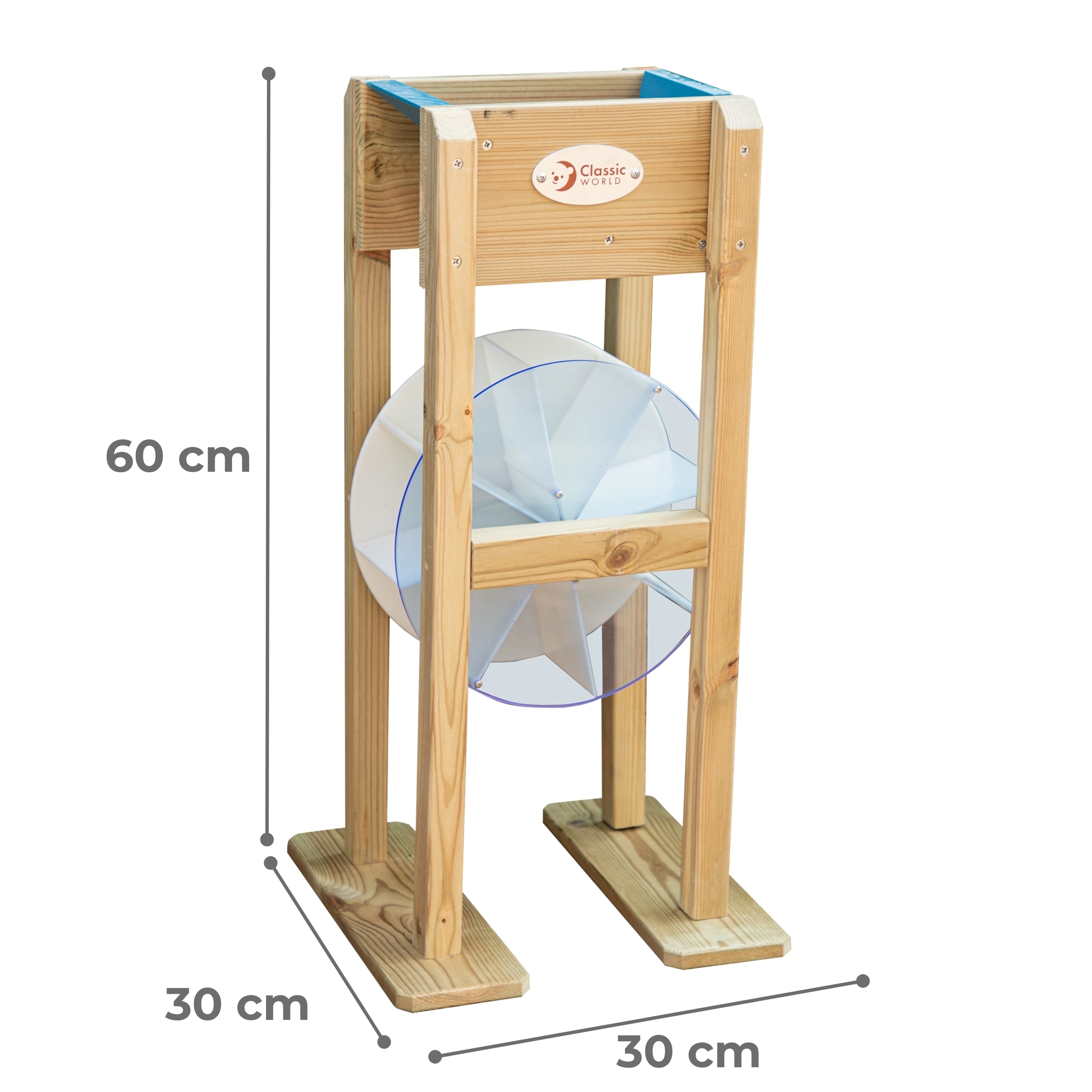Koka dzirnaviņas CLASSIC WORLD EDU ir lielisks papildinājums jebkurai smilšu kastei un ūdens spēļu zonai dārzā. Bērni viegli apgūst plūsmas un riteņa griešanās principus – pietiek iebērt smiltis vai ieliet ūdeni un vērot, kā zilais rats sāk griezties. Pateicoties izturīgām koka sānu sienām un stabilai pamatnei, dzirnaviņas ir gatavas ikdienas bērnu eksperimentiem.