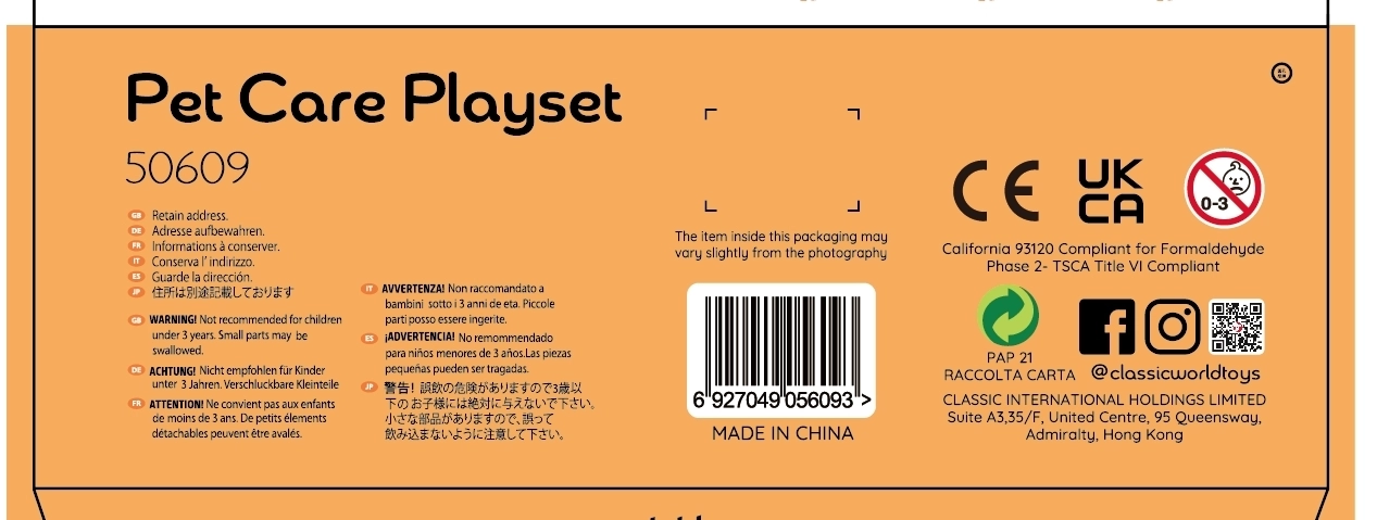 Bērnu komplekts no zīmola CLASSIC WORLD piedāvā visu nepieciešamo reālistiskai veterinārārsta lomspēlei un rūpēm par mājdzīvniekiem. Tas ietver 15 detaļas, tostarp bļodiņu, barību, birsti, fēnu, šķēres, kaklasiksnu un pārnēsājamu somu. Veicina profesionālu lomspēli, attīsta empātiju, atbildības sajūtu un sīko motoriku. Ideāli piemērots bērniem no 3 gadu vecuma.