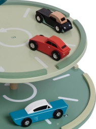 Atklājiet retro šarmu no zelta auto ēras. Šī daudzstāvu koka autostāvvieta nodrošina plūdenu kustību visos līmeņos – bērni ved mašīnītes augšup pa lifteres šahtu, laižas lejup pa spirālveida rampām, piestāj pie automazgātavas un degvielas sūkņa, kā arī nolaižas uz jumta helipada. Izturīga koka konstrukcija ar gludām malām ir droša un patīkama pieskārienam.