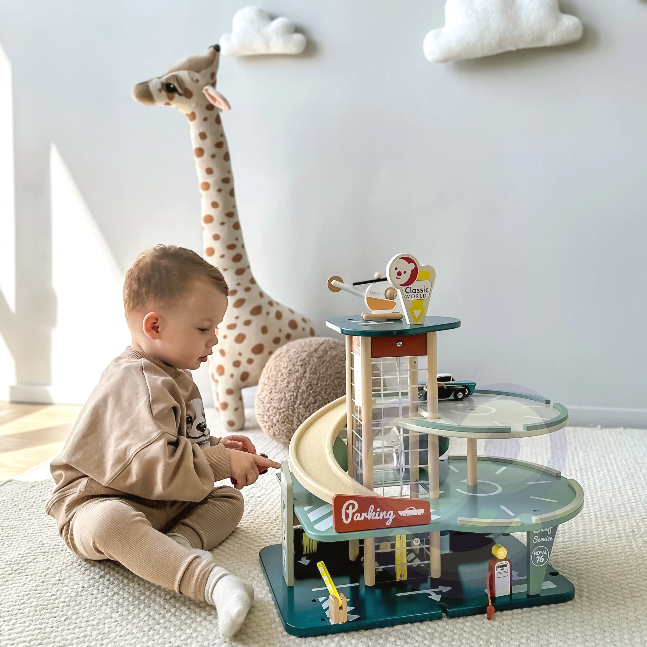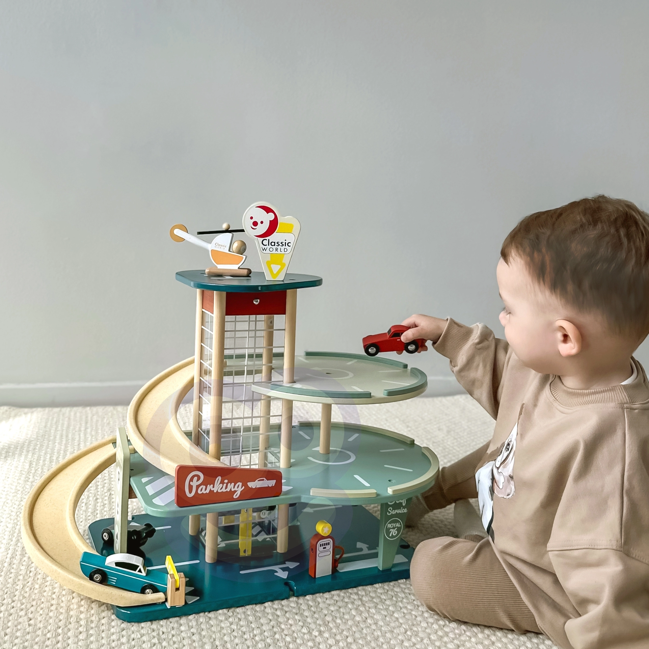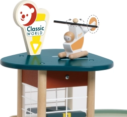 Stilīga 50. gadu iedvesmota koka autostāvvieta no zīmola CLASSIC WORLD piedāvā trīs stāvus jautrības ar liftu platformu, spirālveida rampu no bioplastmasas, mašīnītēm, automazgātavu, degvielas uzpildes staciju un helipadu. Kvalitatīvi materiāli ar FSC sertifikāciju veicina bērnu sīko motoriku, iztēli un sociālās prasmes no 3 gadu vecuma.